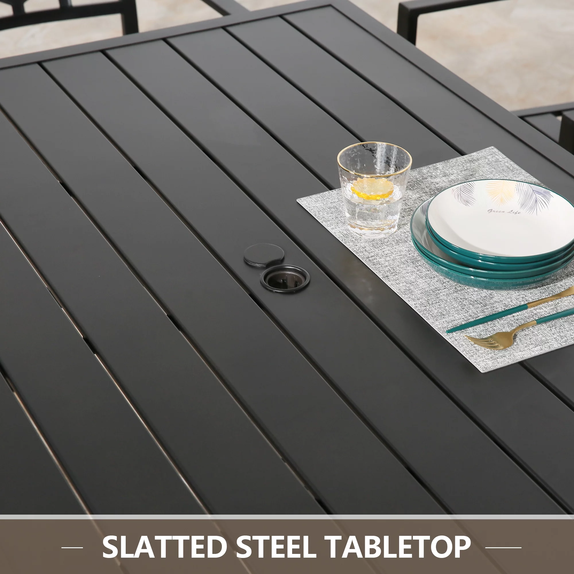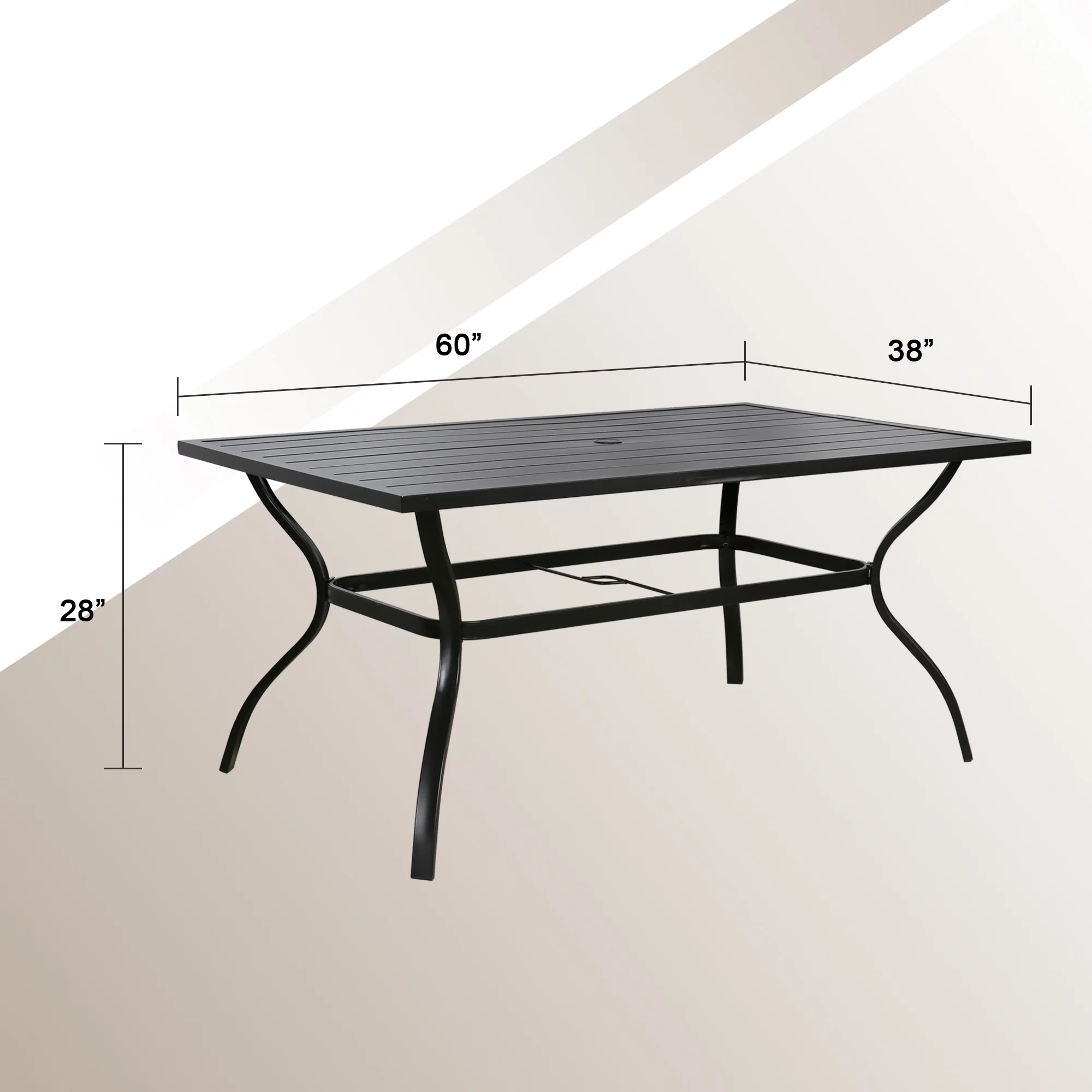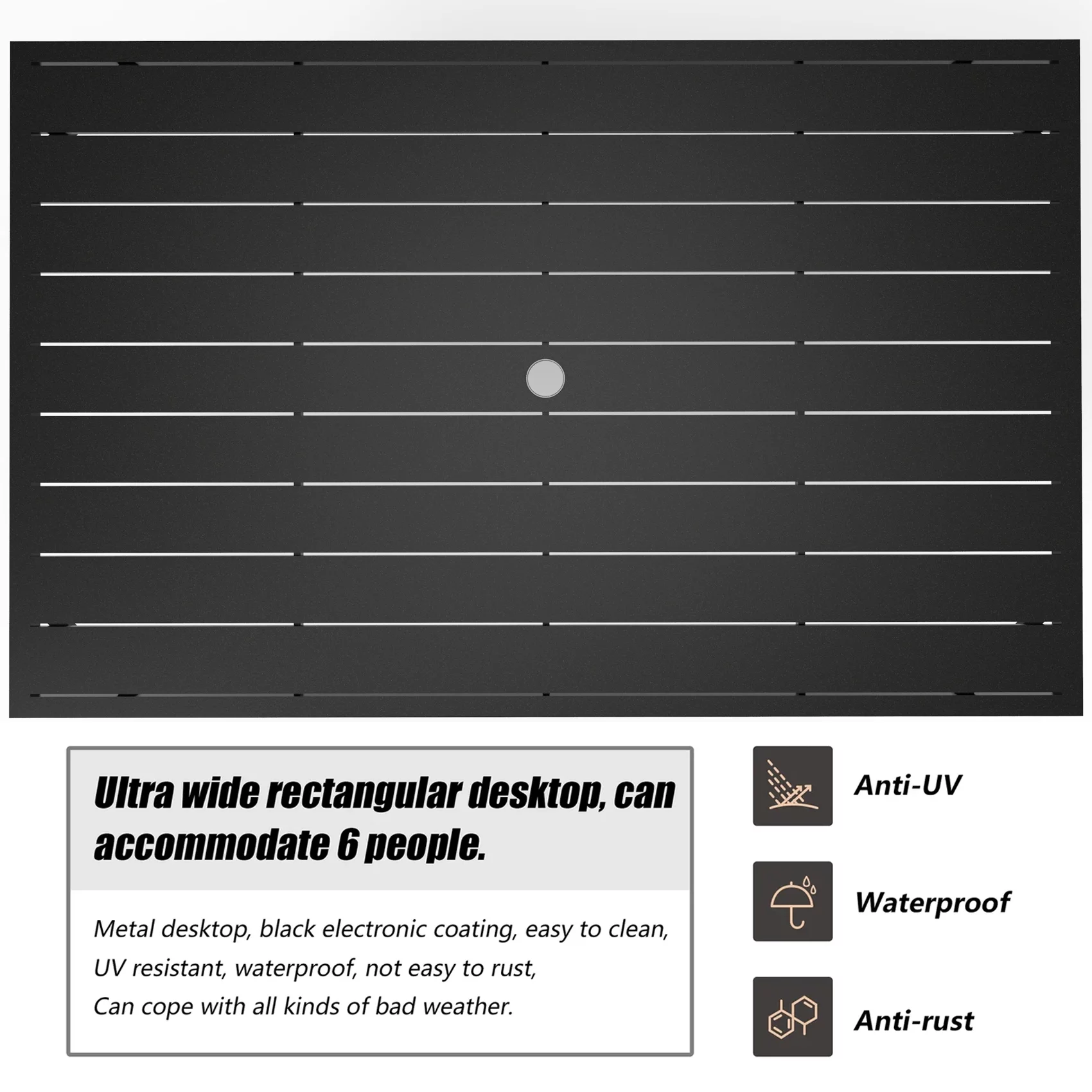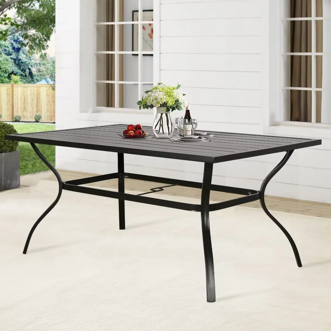 Ulax Furniture Outdoor Patio Table Rectangular Metal Slatted Dining Table with Umbrella Hole, Black