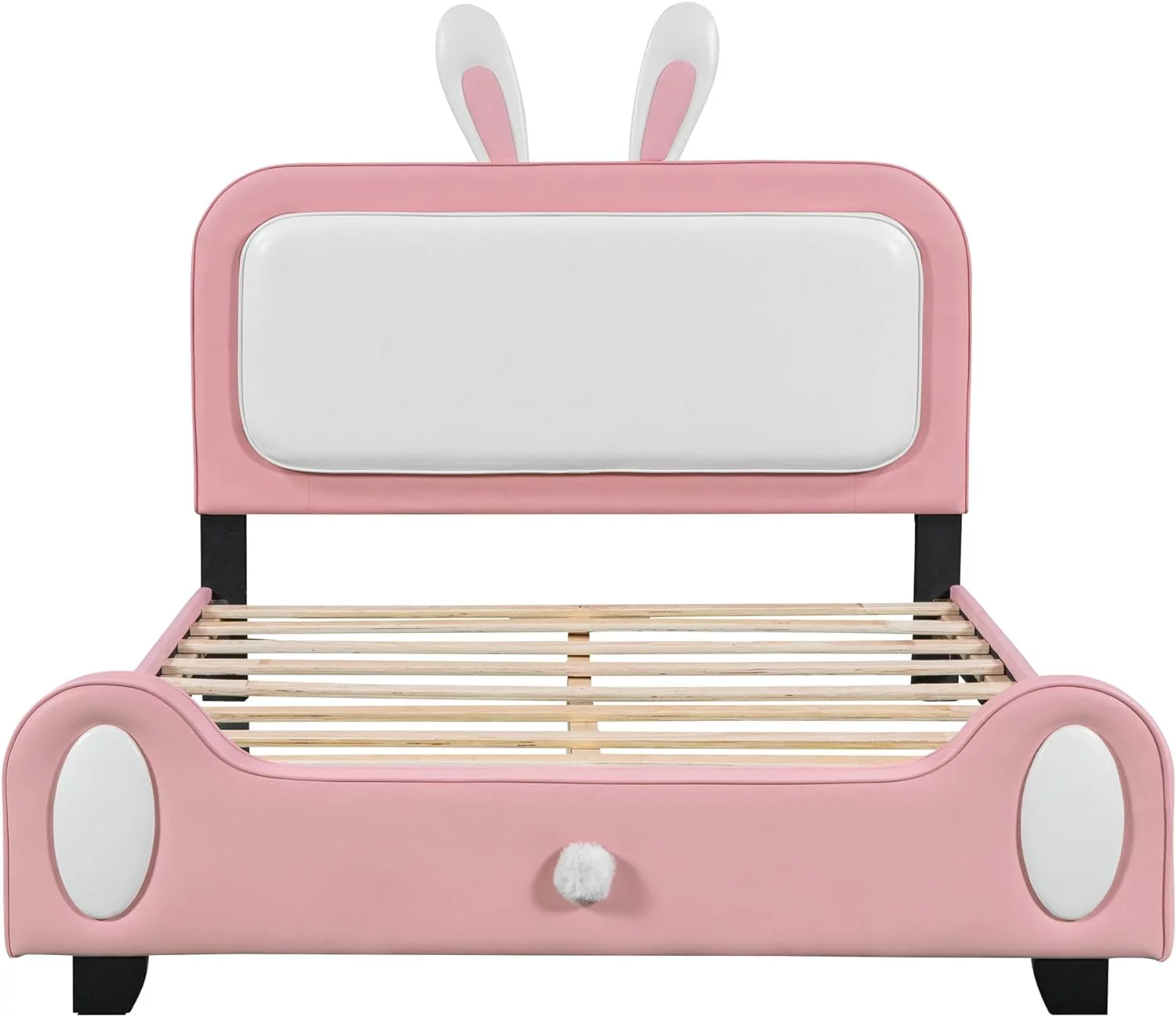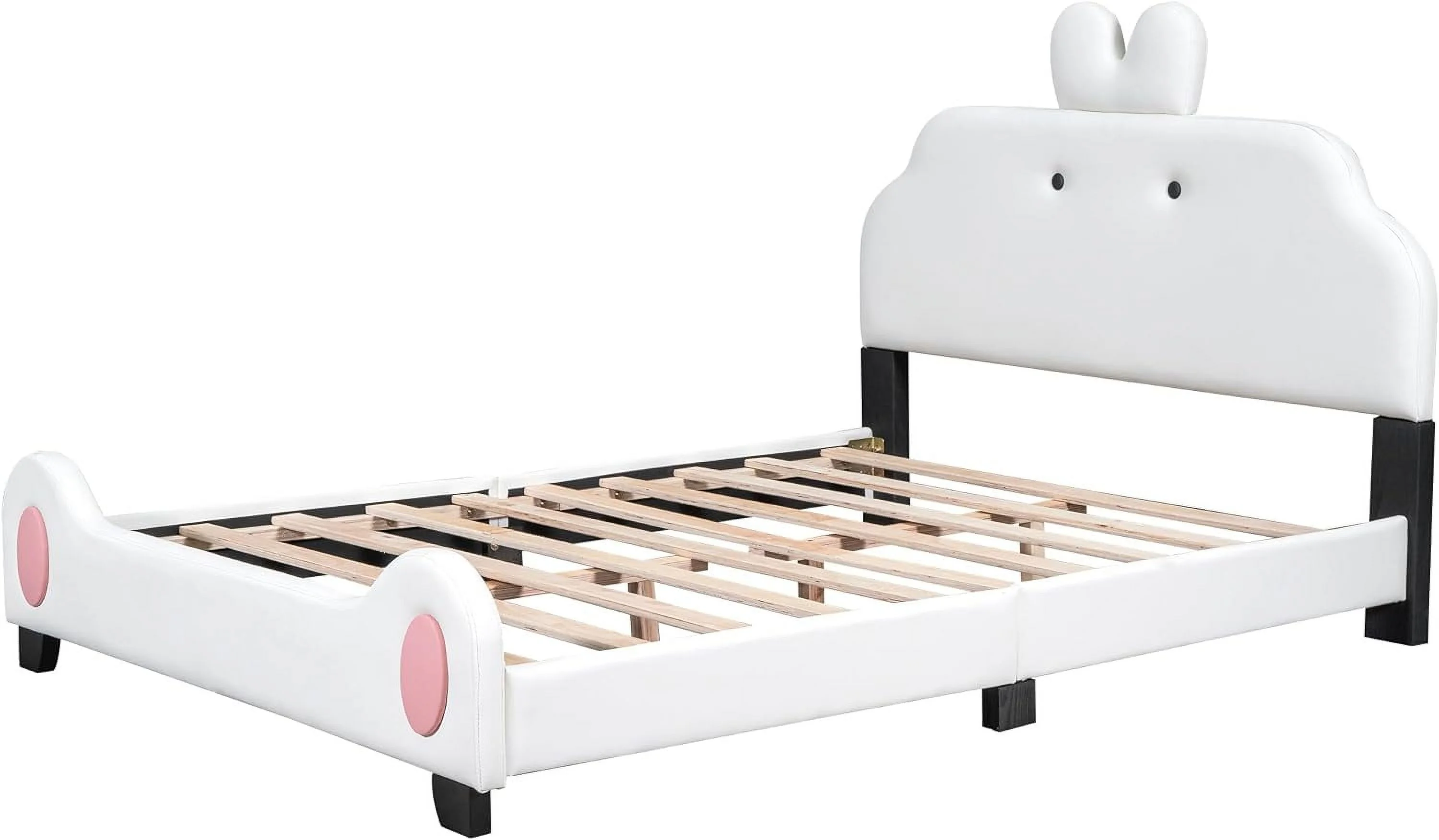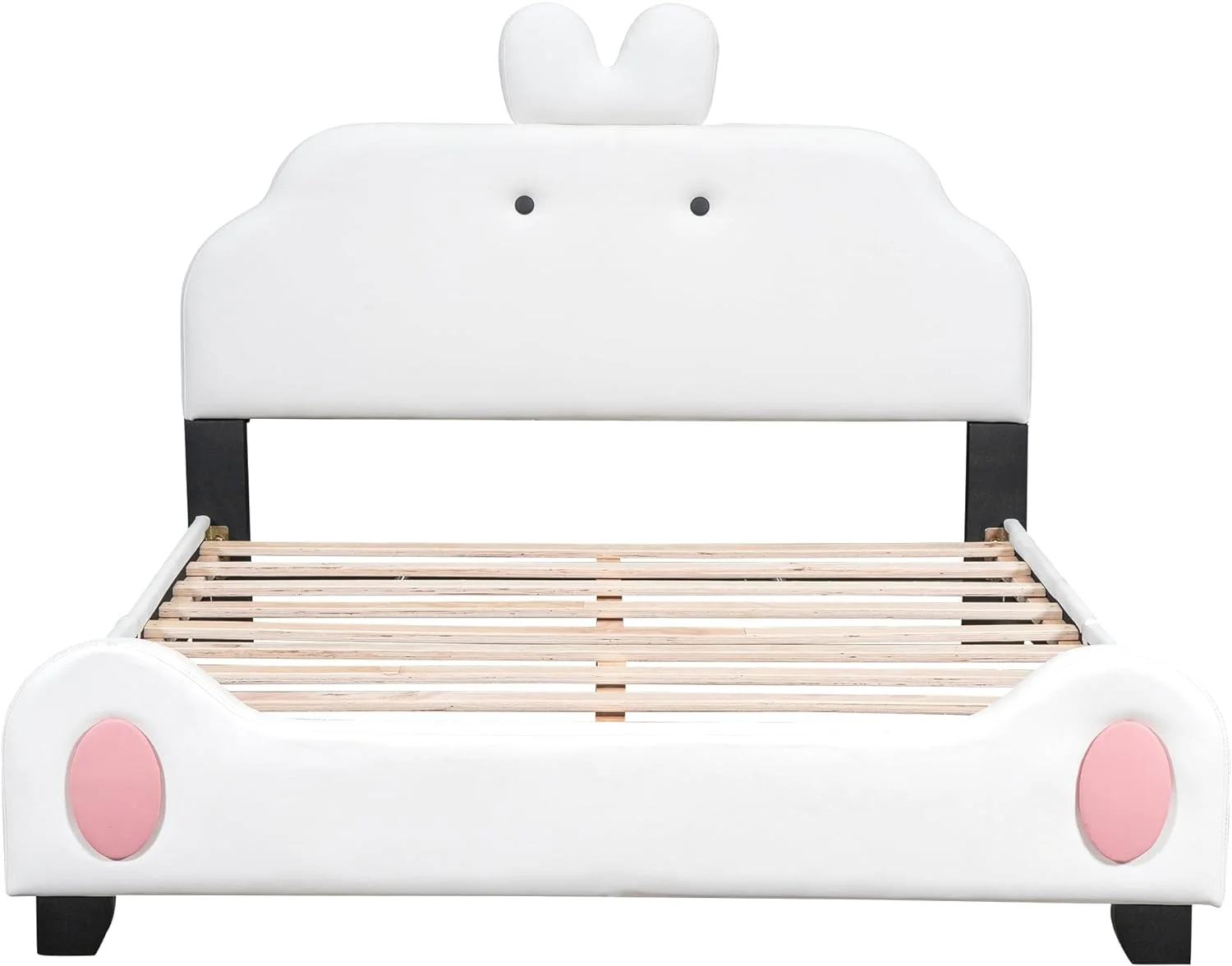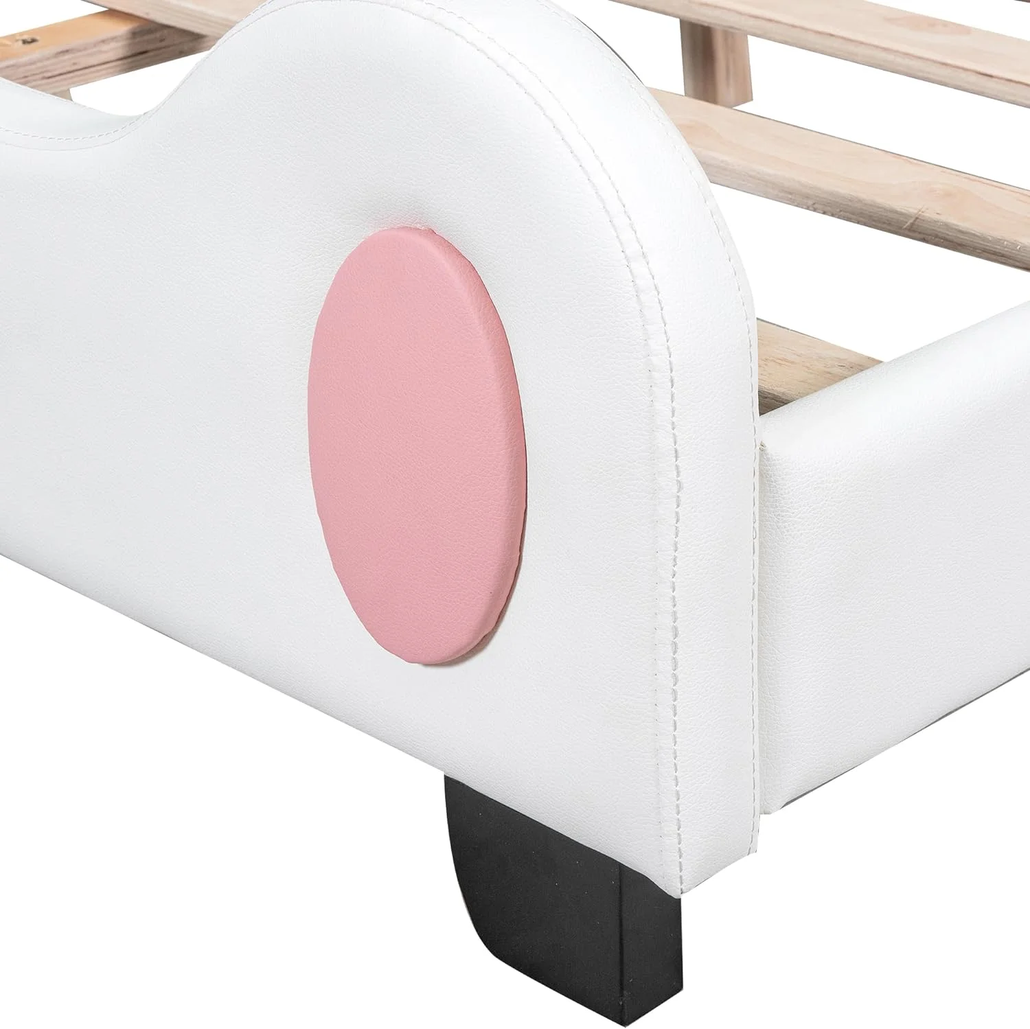 Twin size Upholstered Rabbit-Shape Princess Bed,Cosymart Twin Size Platform Bed with Headboard and Footboard, White+Pink