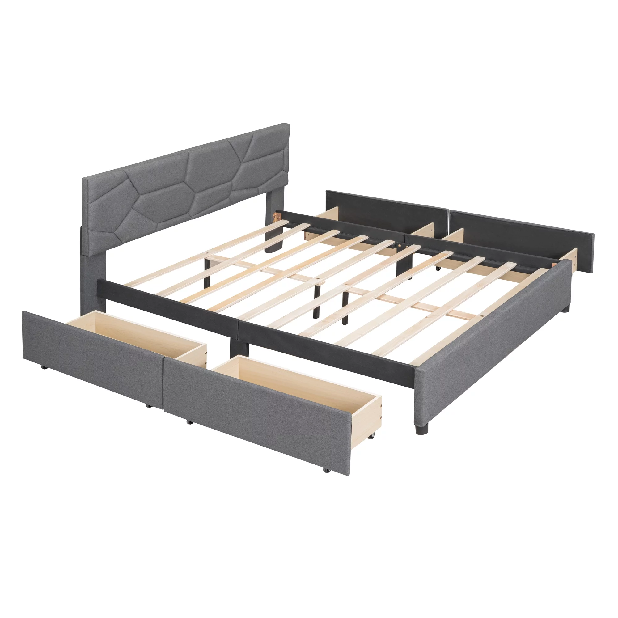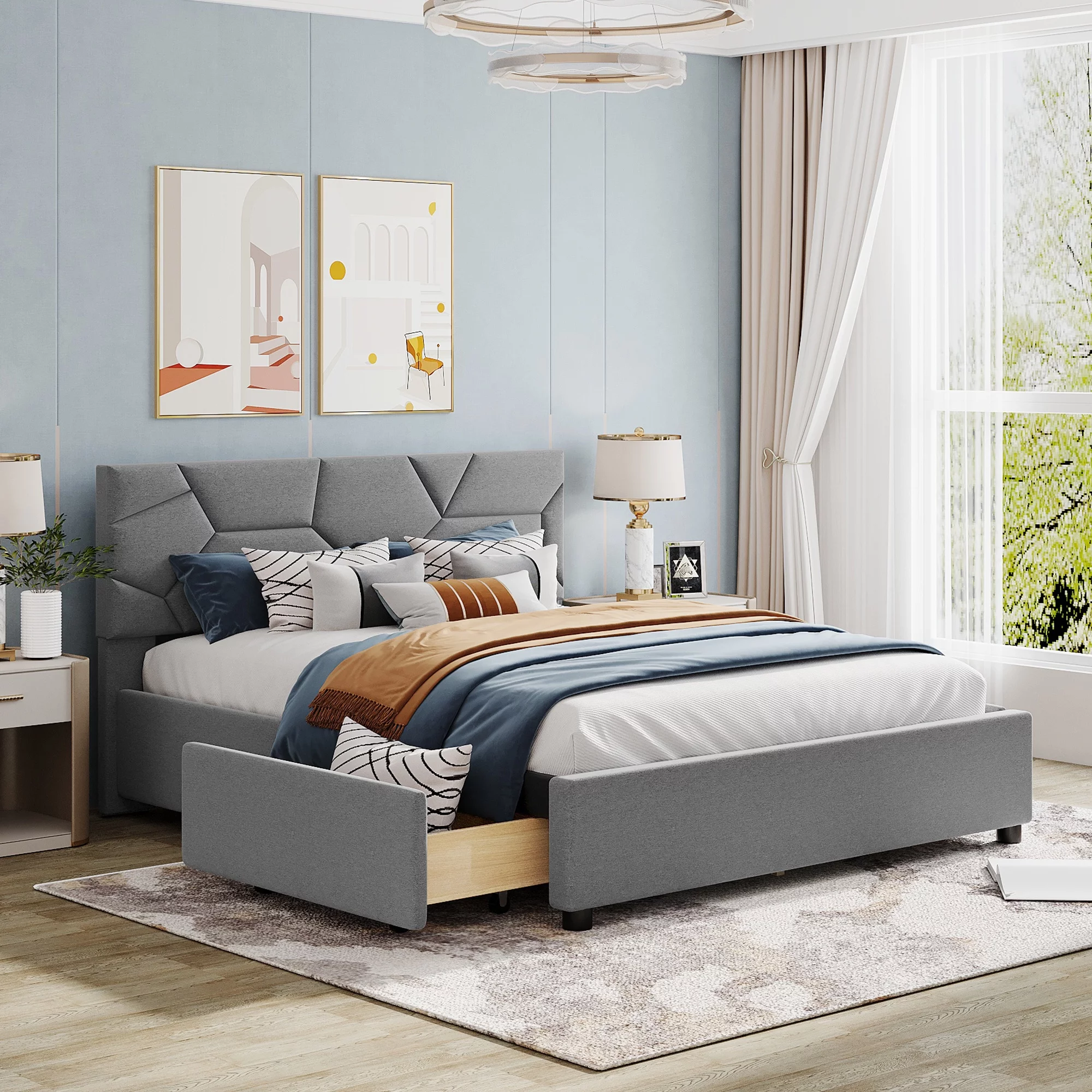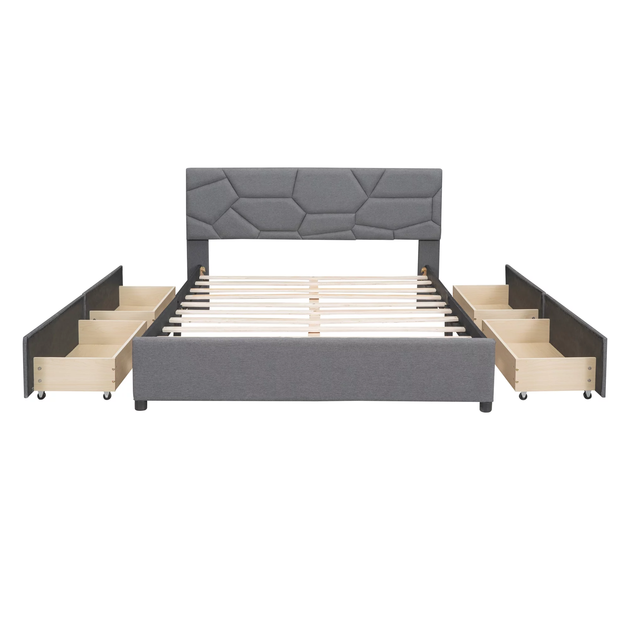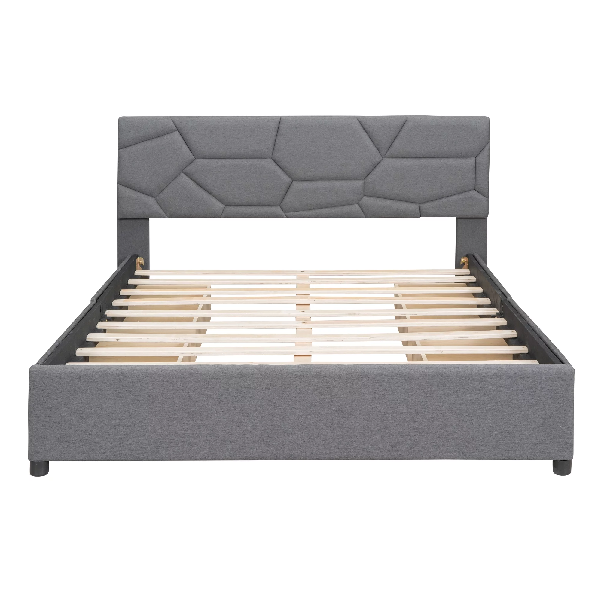 Queen Size Upholstered Platform Bed with Brick Pattern Headboard and 4 Drawers, Linen Fabric, Gray