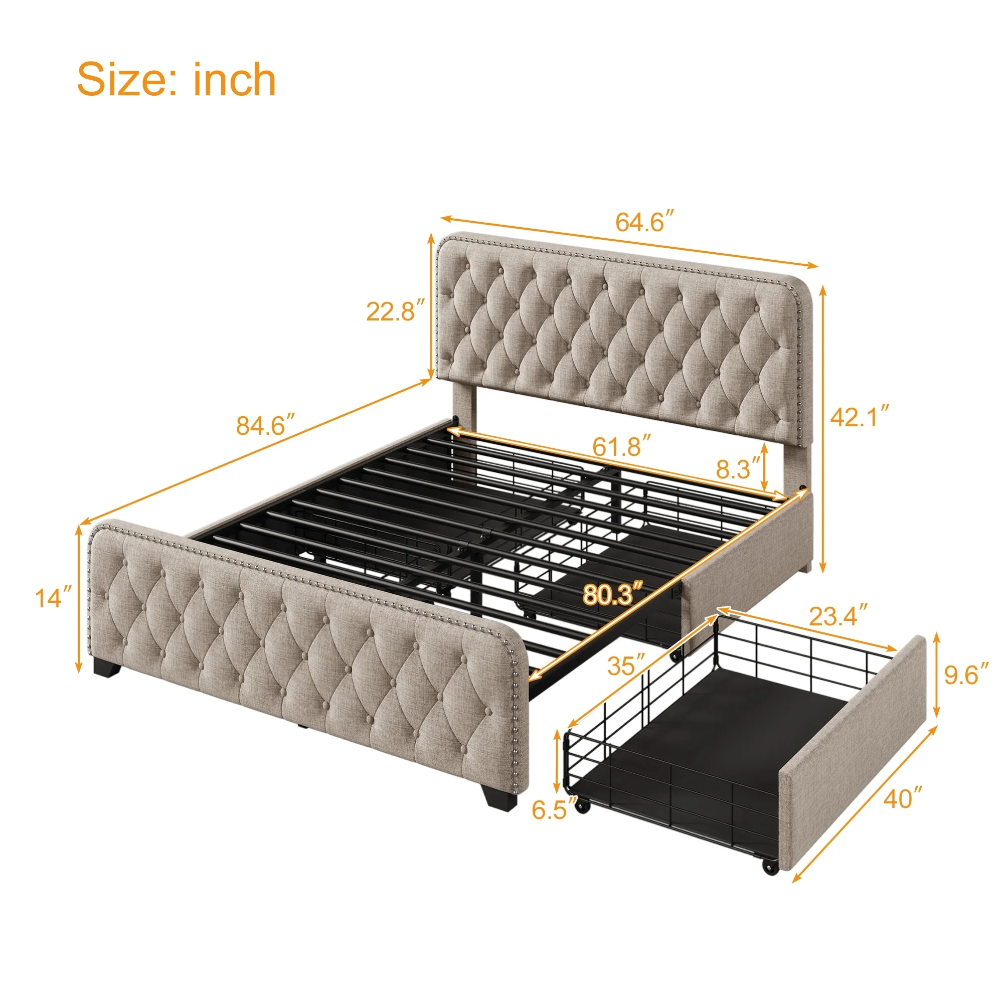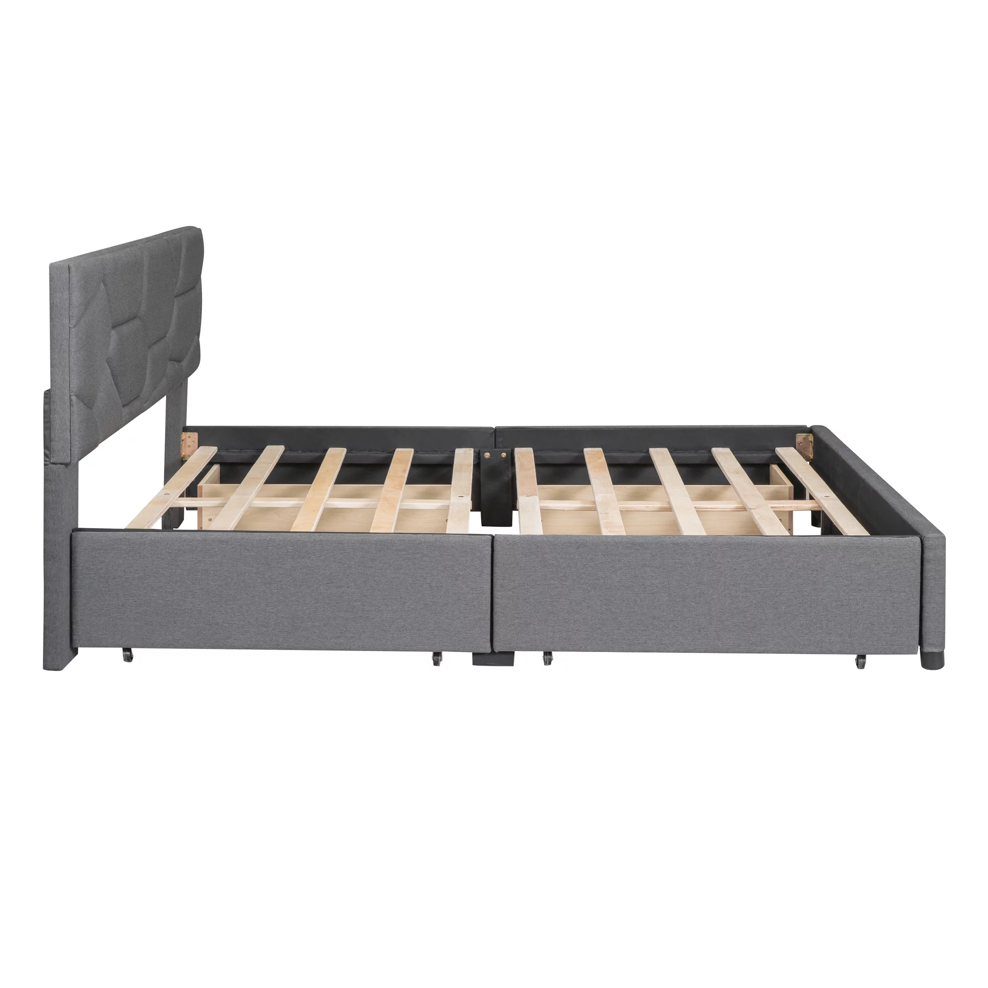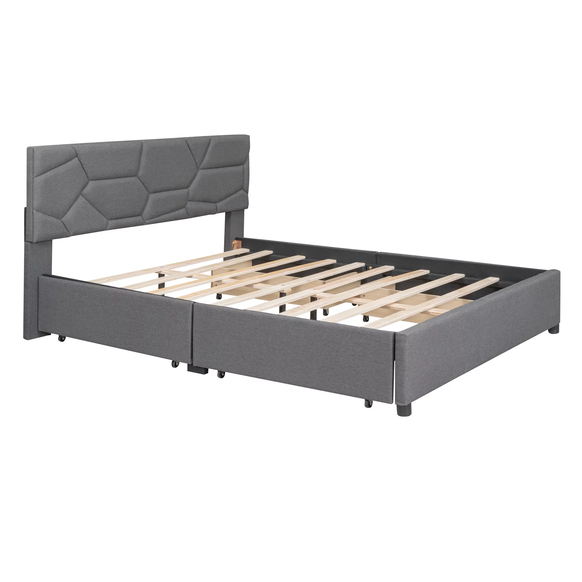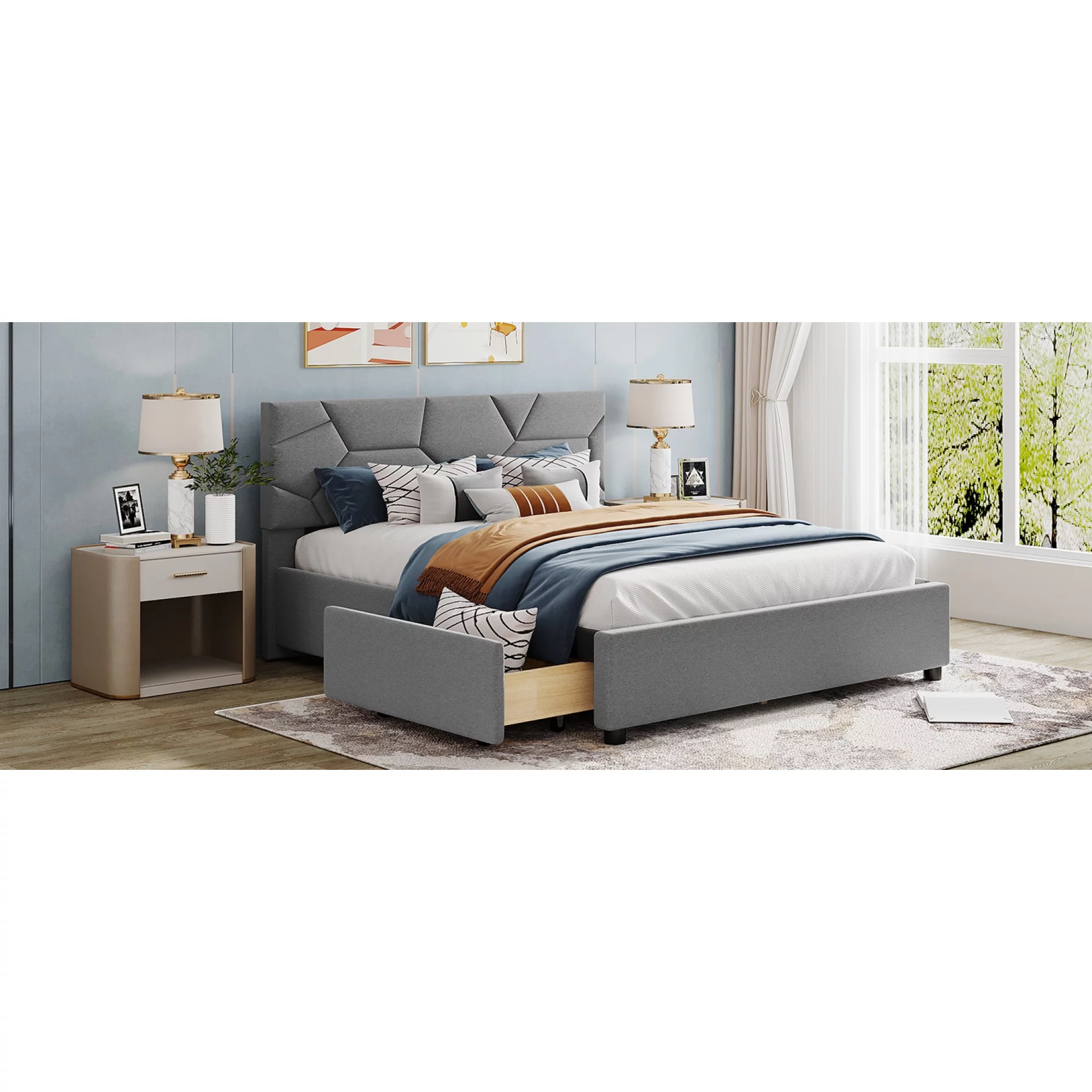 Queen Size Upholstered Platform Bed with Brick Pattern Headboard and 4 Drawers, Linen Fabric, Gray
