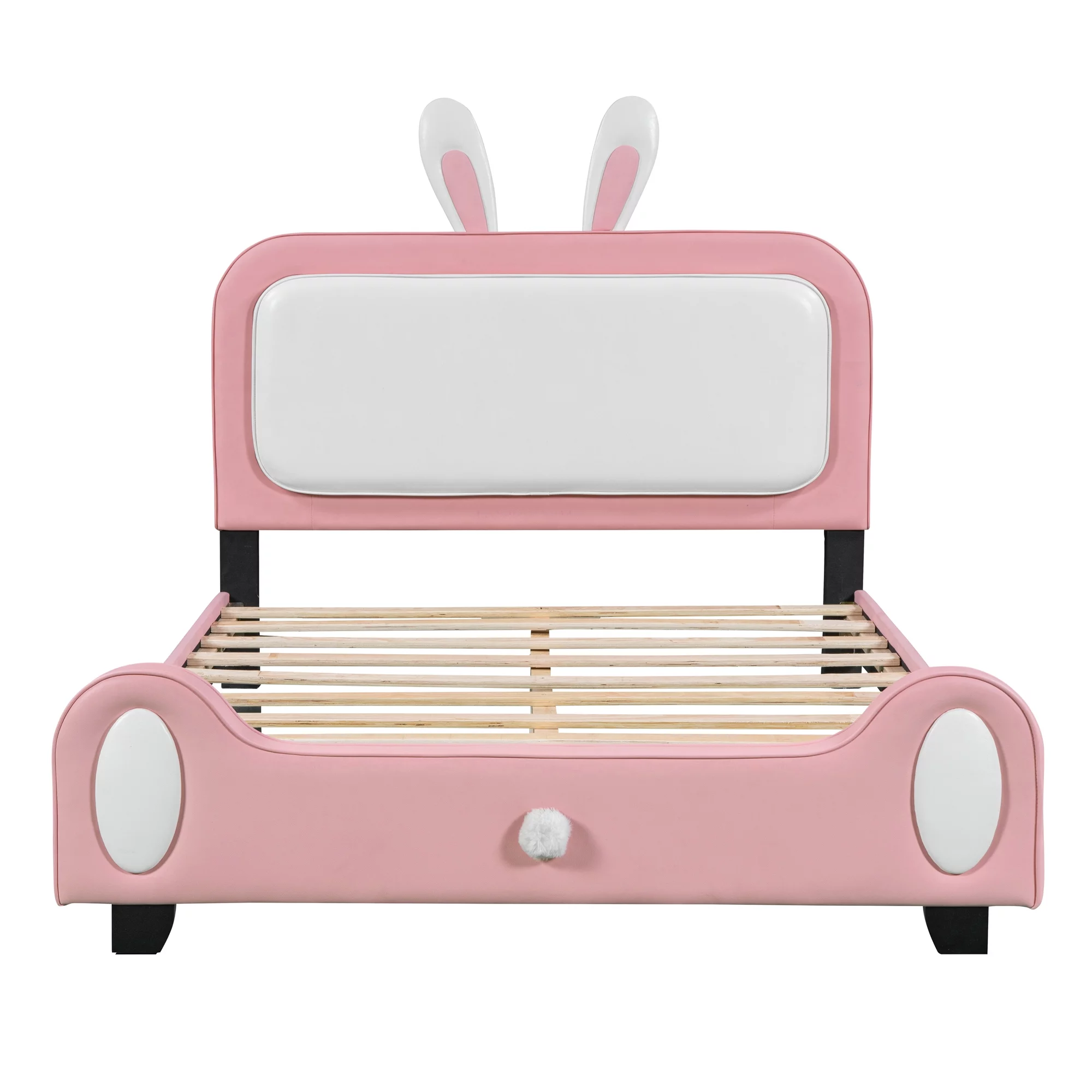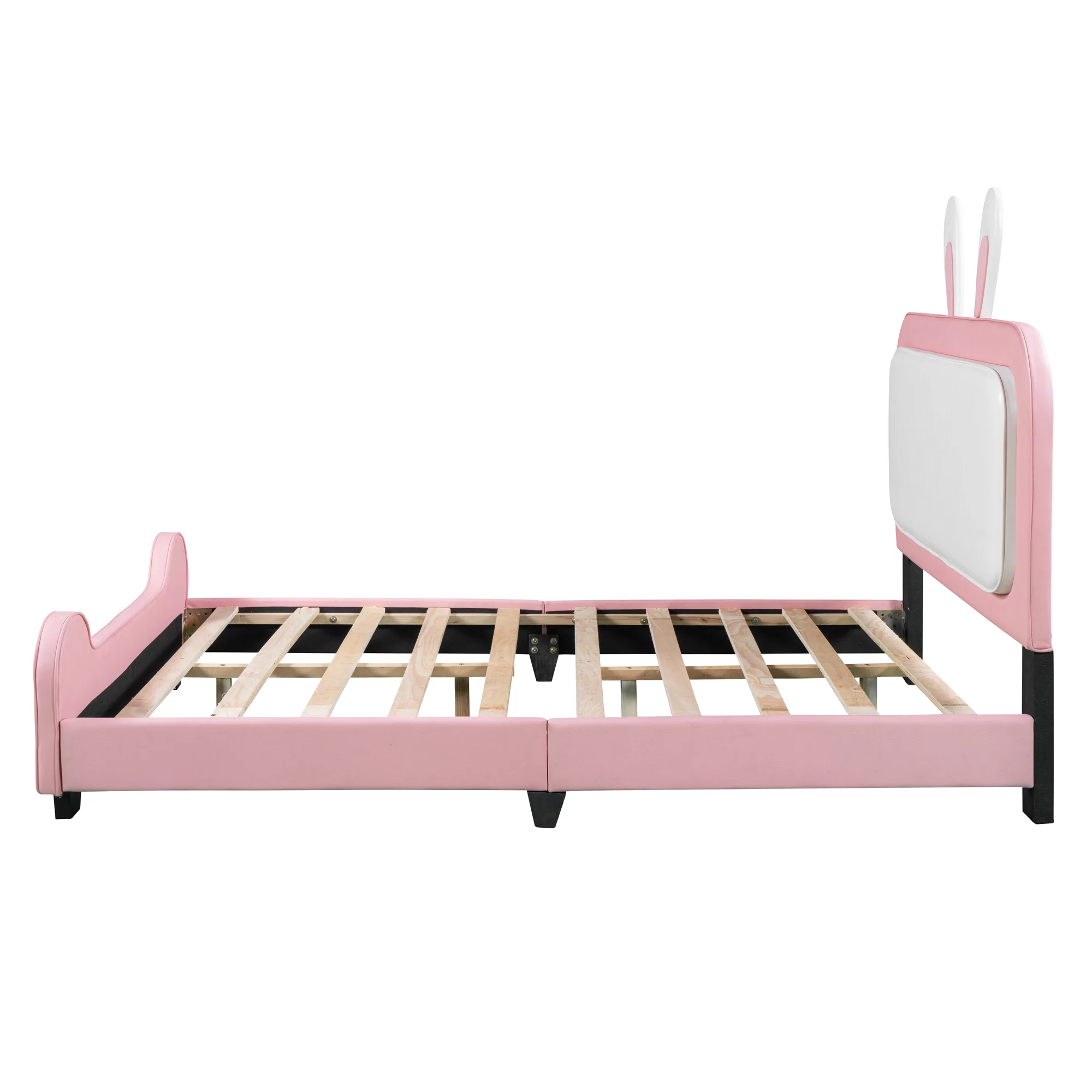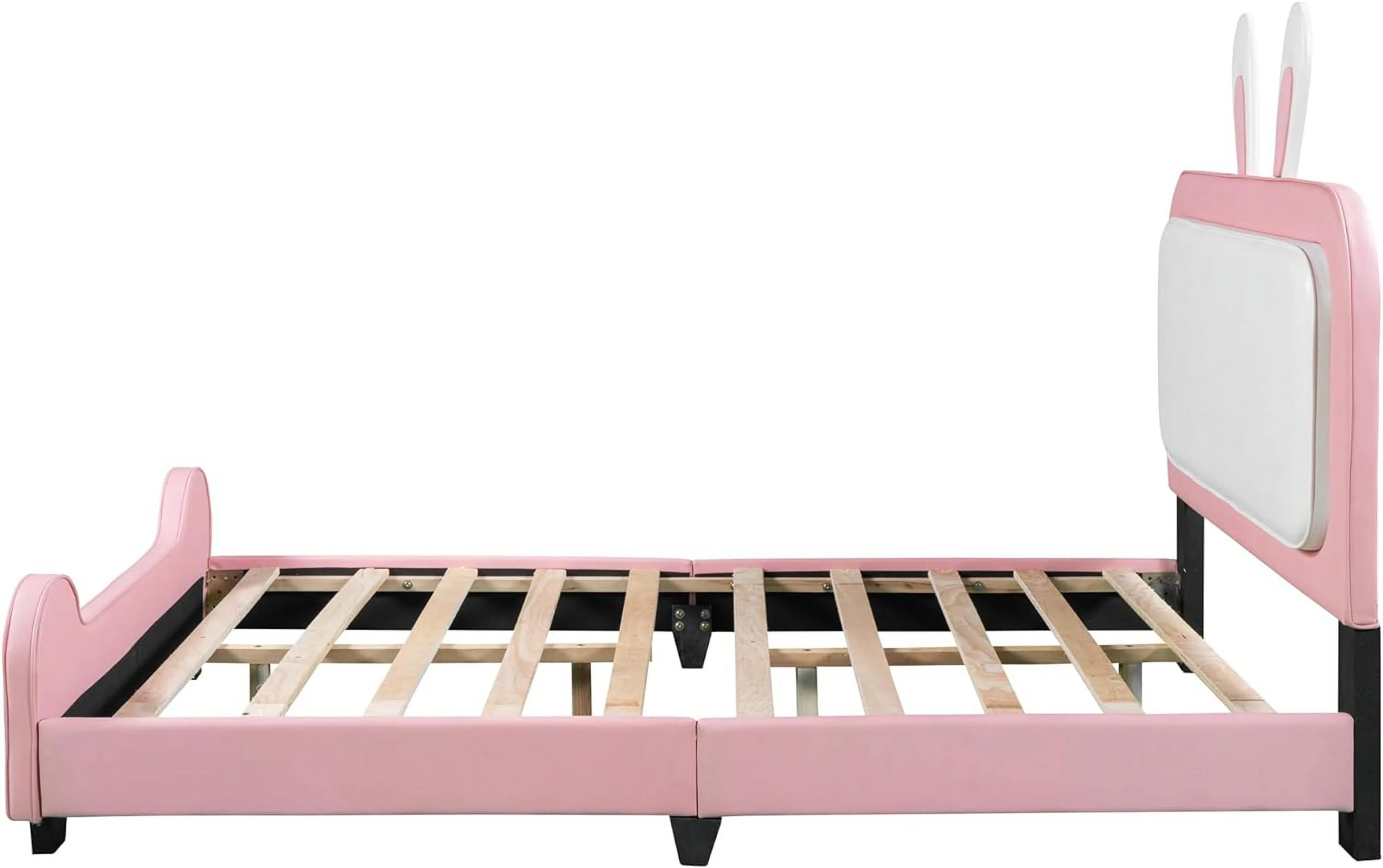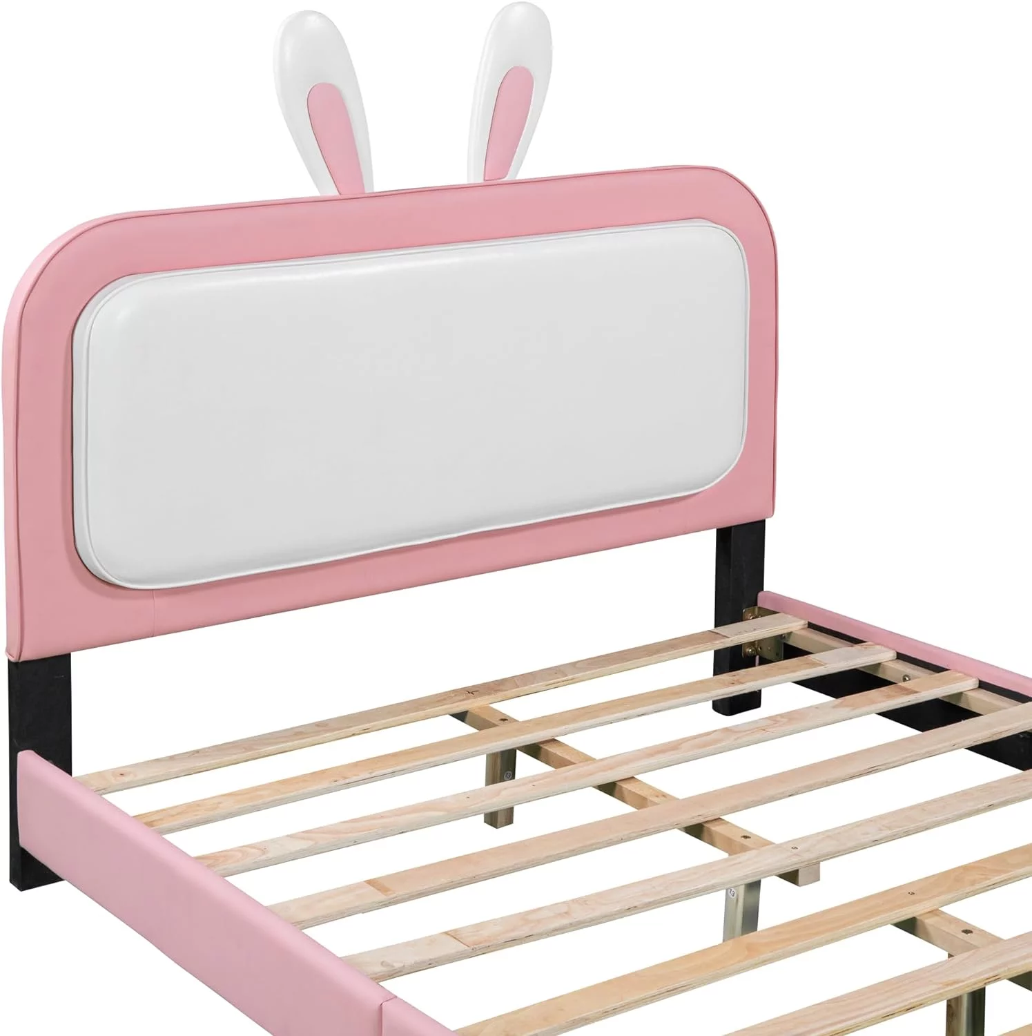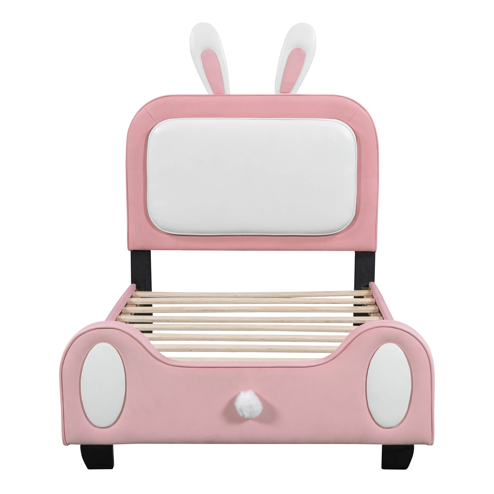 Twin size Upholstered Rabbit-Shape Princess Bed ,Twin Size Platform Bed with Headboard and Footboard,White+Pink