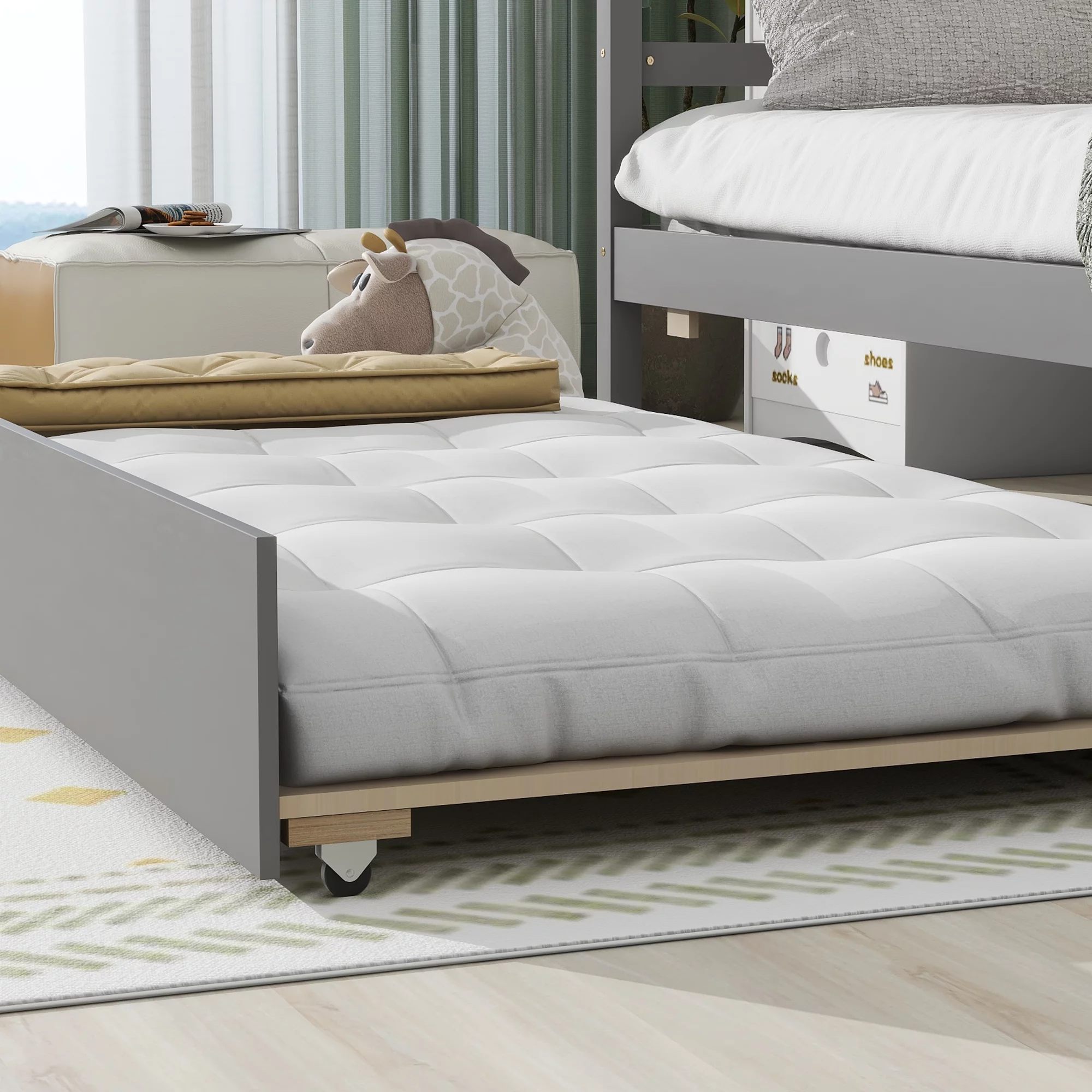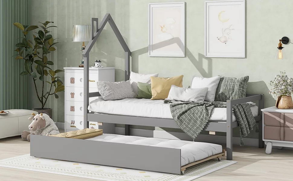 House Bed For Kids With House-Shaped Headboard, Wood Size Platform Bed With Trundle,Cute Daybed Frame For Boys Girls, Grey