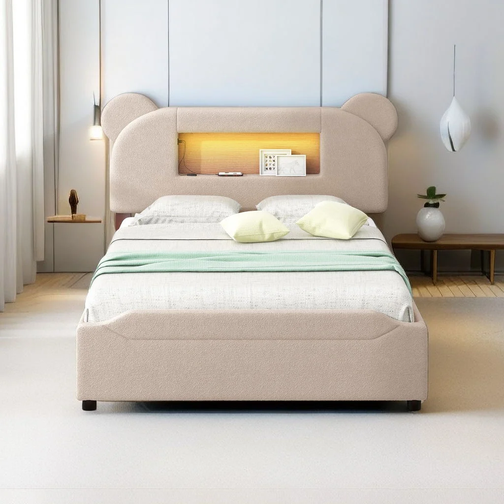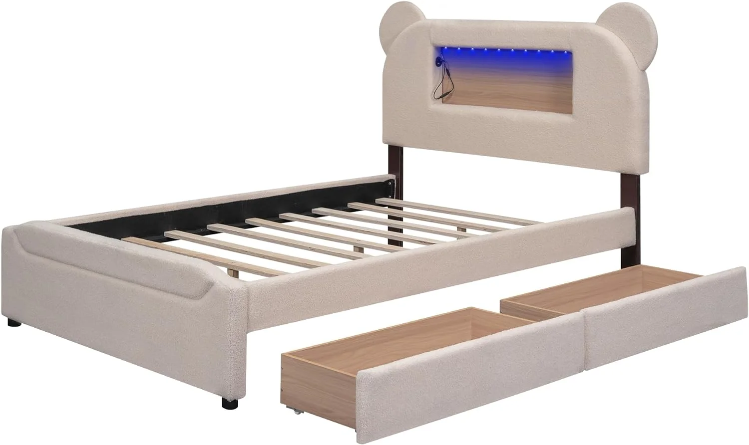 Full Size PU Leather Upholstered Platform Bed With Cartoo Headboard & Footboard For Boys & Girls, White+Pik