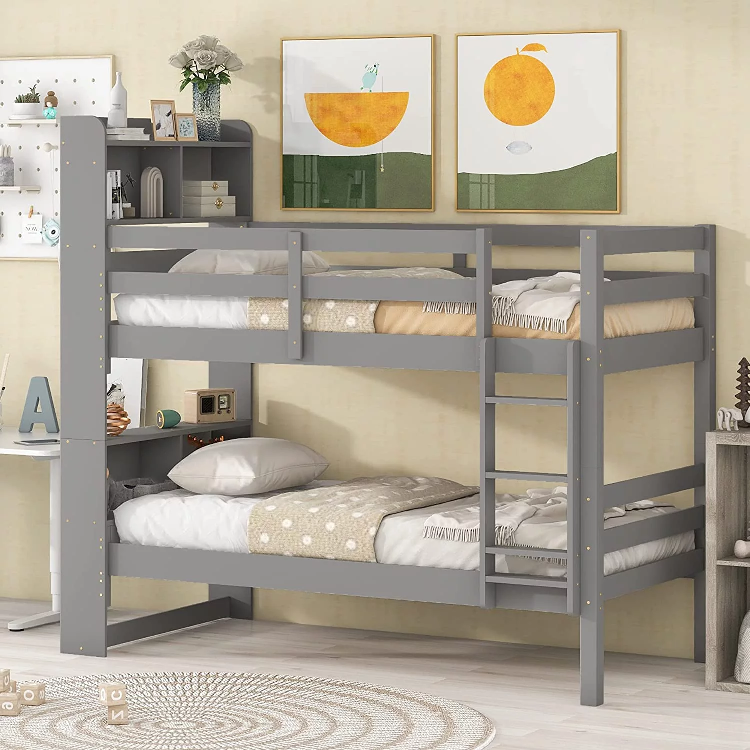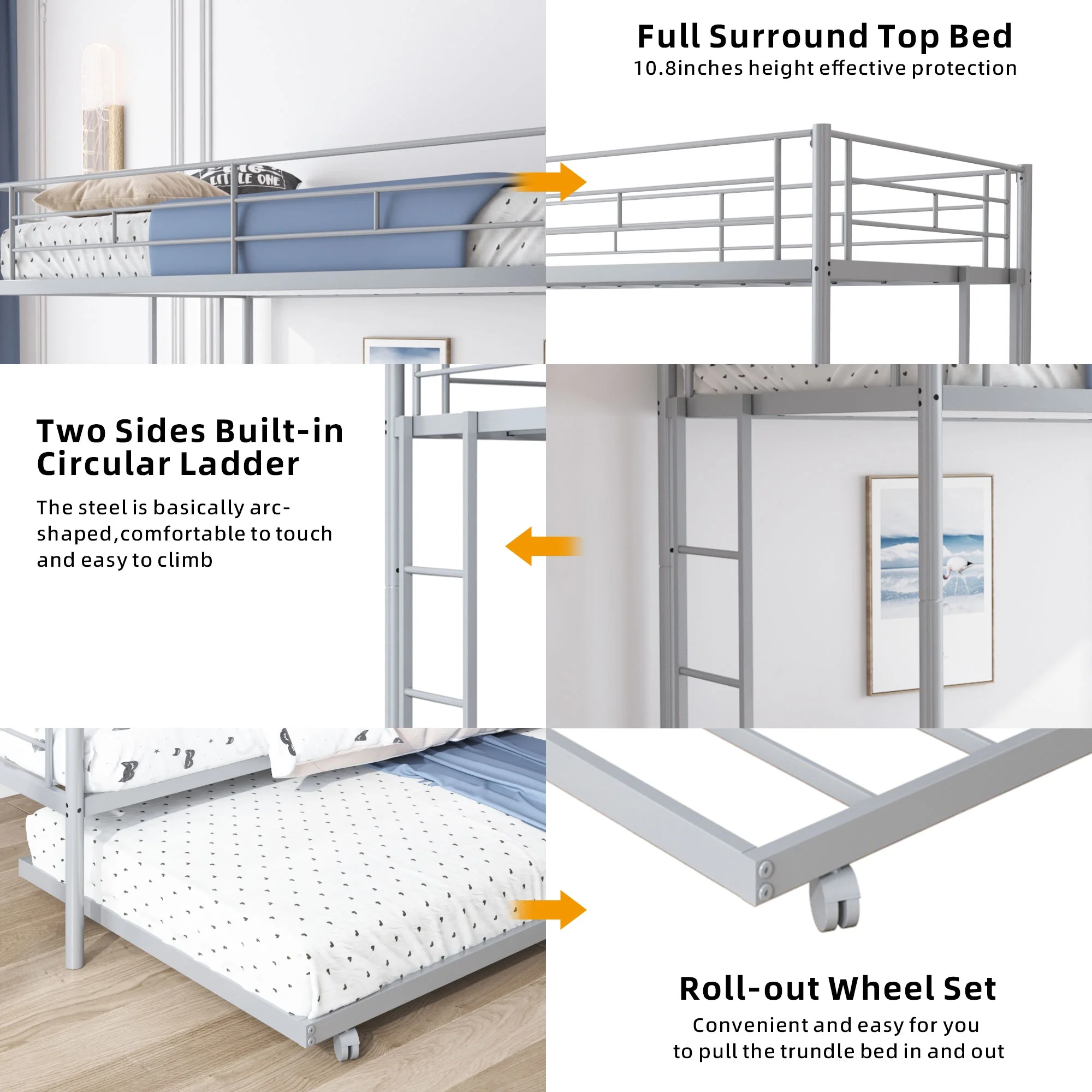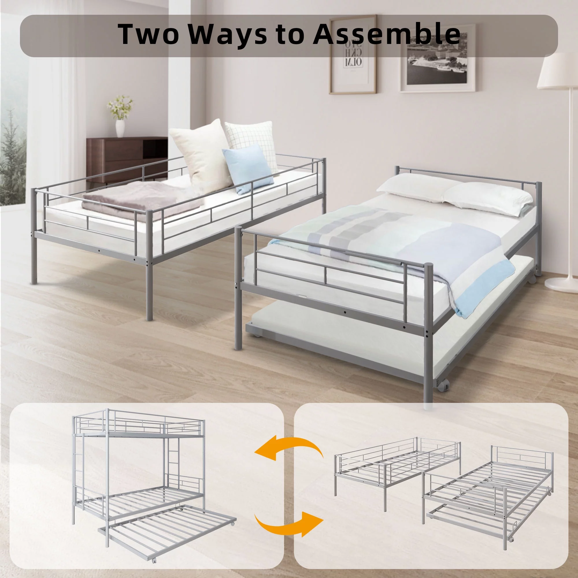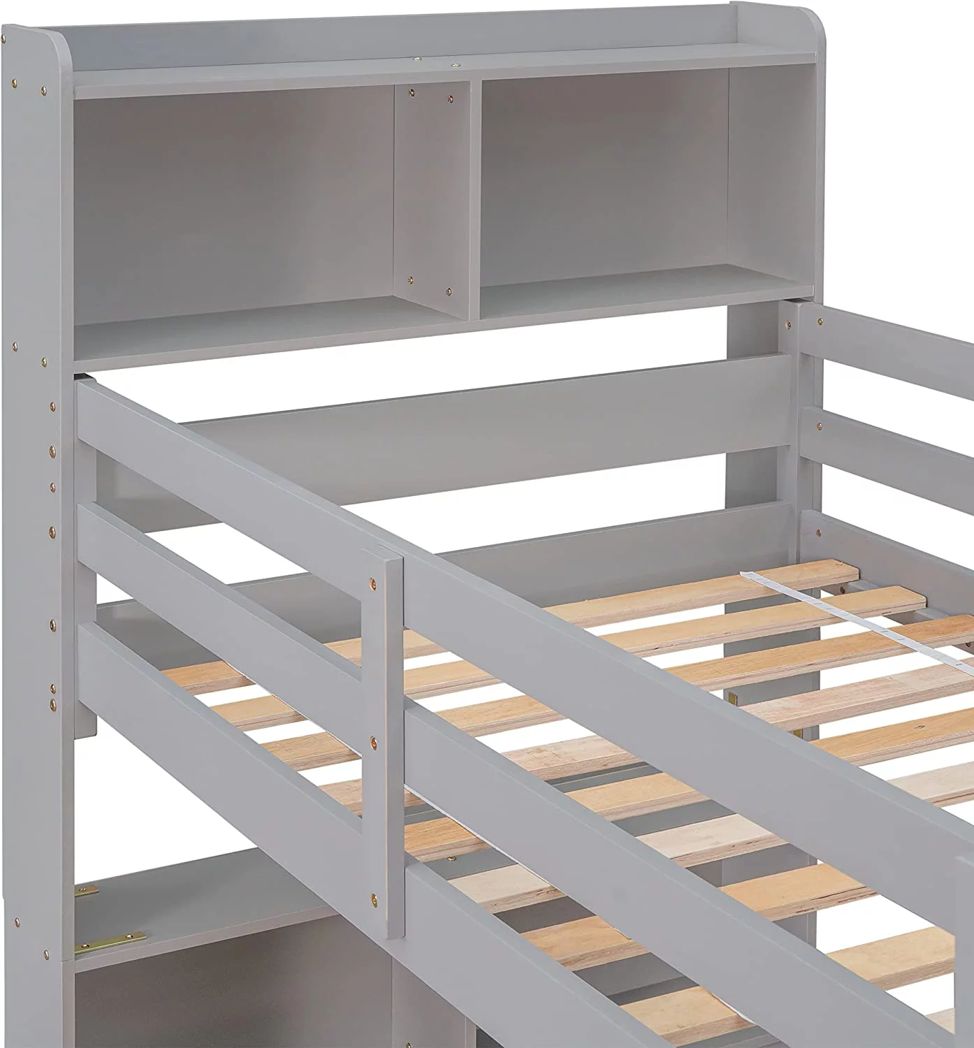 Over Bunk Bed With Trundle, Convertible Into 2 Beds,The Bunk Bed With Ladder And Safety Rails, Grey