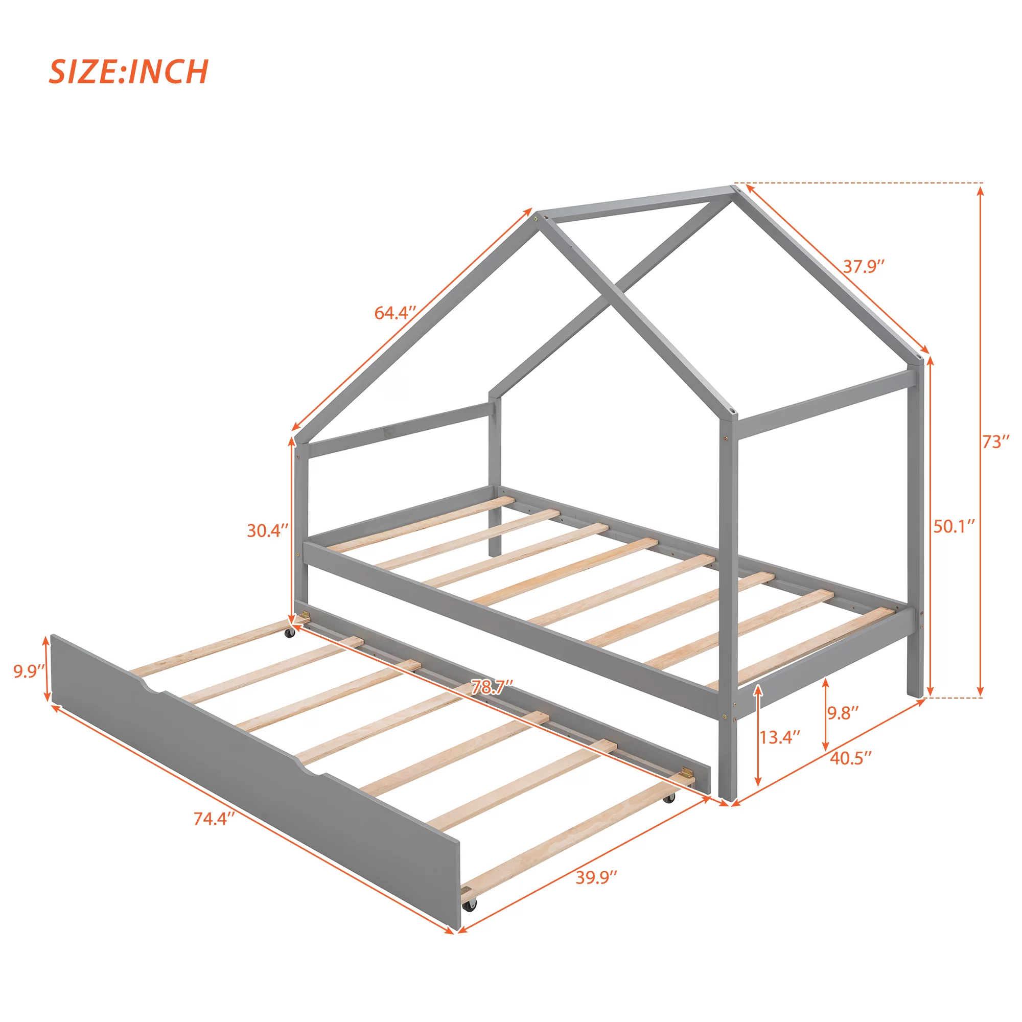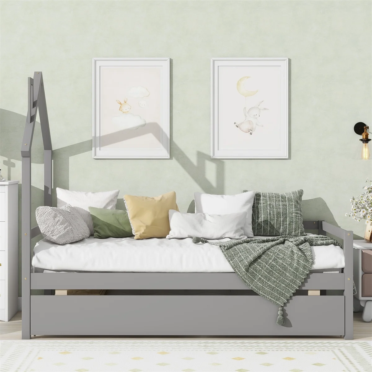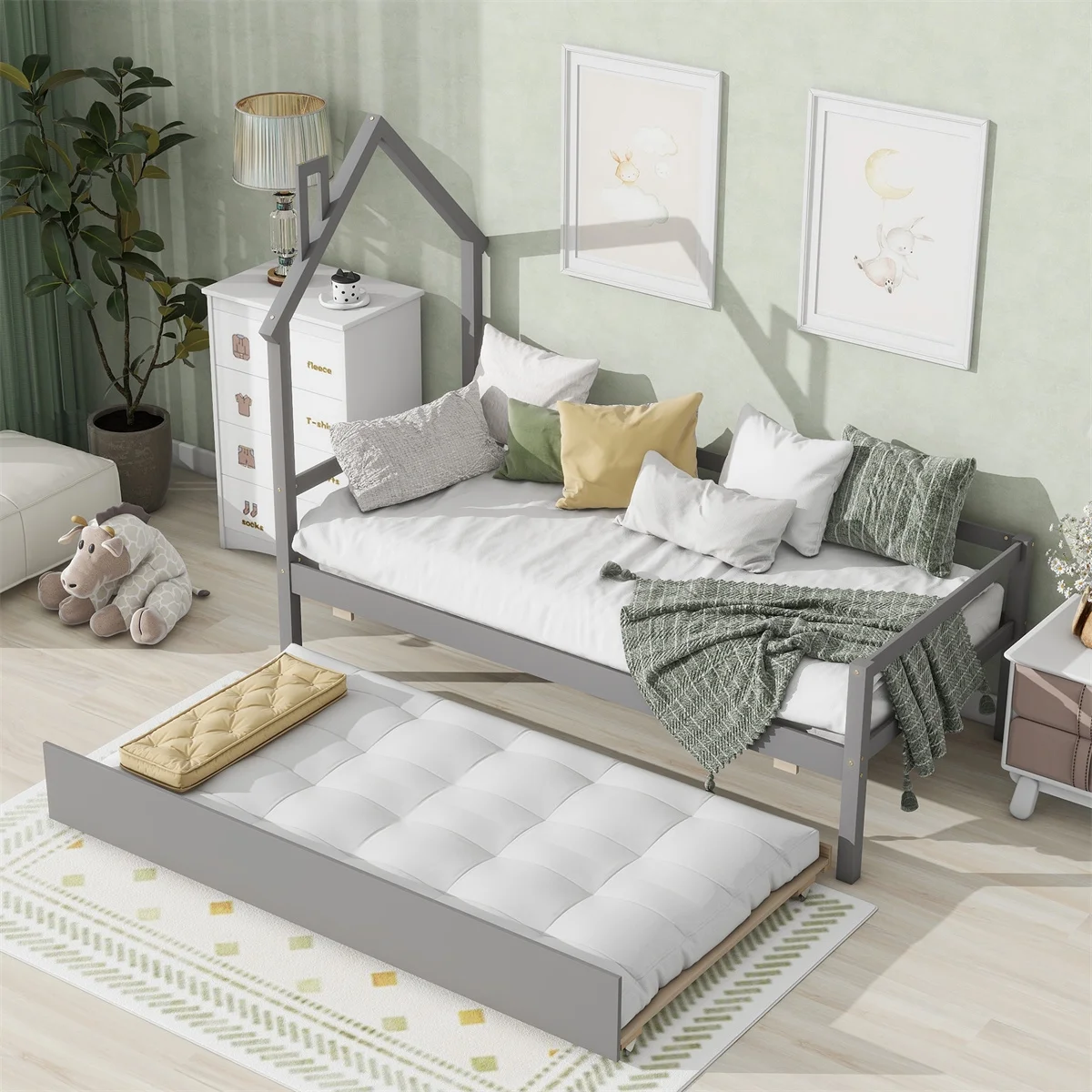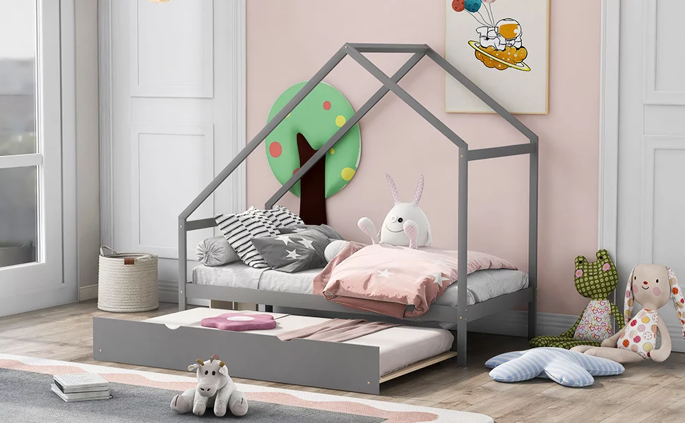 Twin House Wooden Daybed with Trundle, Twin House-Shaped Headboard Bed with Guardrails,Gray