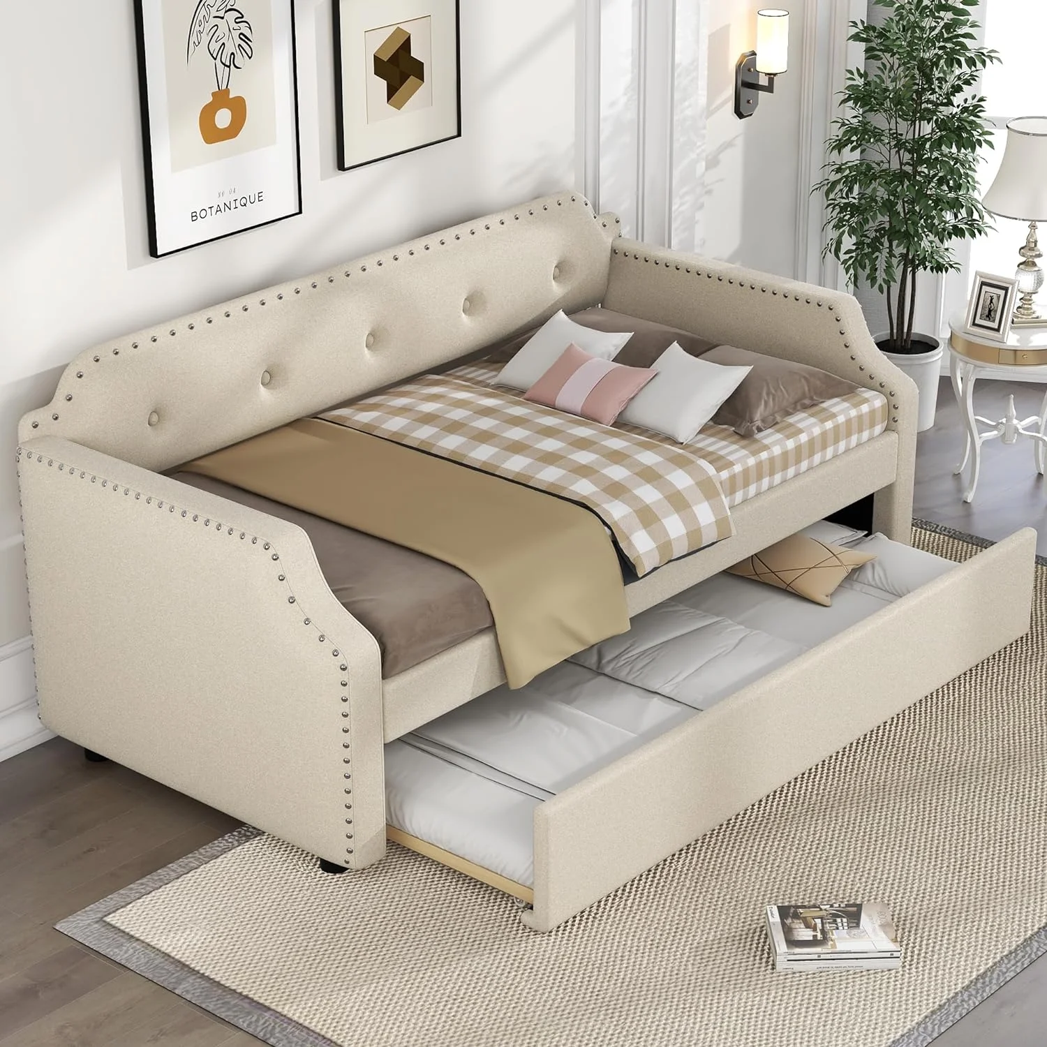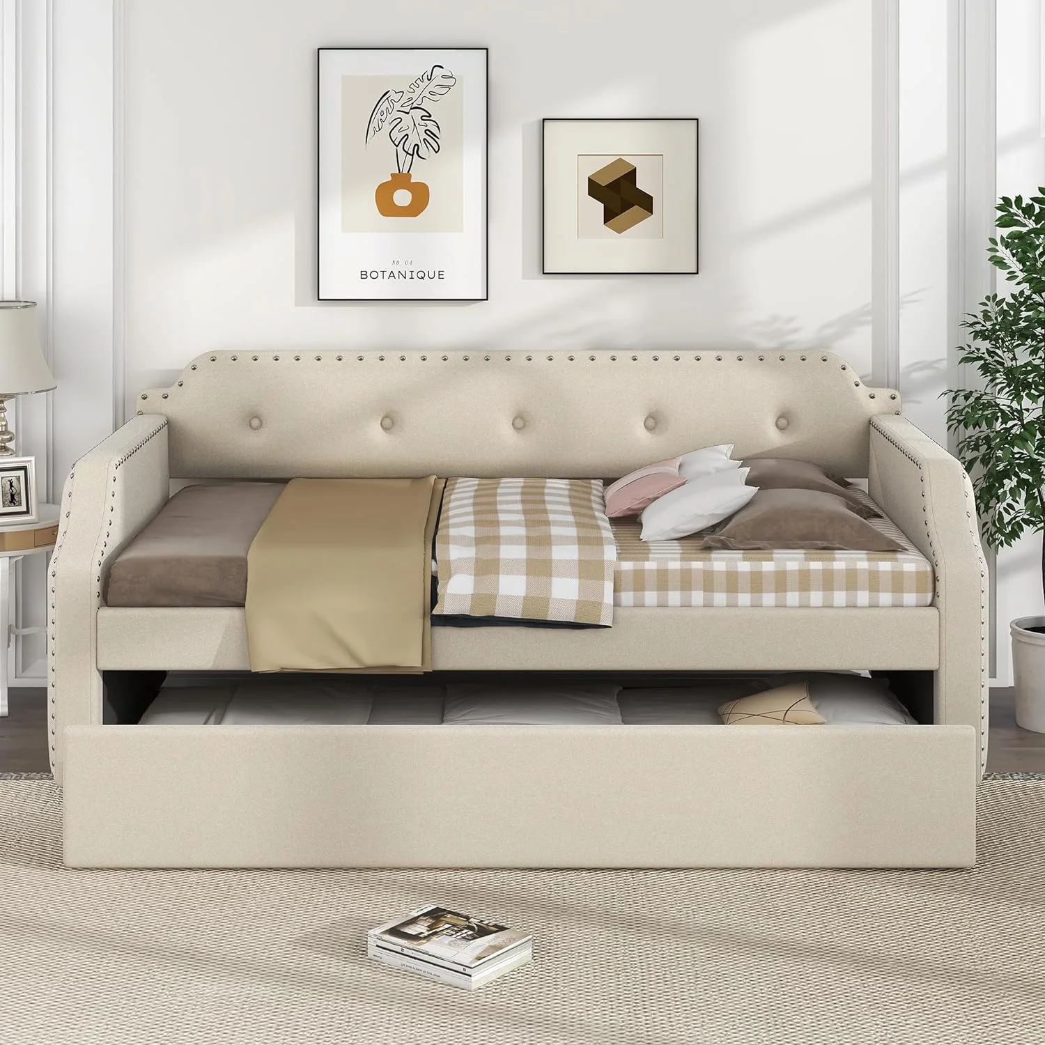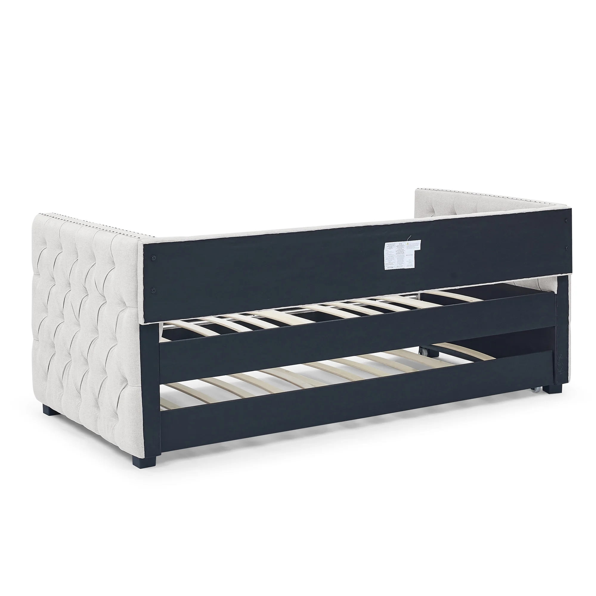 Full Size Upholstered Tufted Daybed Bed with Twin Size Trundle, Beige