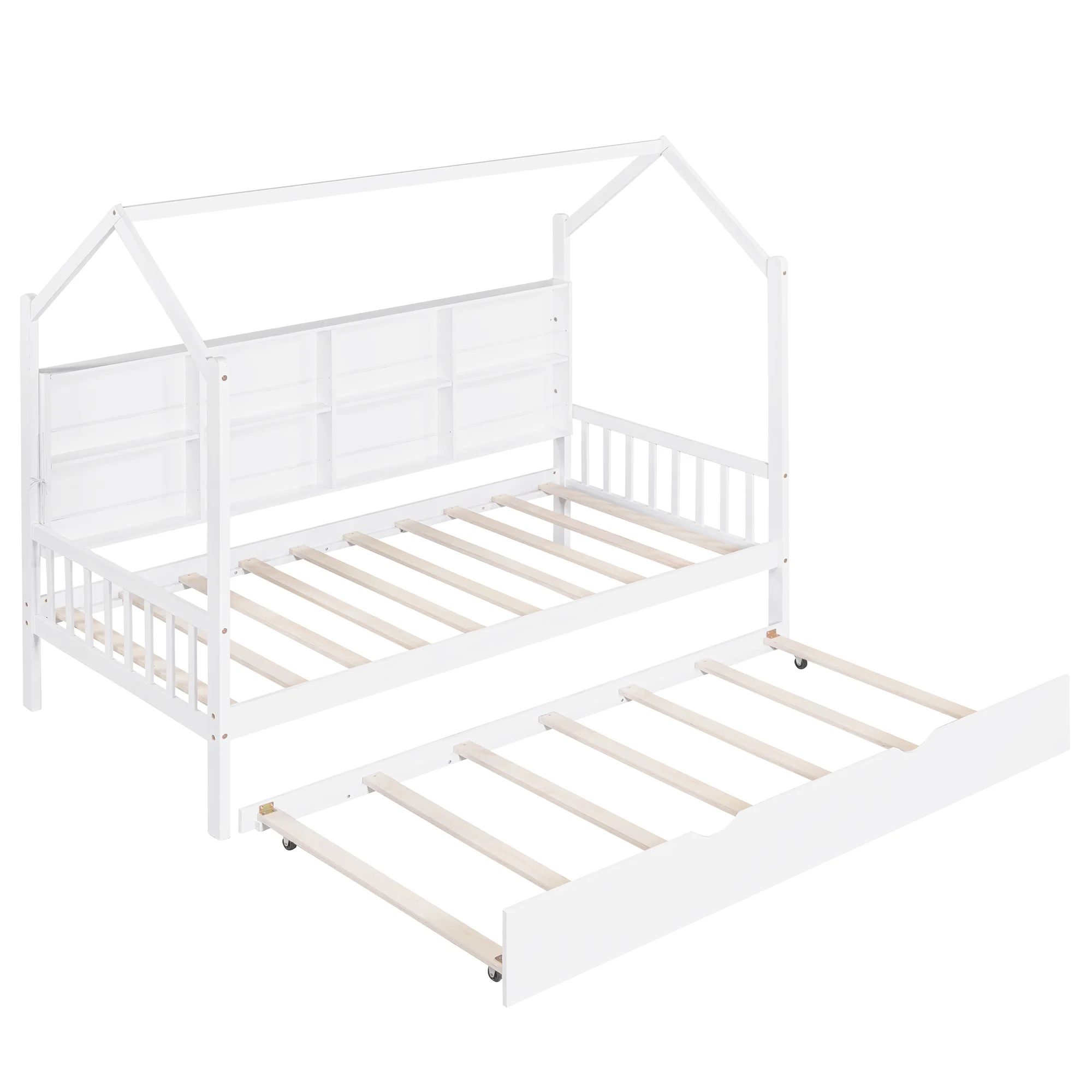 LYPER Wooden Twin Size House Bed with Trundle,Kids Bed with Shelf, White