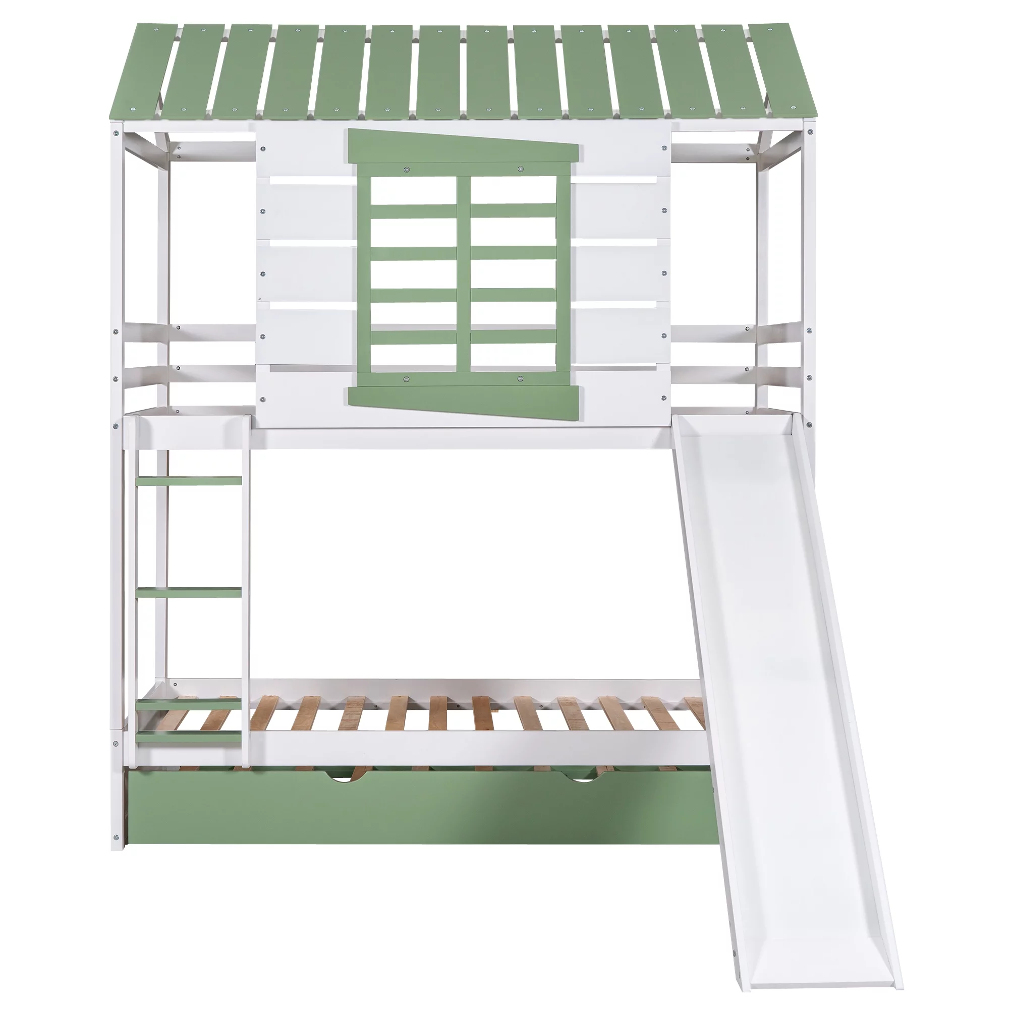 Twin over Twin Size House Bunk Bed with Convertible Slide and Trundle, White+Green