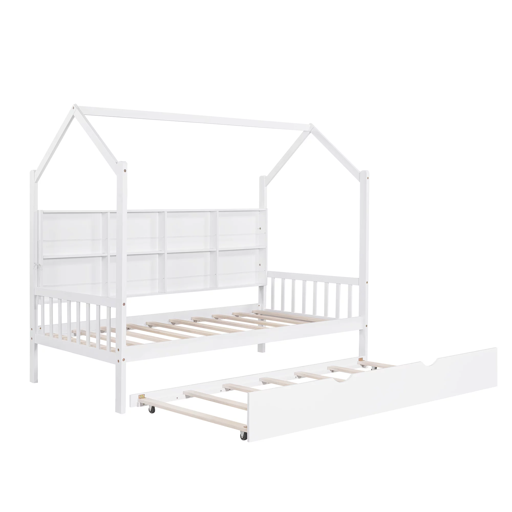 CoSoTower Wooden Twin Size House Bed with Trundle, Kids Bed with Shelf, White