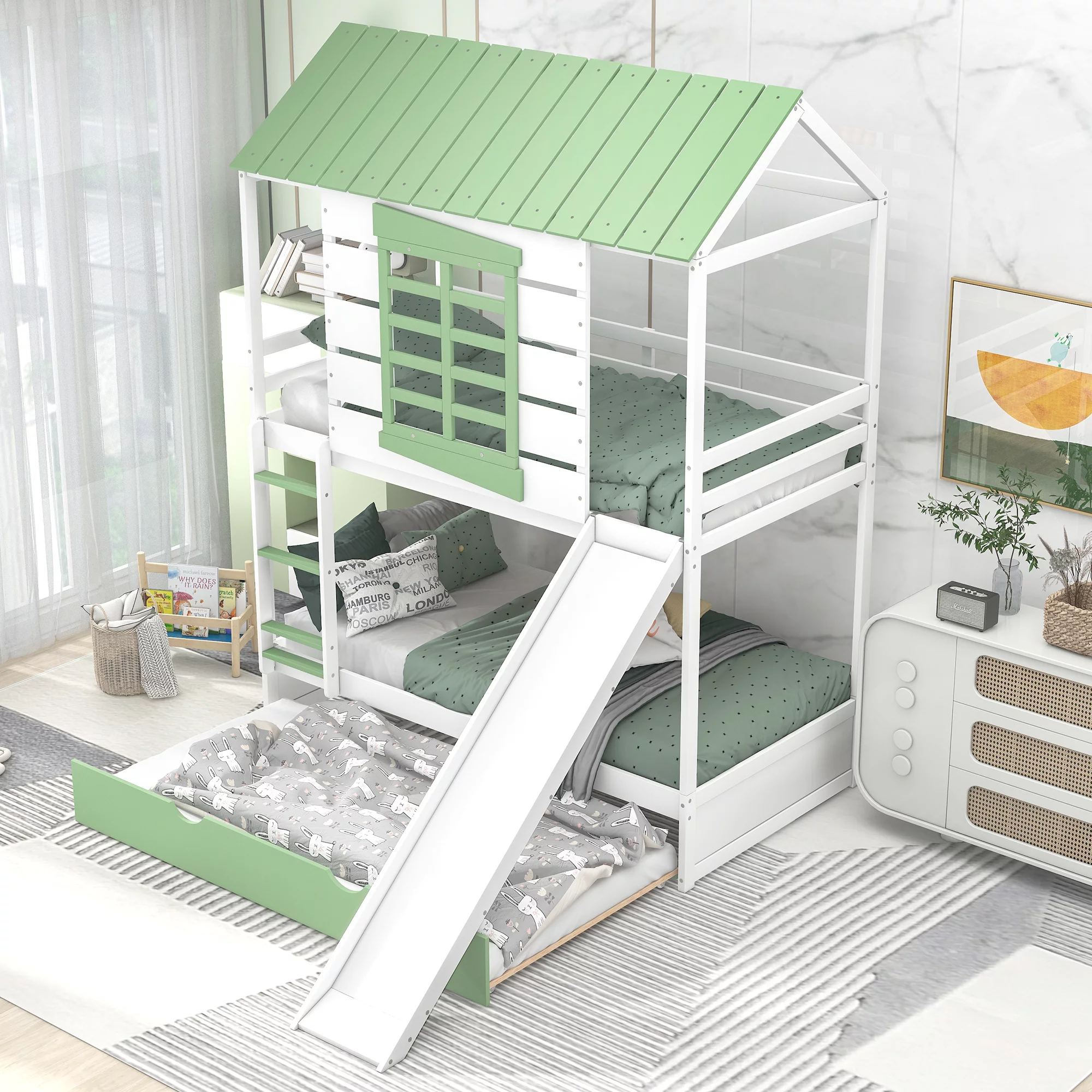 CoSoTower Twin Over Twin Size House Bunk Bed with Convertible Slide and Trundle, White+Green