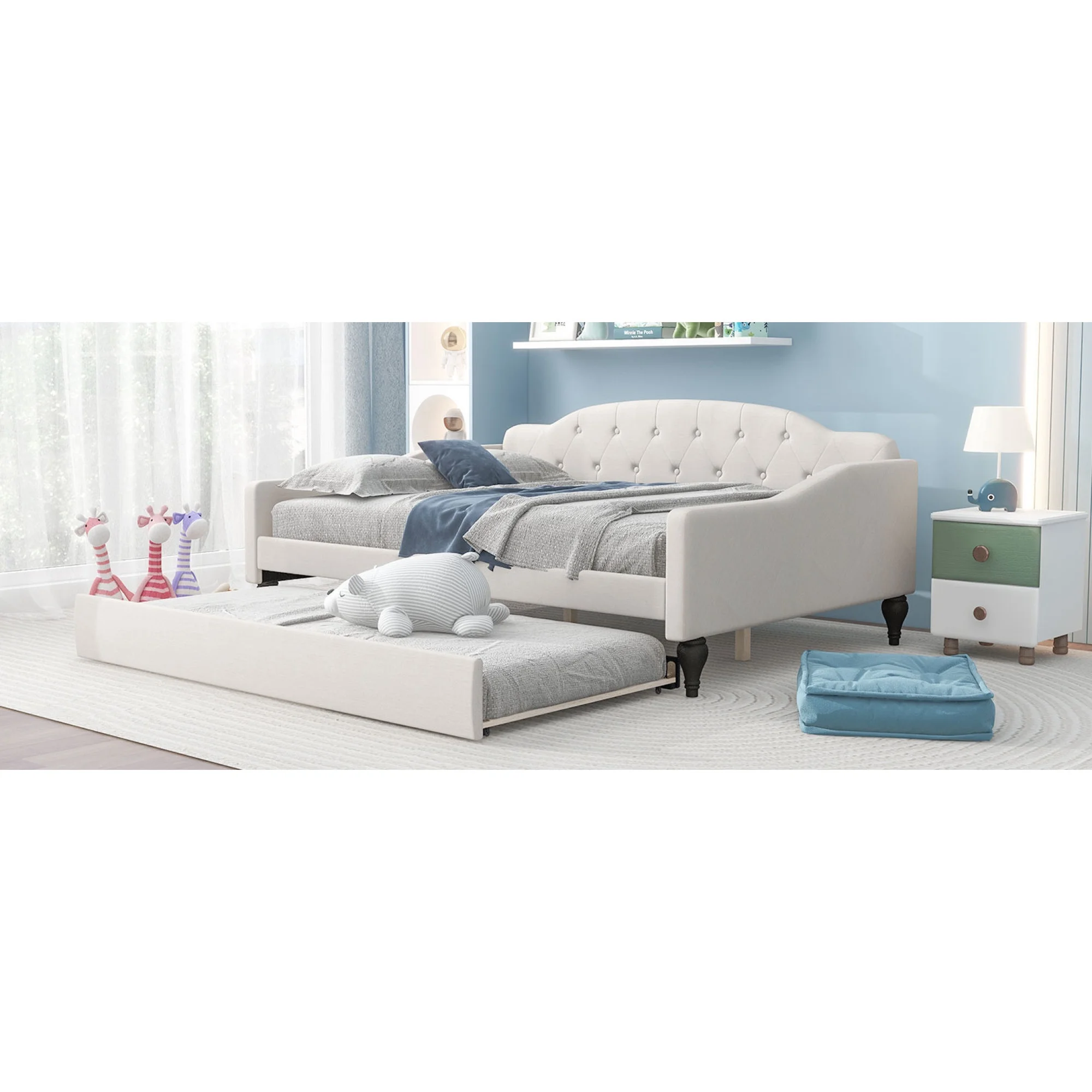 Fabric Upholstered Wooden Day Bed with Trundle and Panel Back in Beige