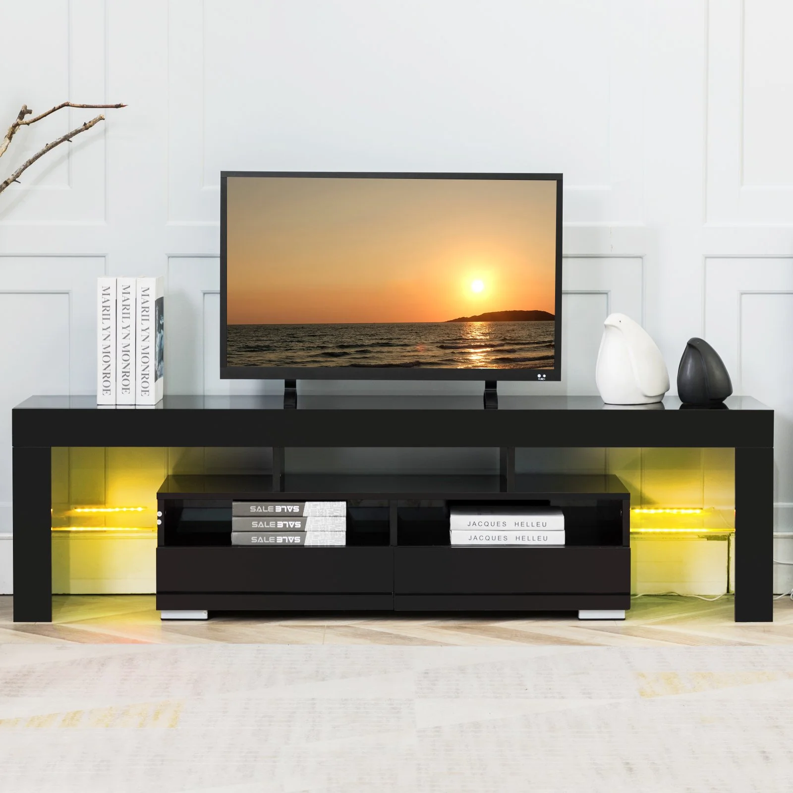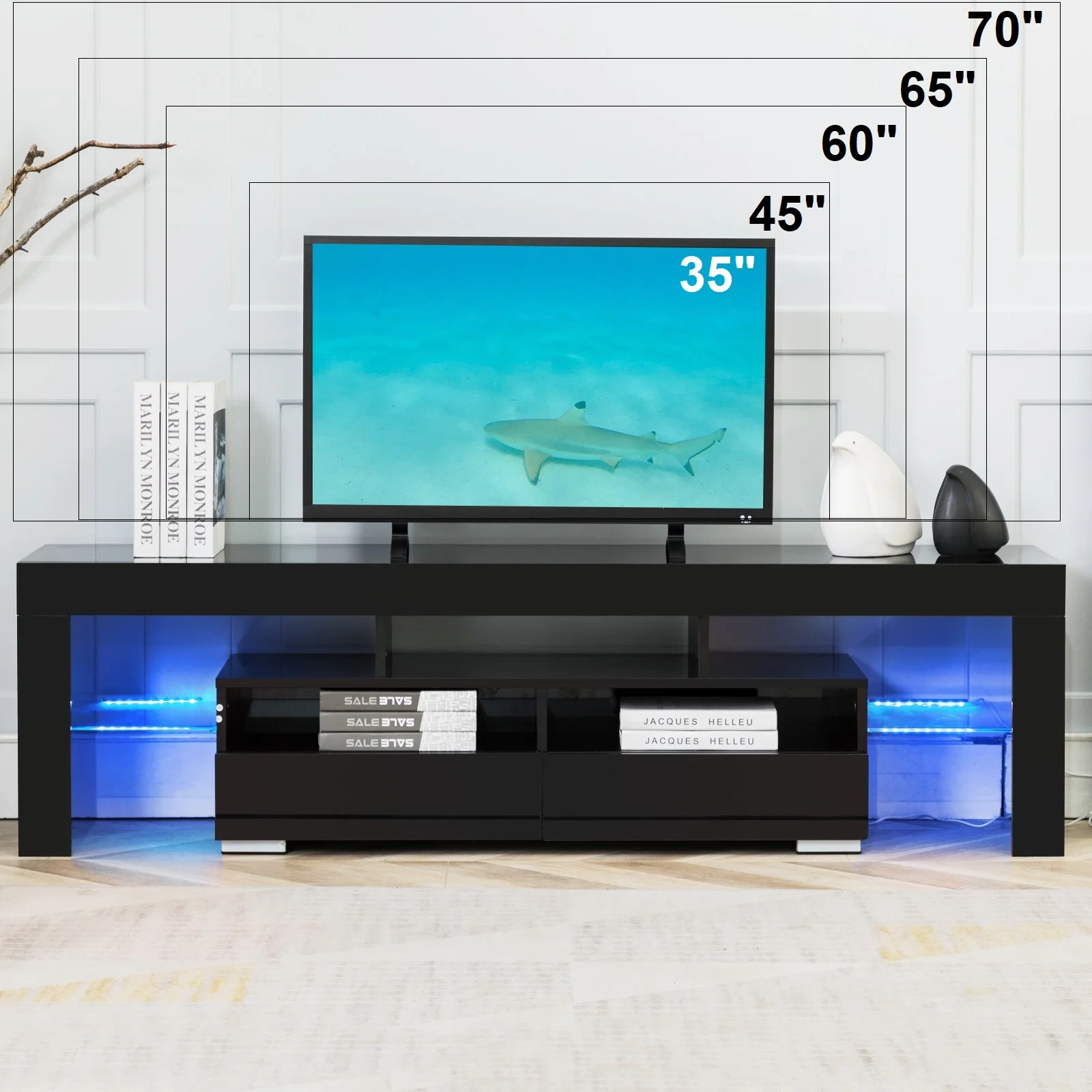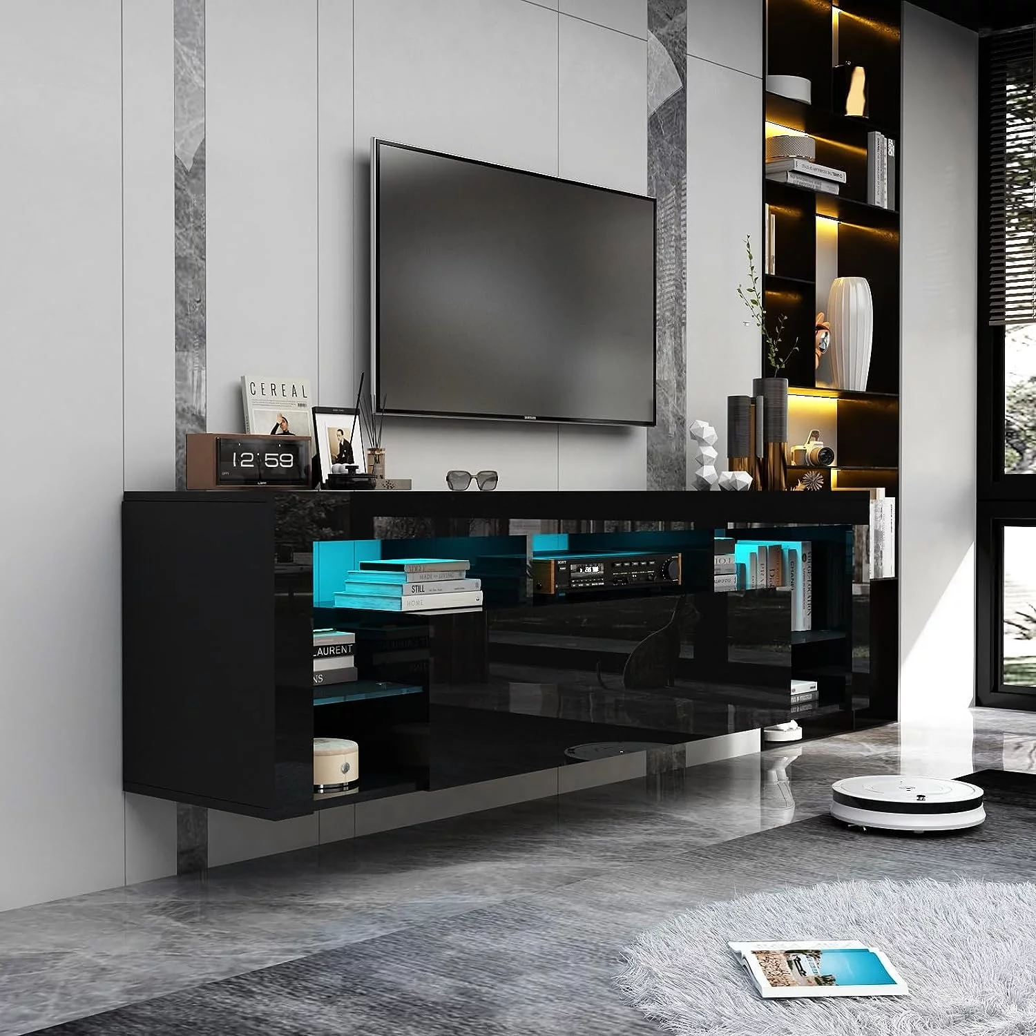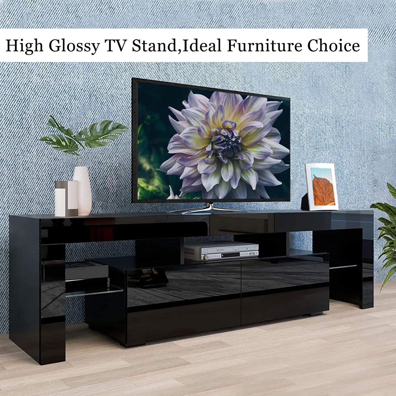 Bonzy Home High Glossy TV Stand for 70 Inch TVs with LED Light, Modern LED TV Unit Media Console with Storage, Black