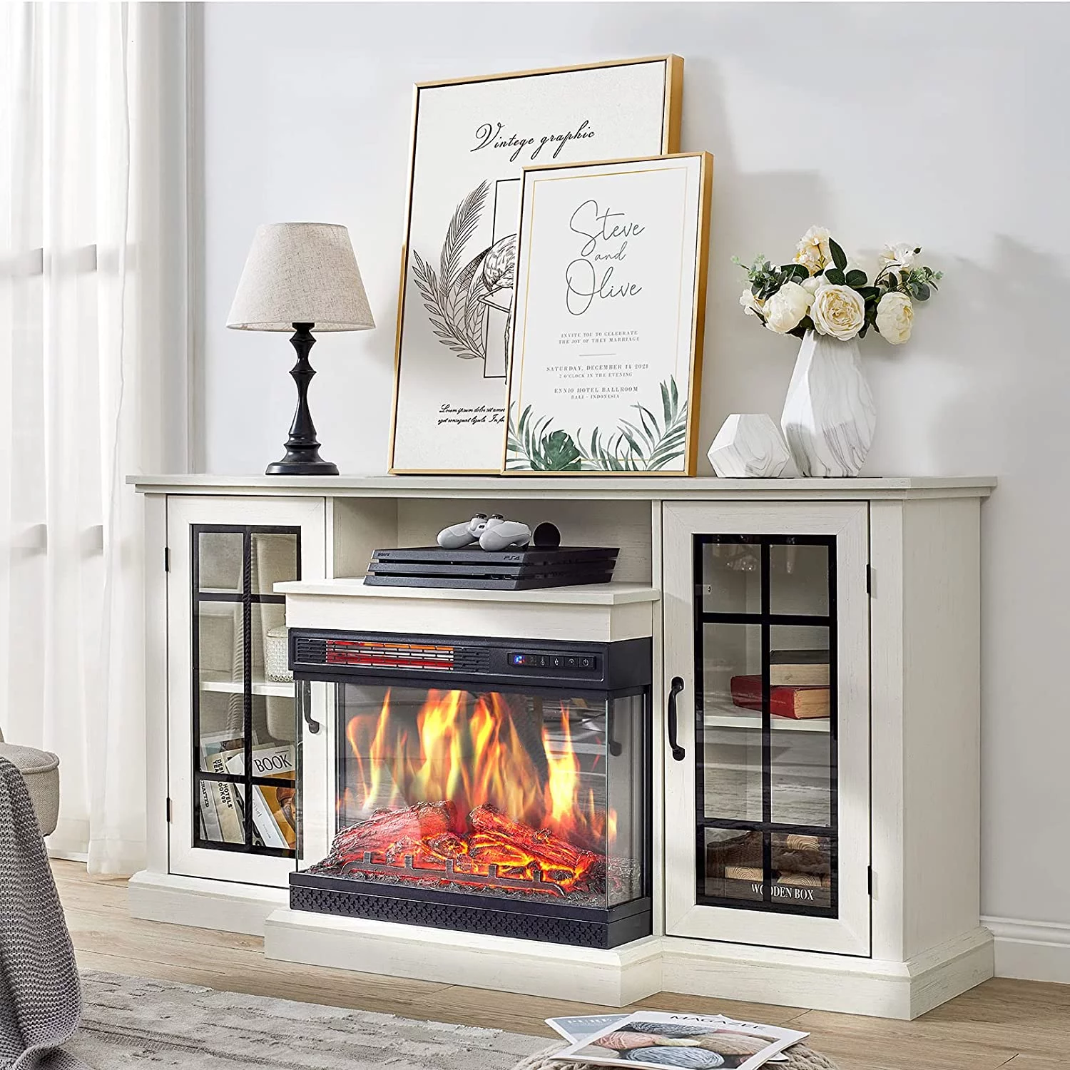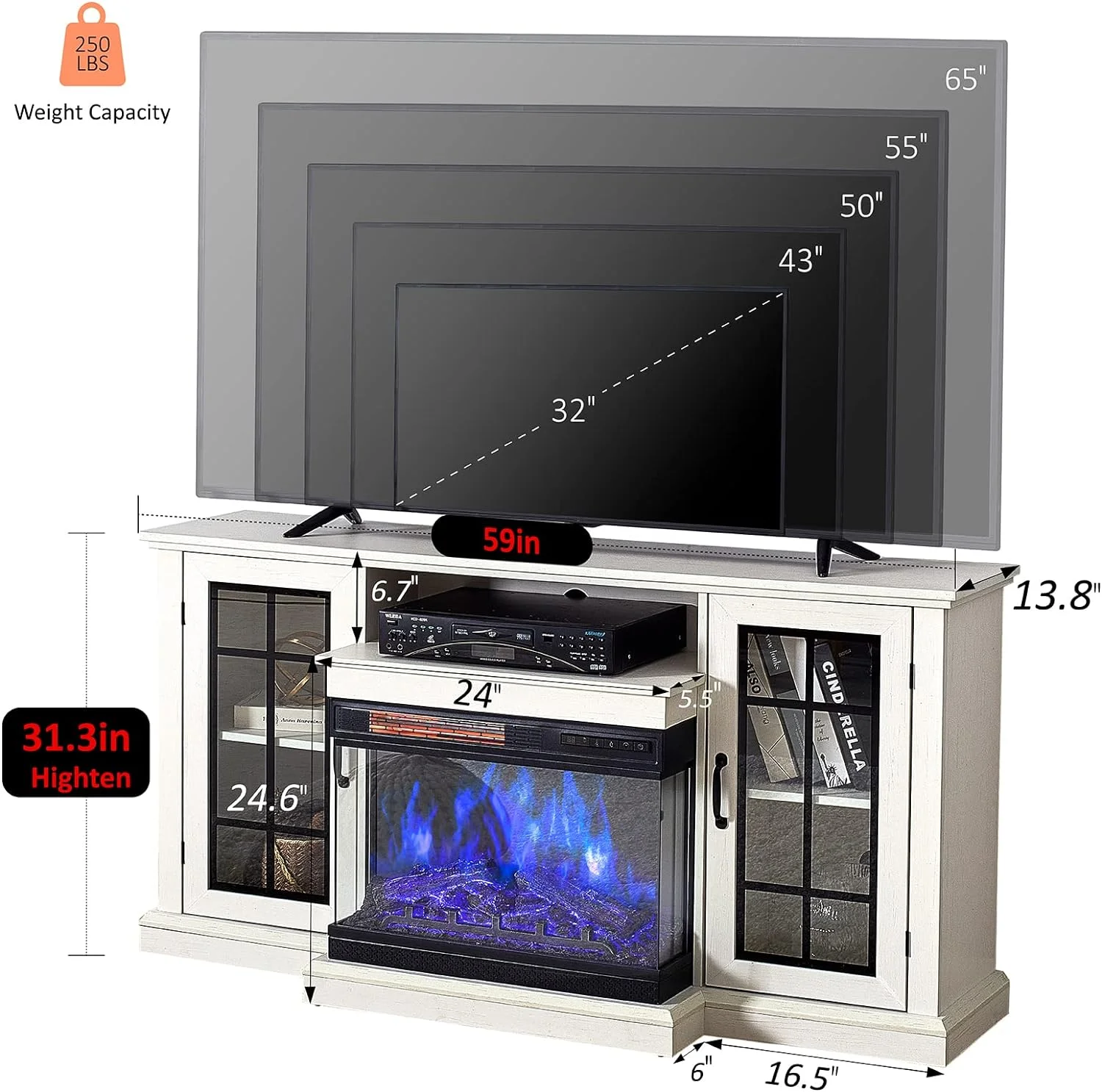 Amerlife 59in 3-Sided Glass Fireplace TV Stand for TVs up to 65", Distressed White