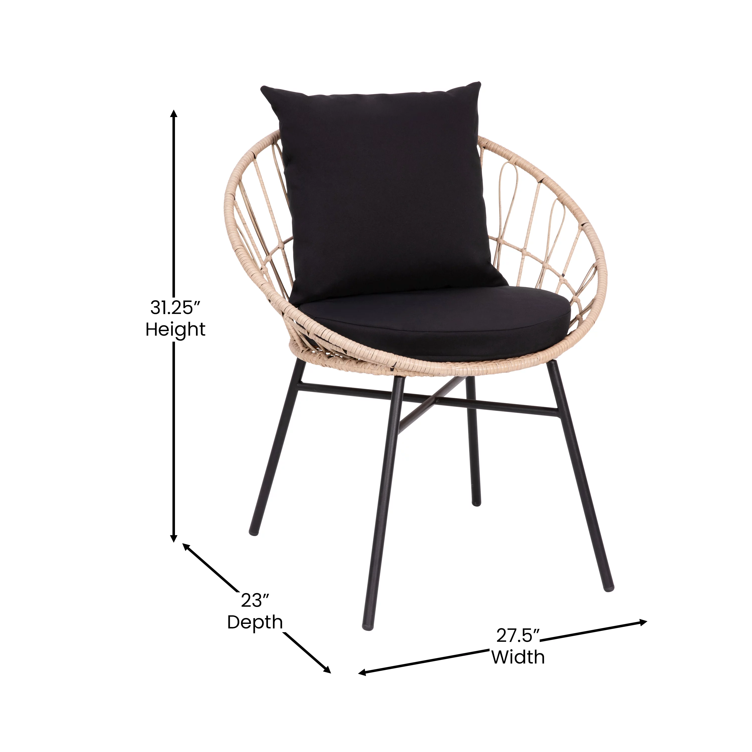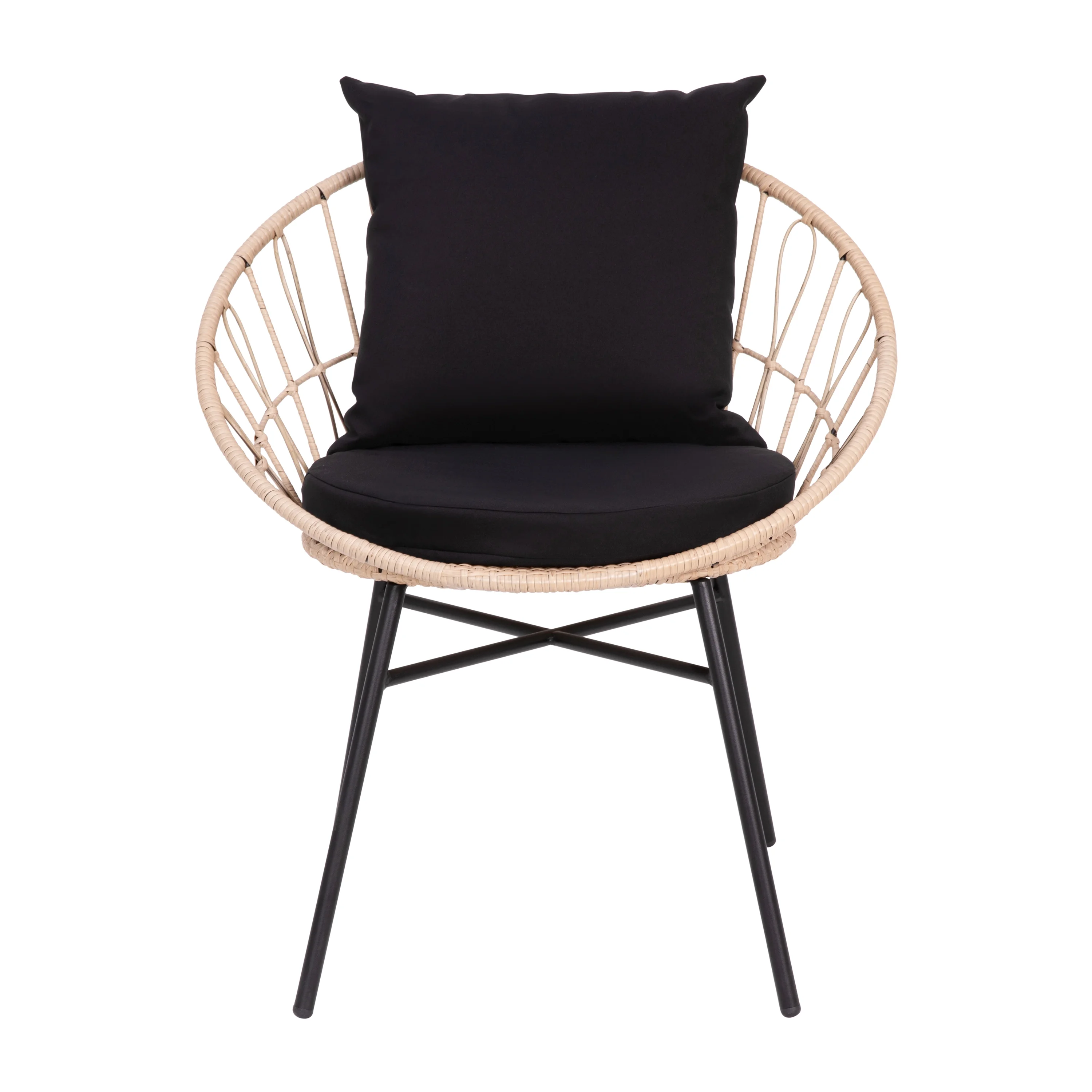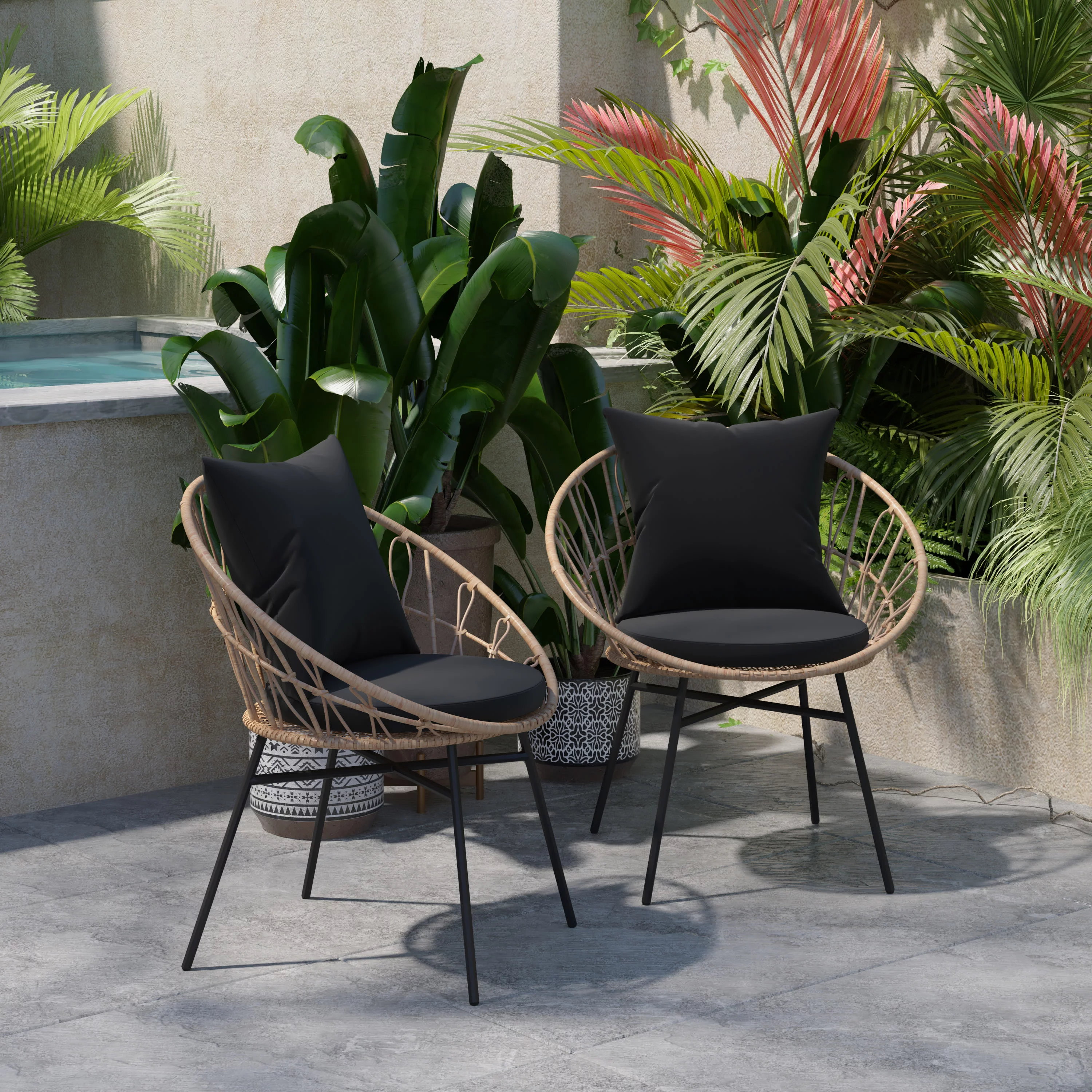 BizChair Set of 2 Indoor/Outdoor Modern Papasan Patio Chairs, Rope with Tan Finish PE Wicker Rattan and Black Cushions