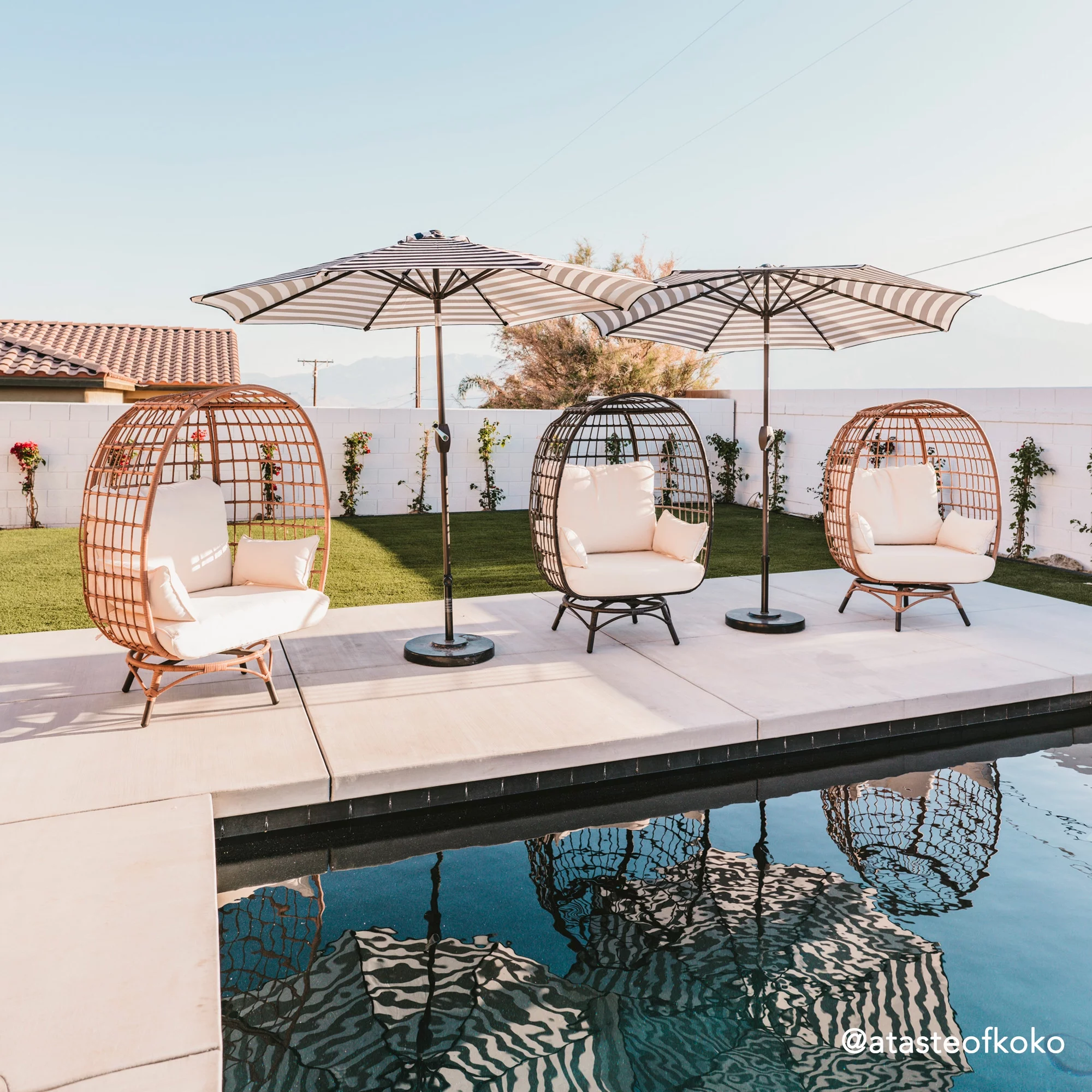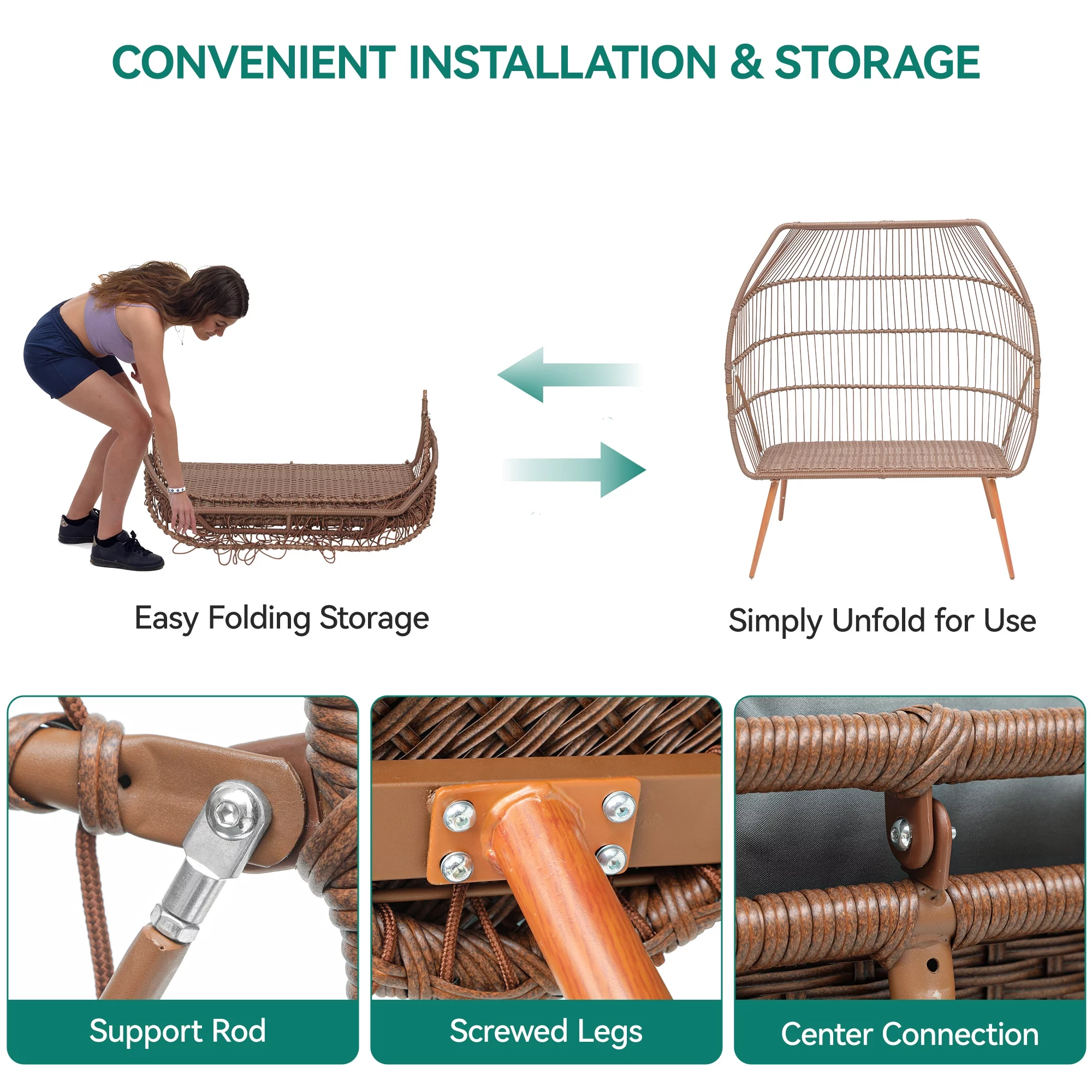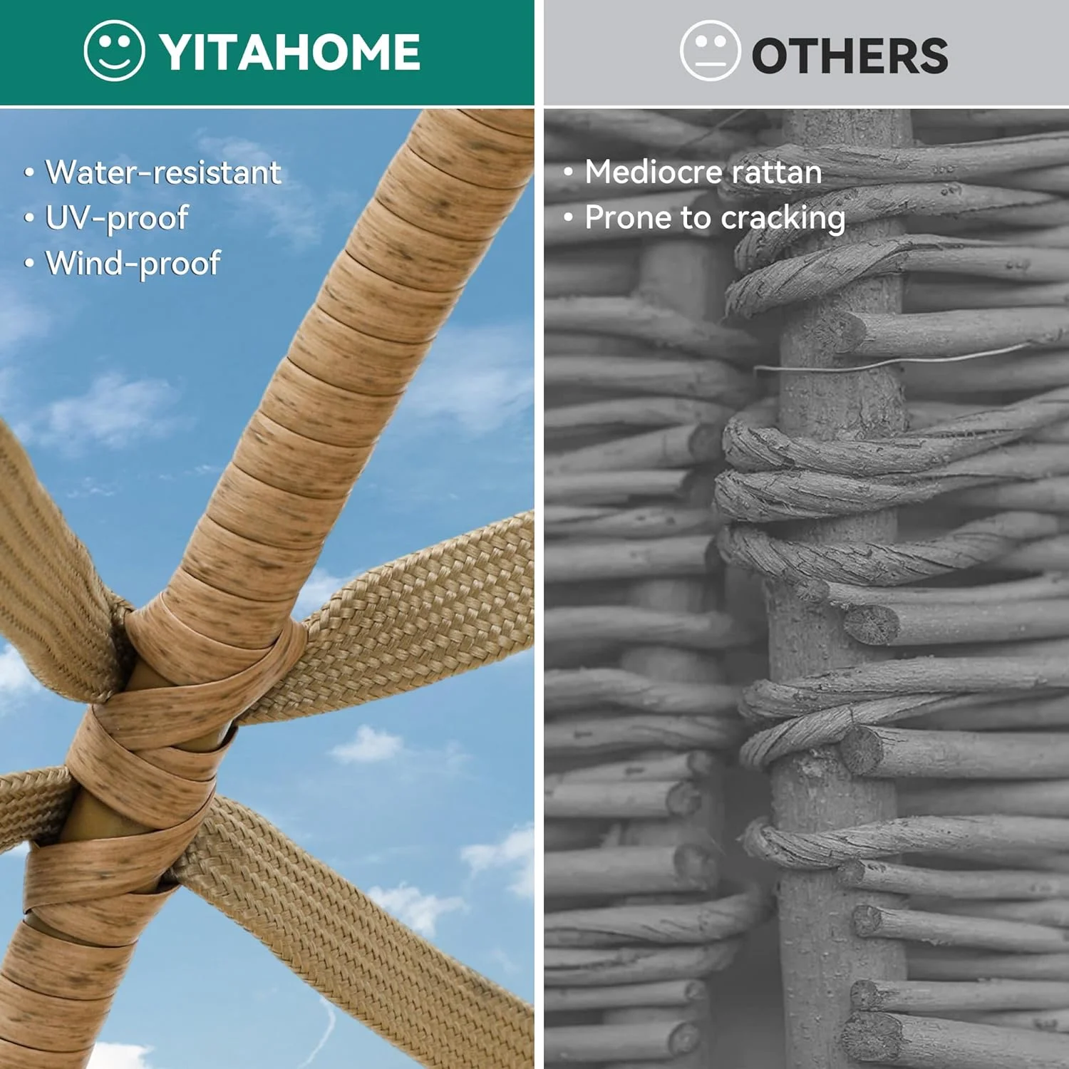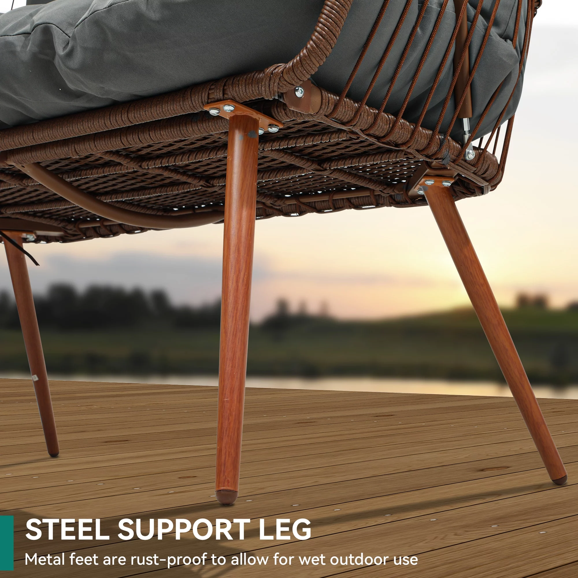 BizChair Set of 2 Indoor/Outdoor Modern Papasan Patio Chairs, Rope with Tan Finish PE Wicker Rattan and Black Cushions