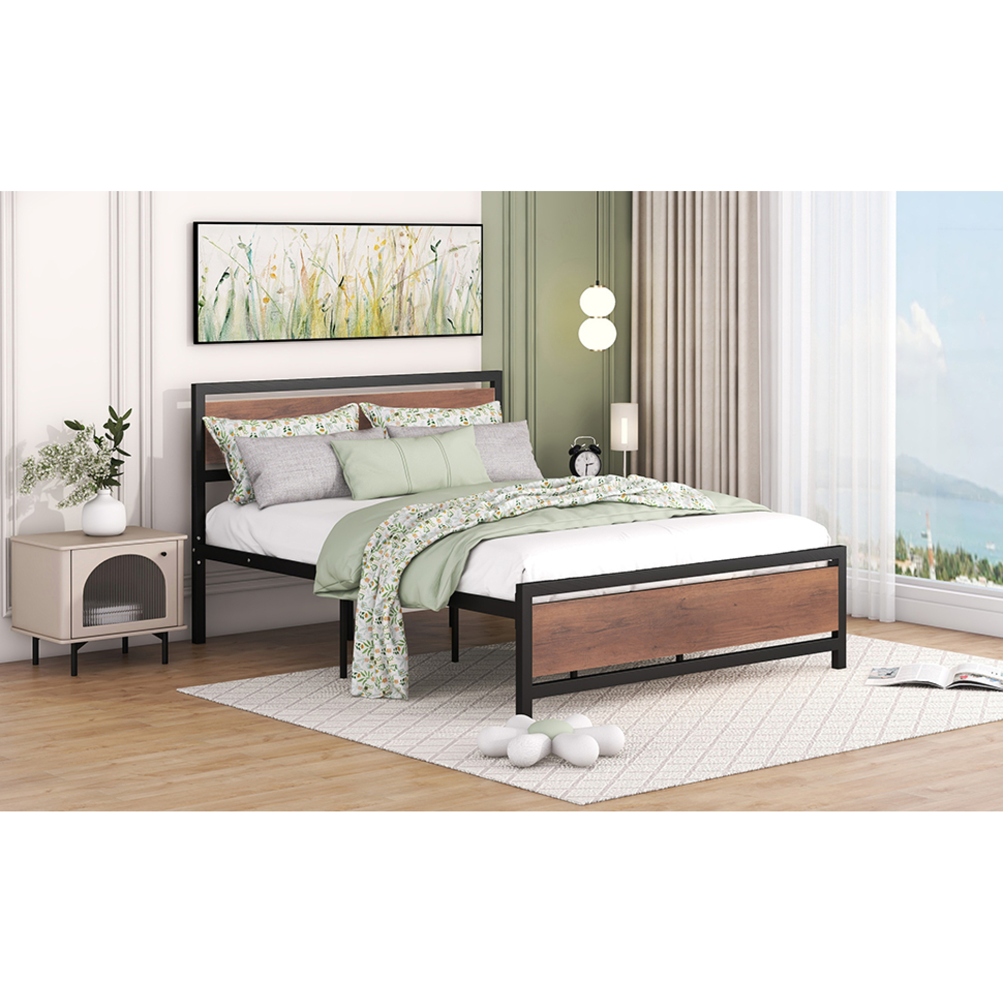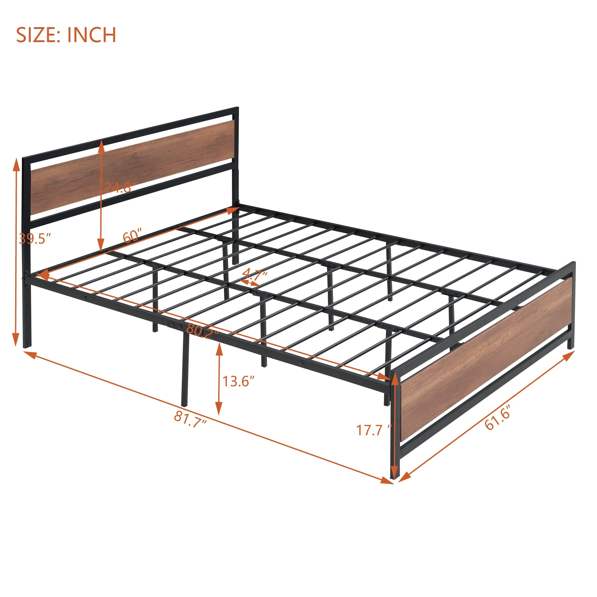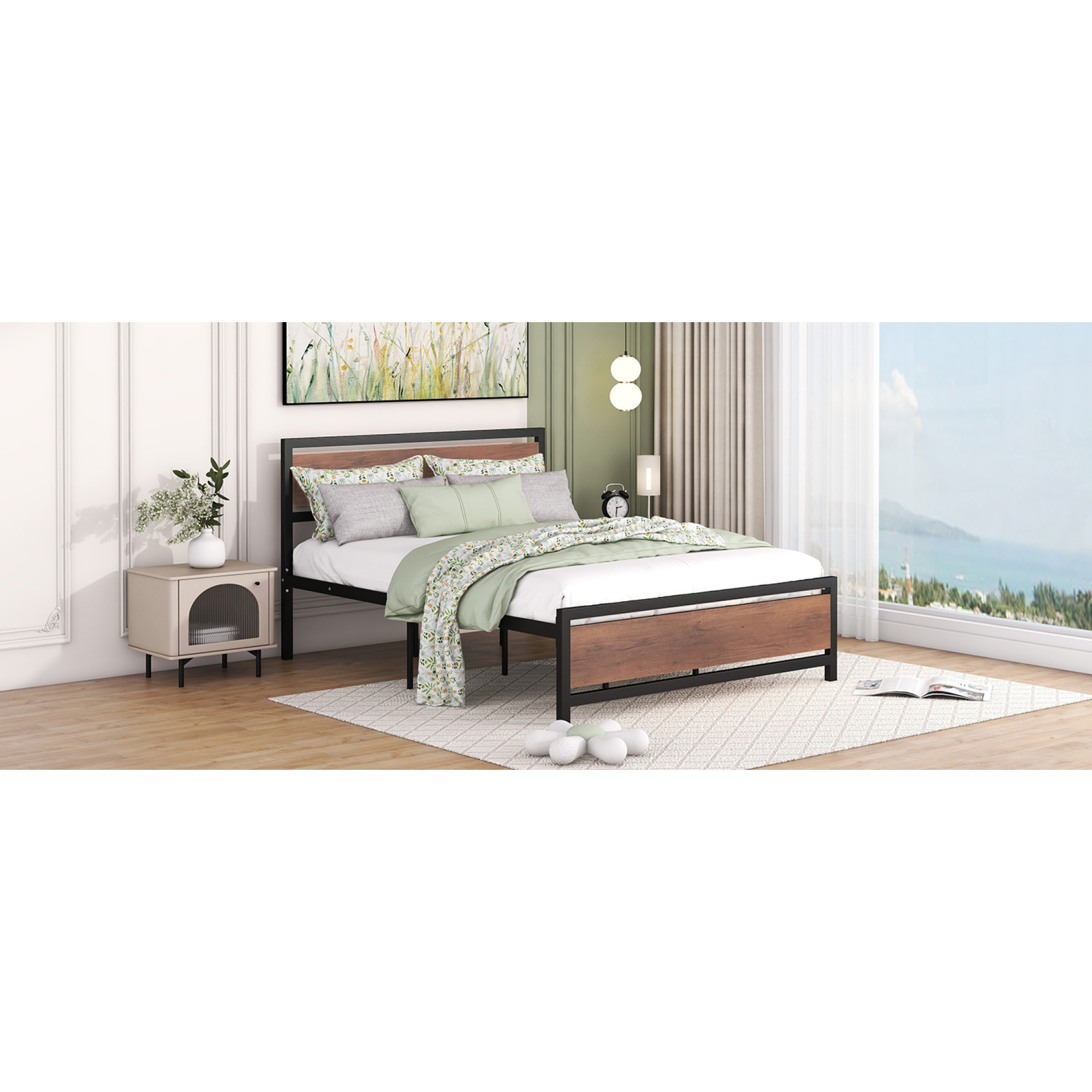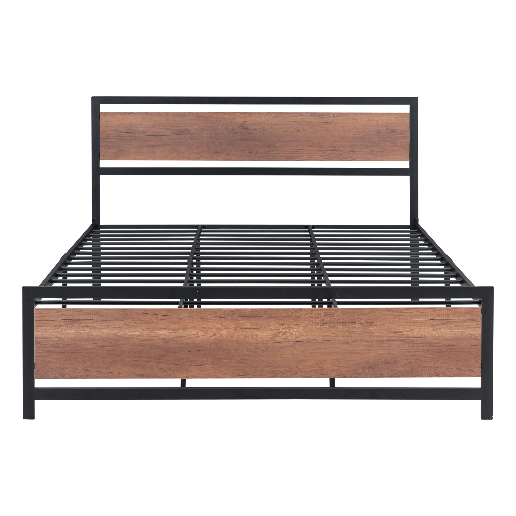 Queen Size Platform Bed, Metal and Wood Bed Frame with Headboard and Footboard , Black