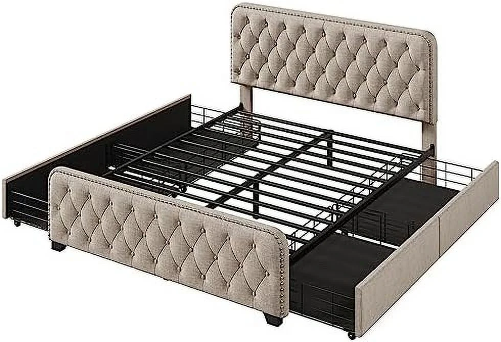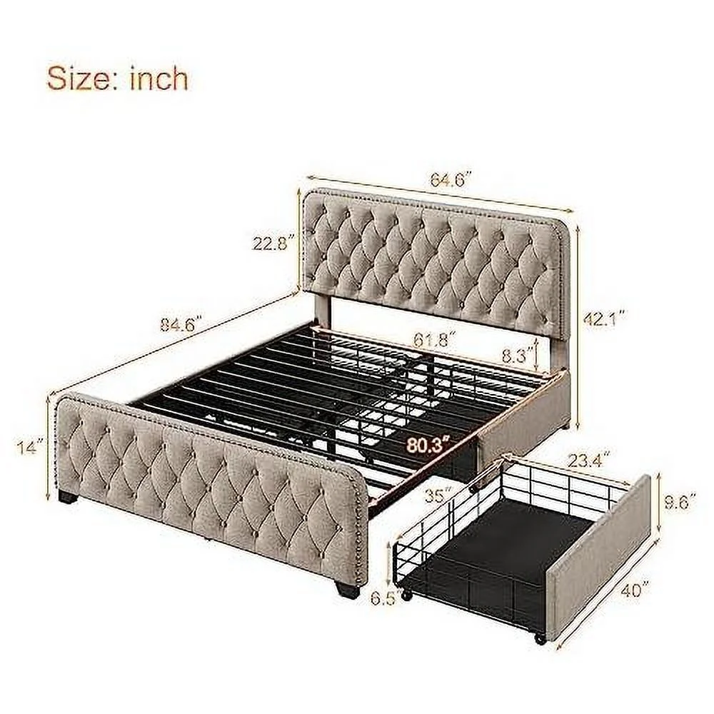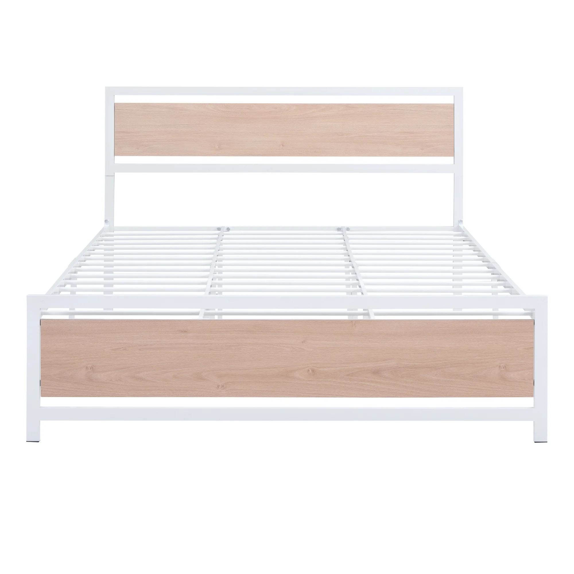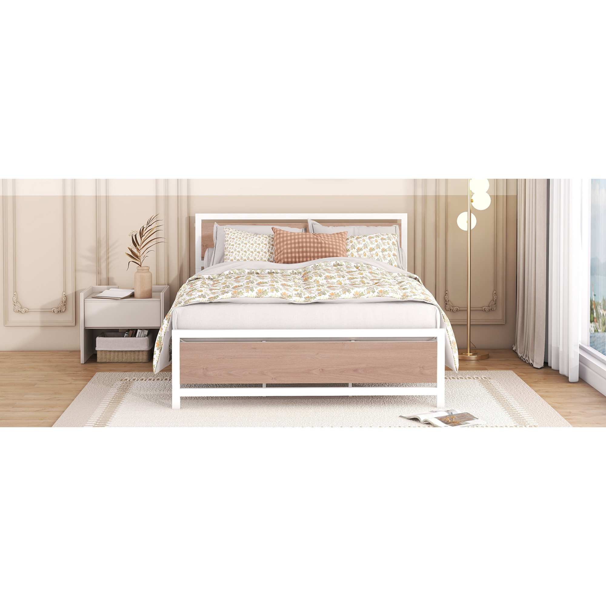 Queen Size Platform Bed, Metal and Wood Bed Frame with Headboard and Footboard , White