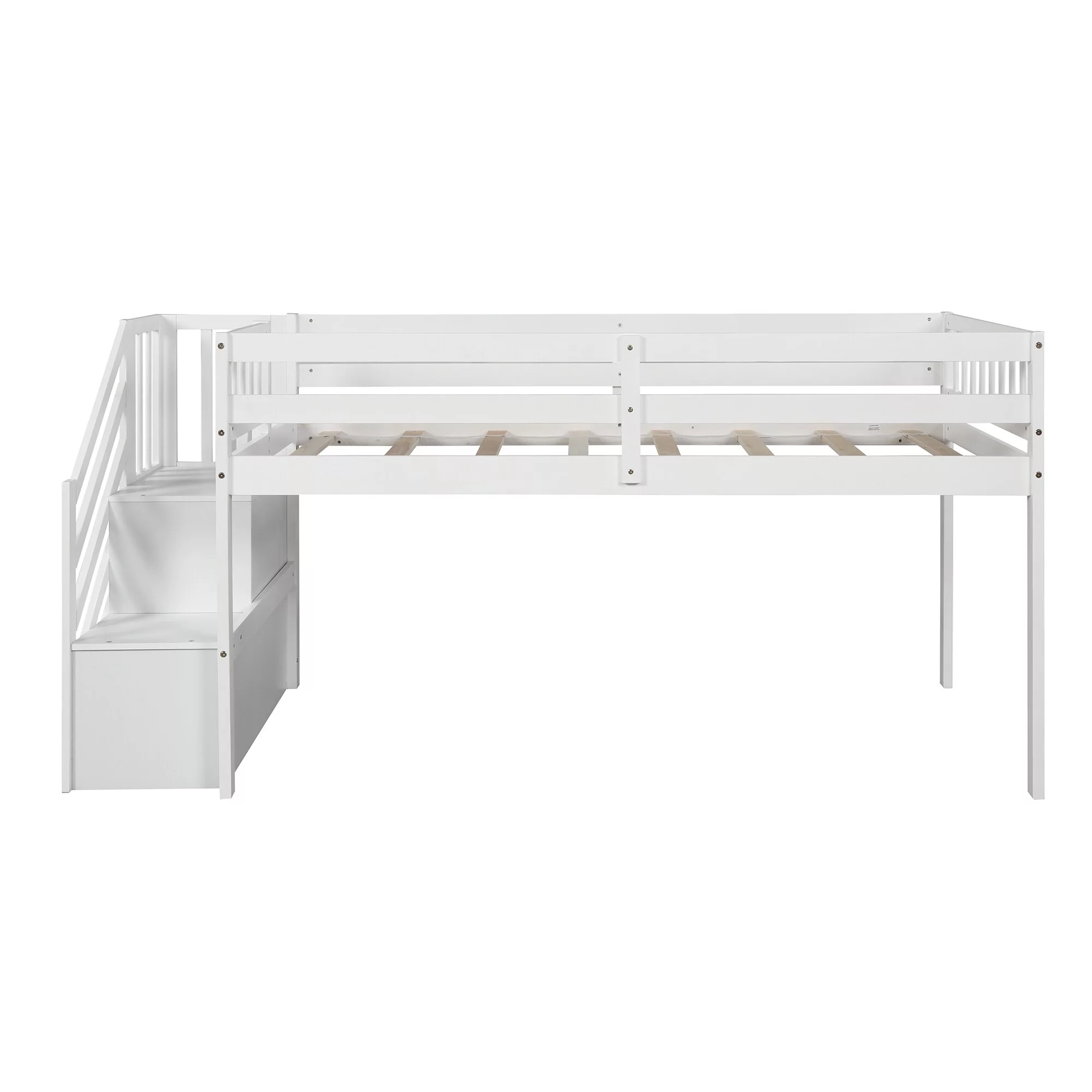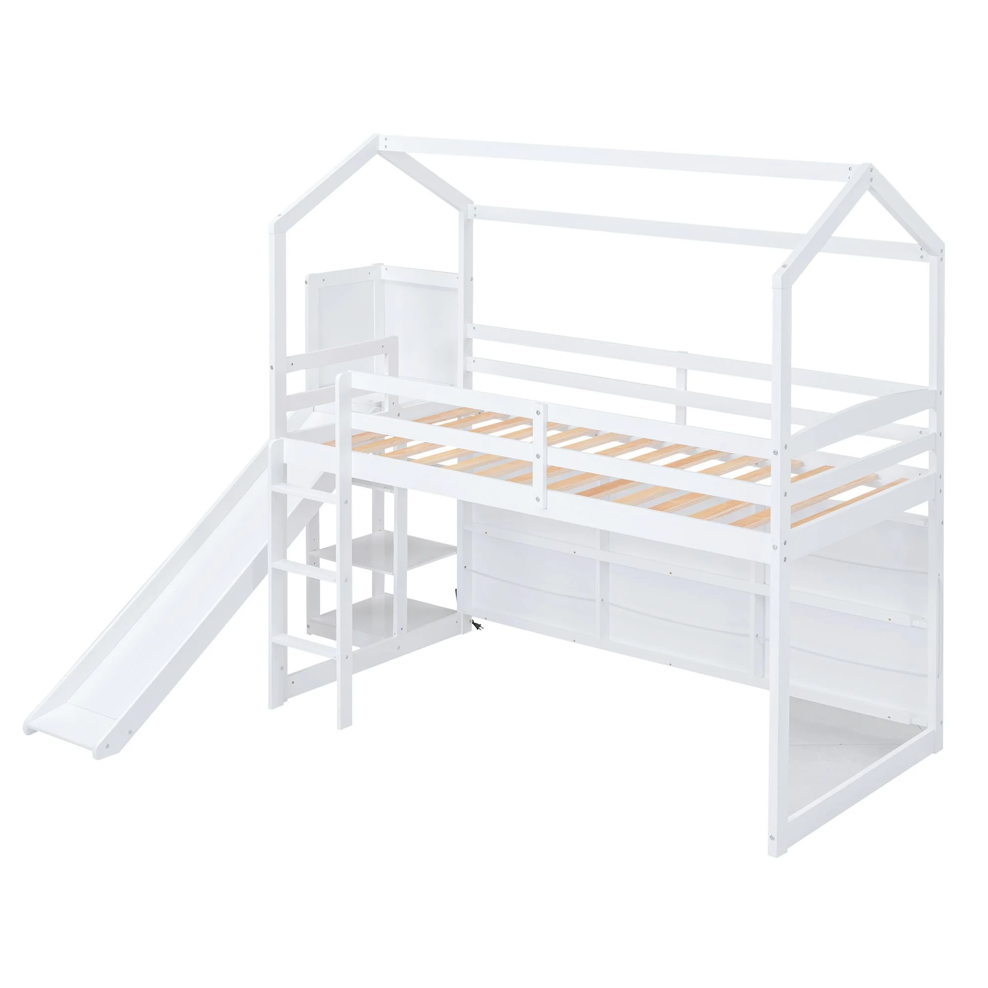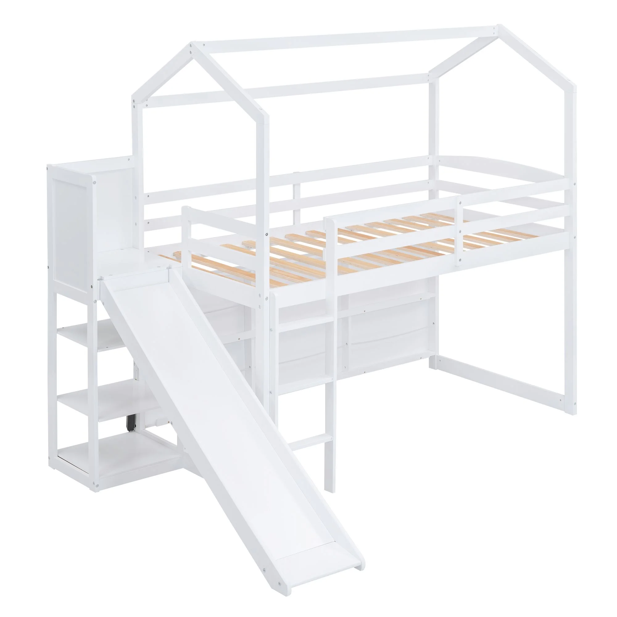 ikayaa Twin size Loft Bed with Storage Shelves, Desk and Ladder, White