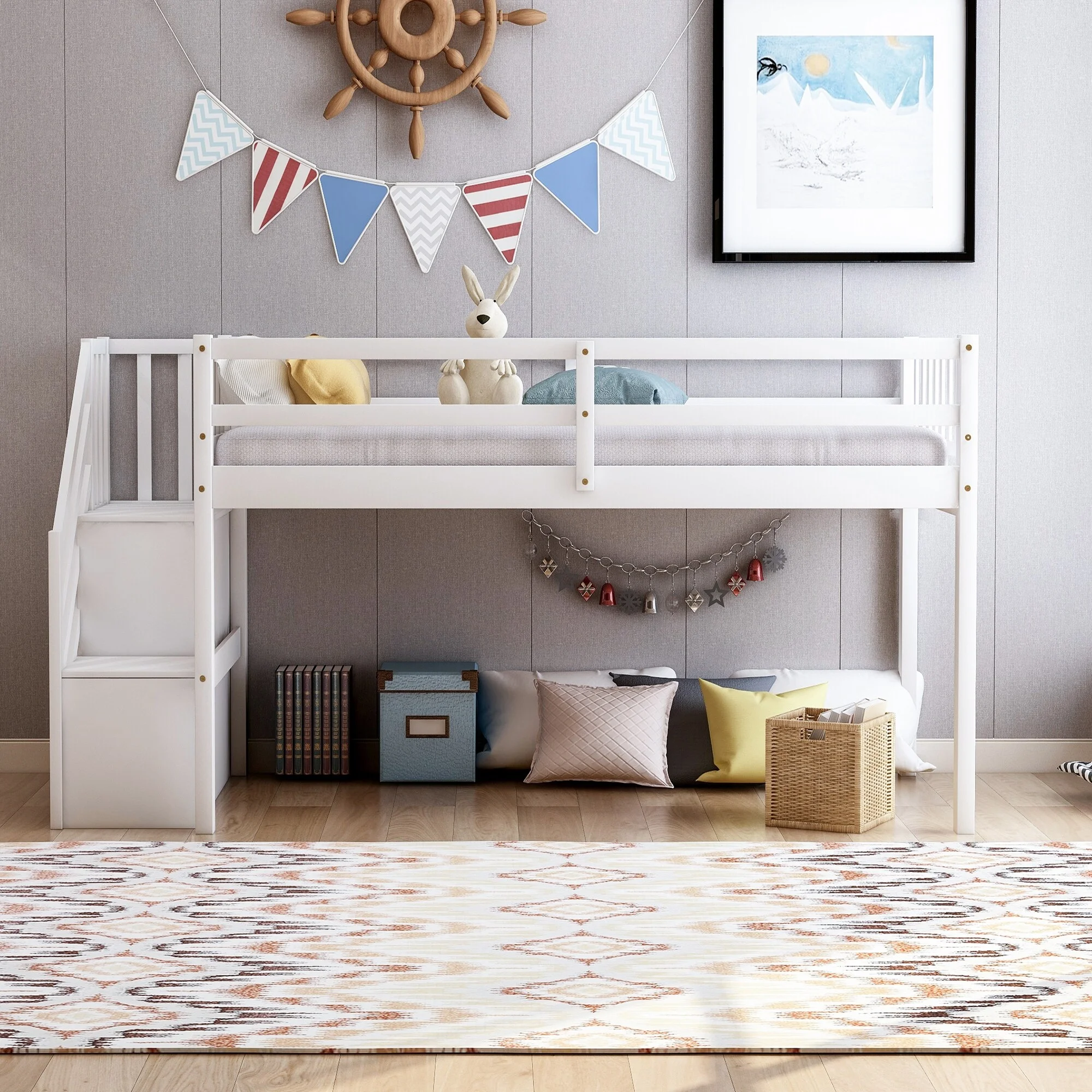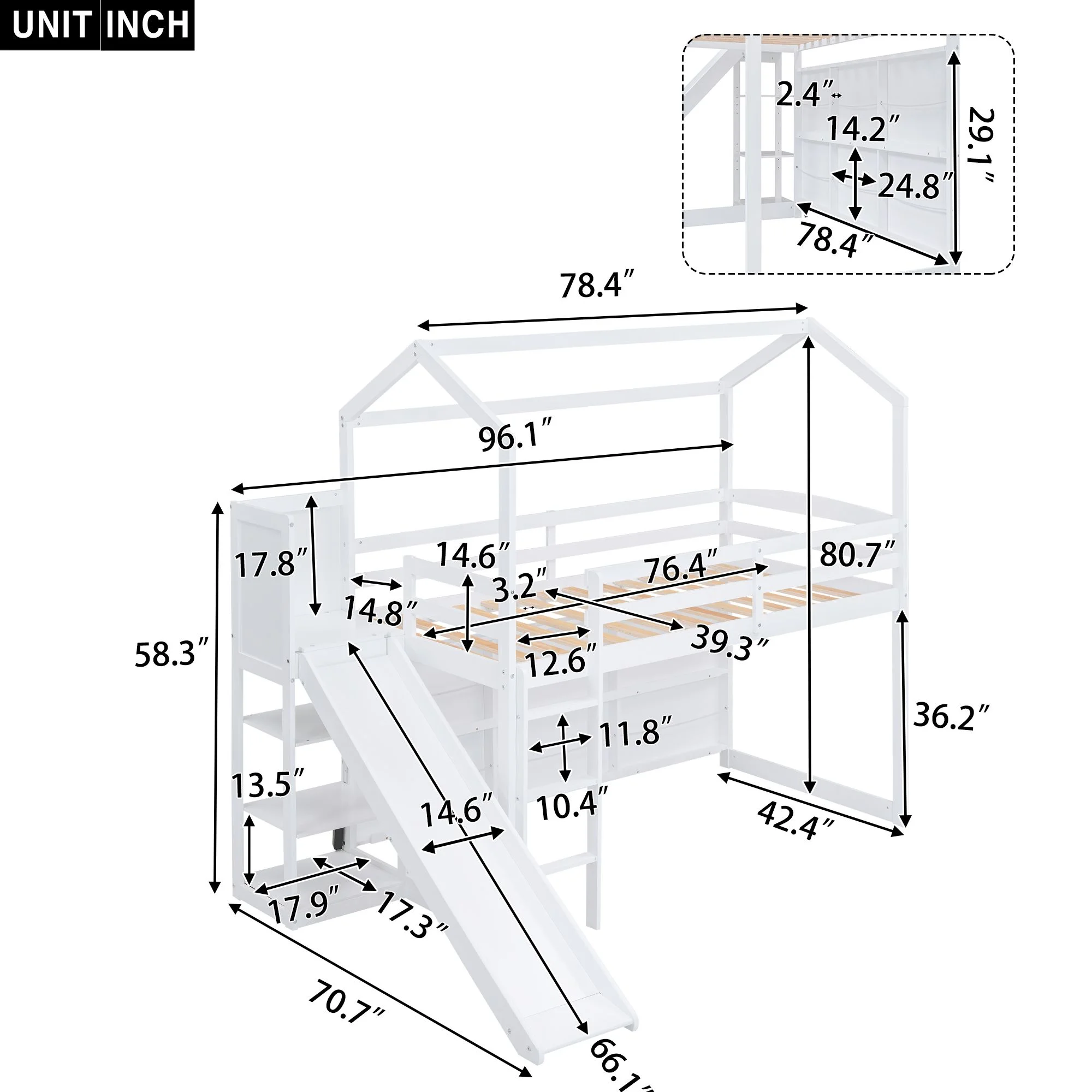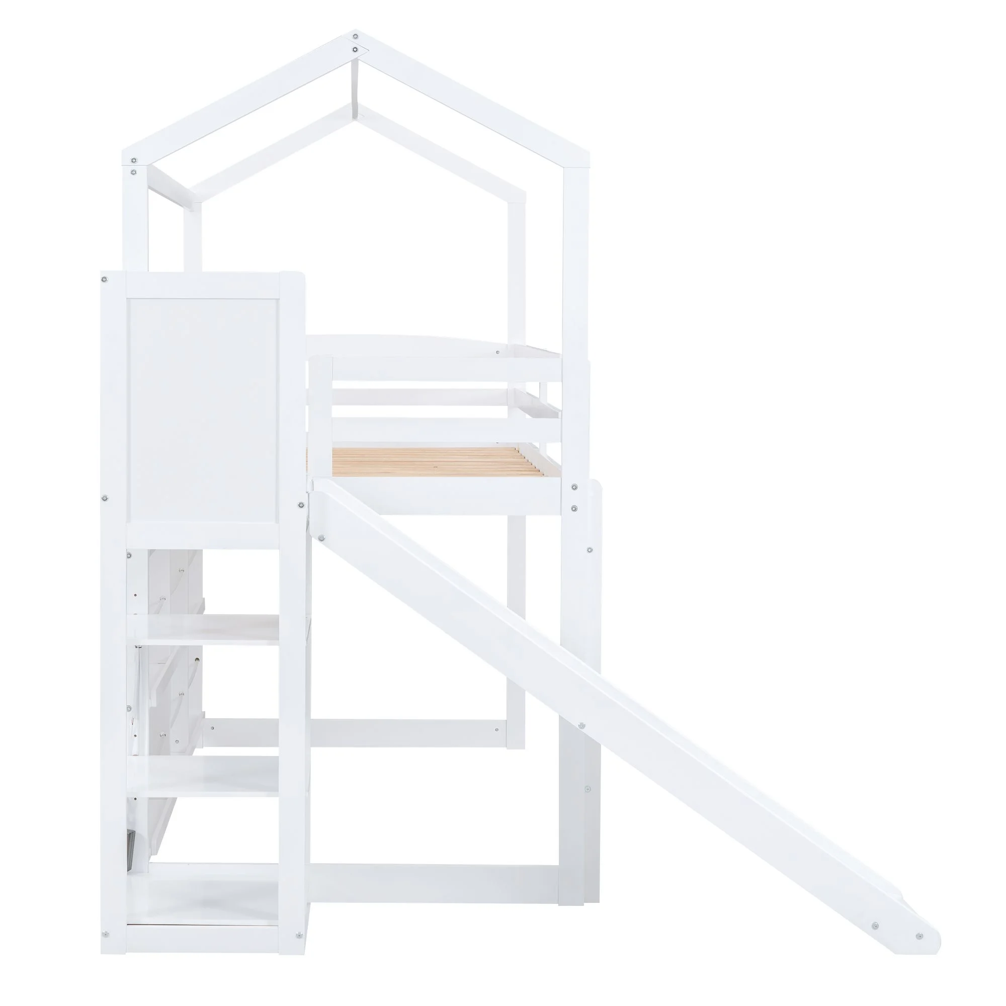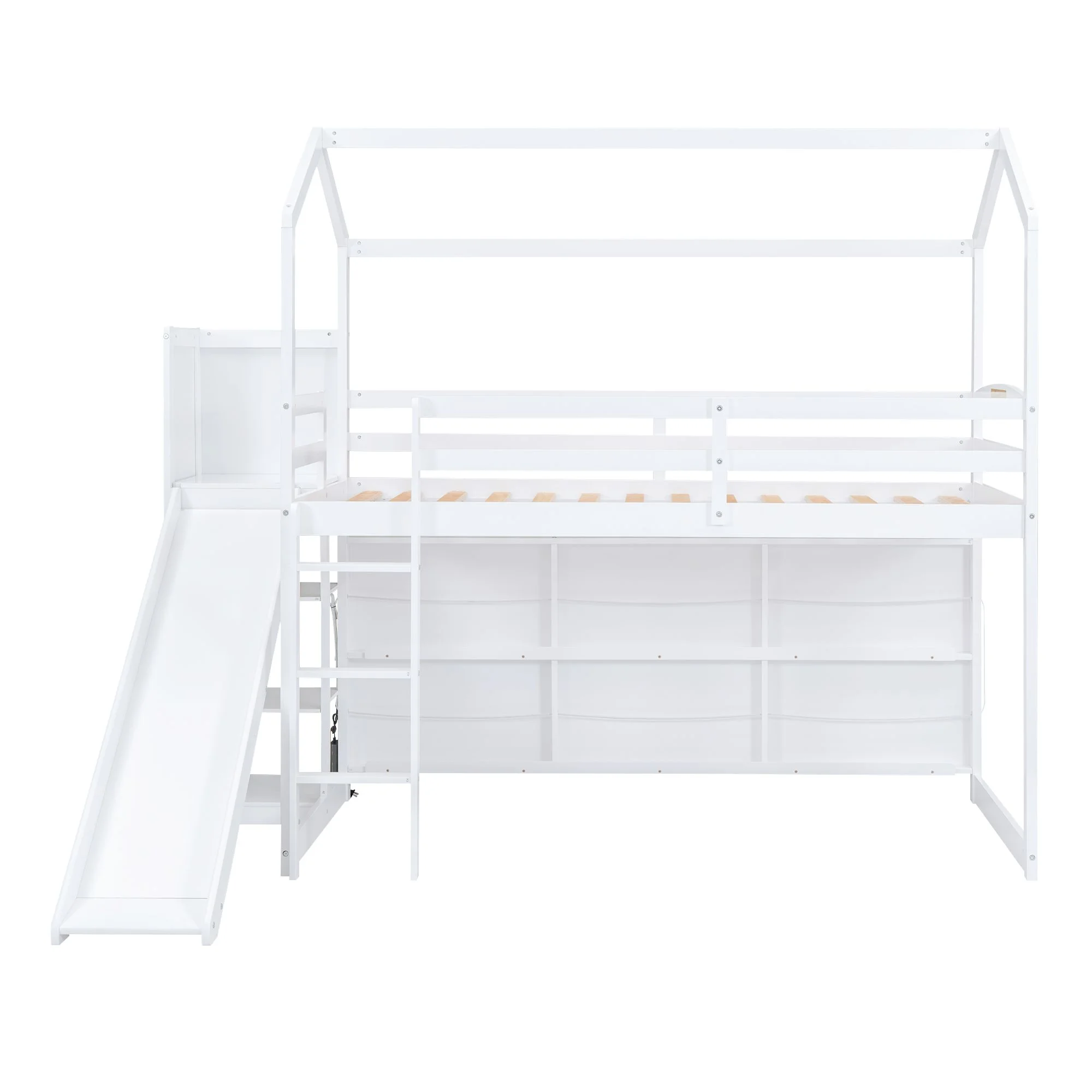 ikayaa Twin size Loft Bed with Storage Shelves, Desk and Ladder, White