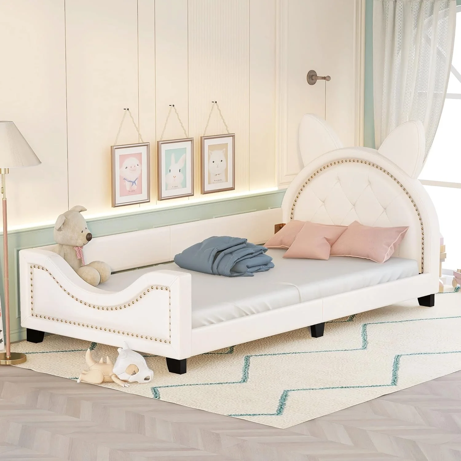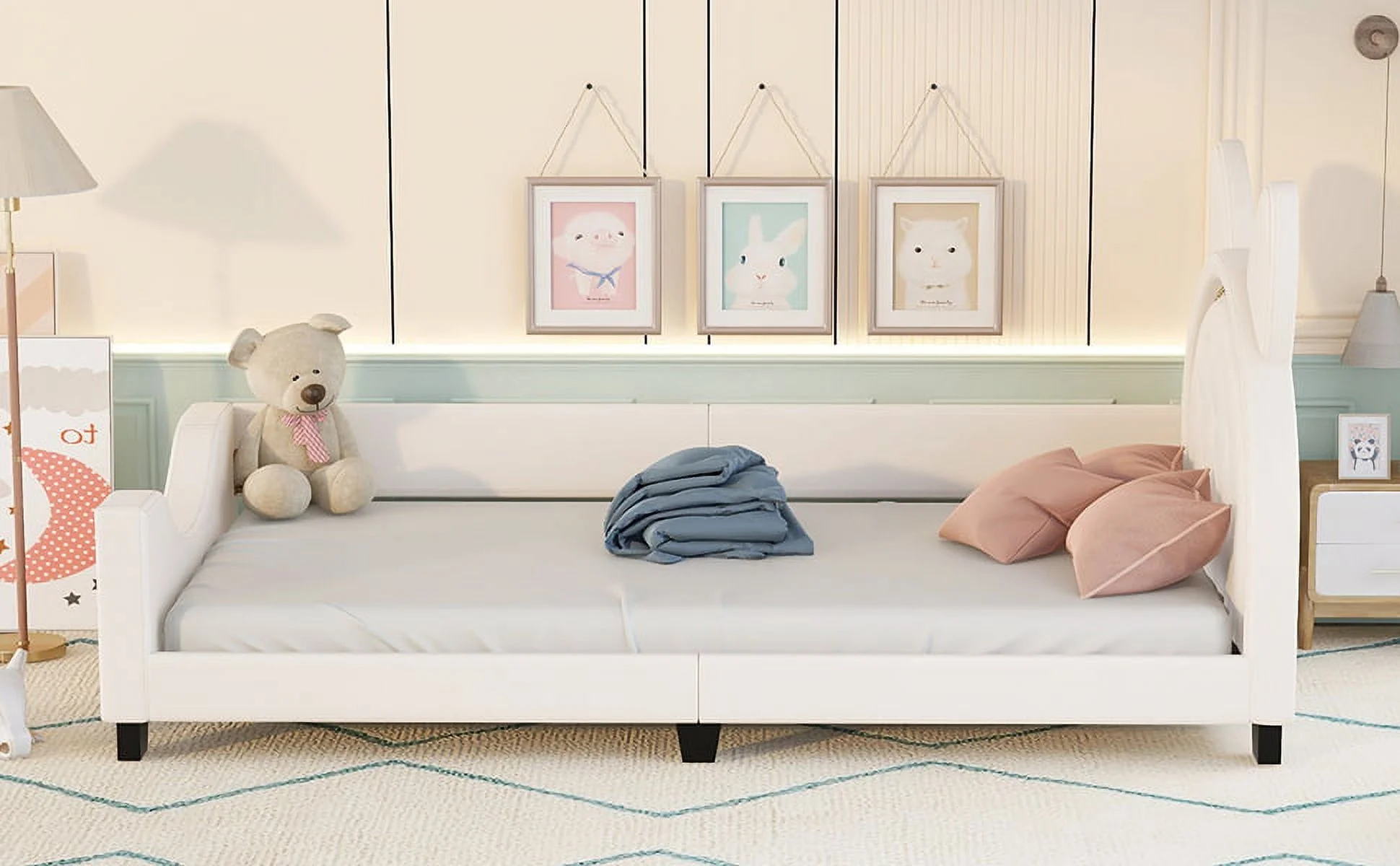 Upholstered Daybed With Carton Ears Headboard, Rabbit-Shaped Cute Platform Bed Frame With Button For Boys Girls (White, )