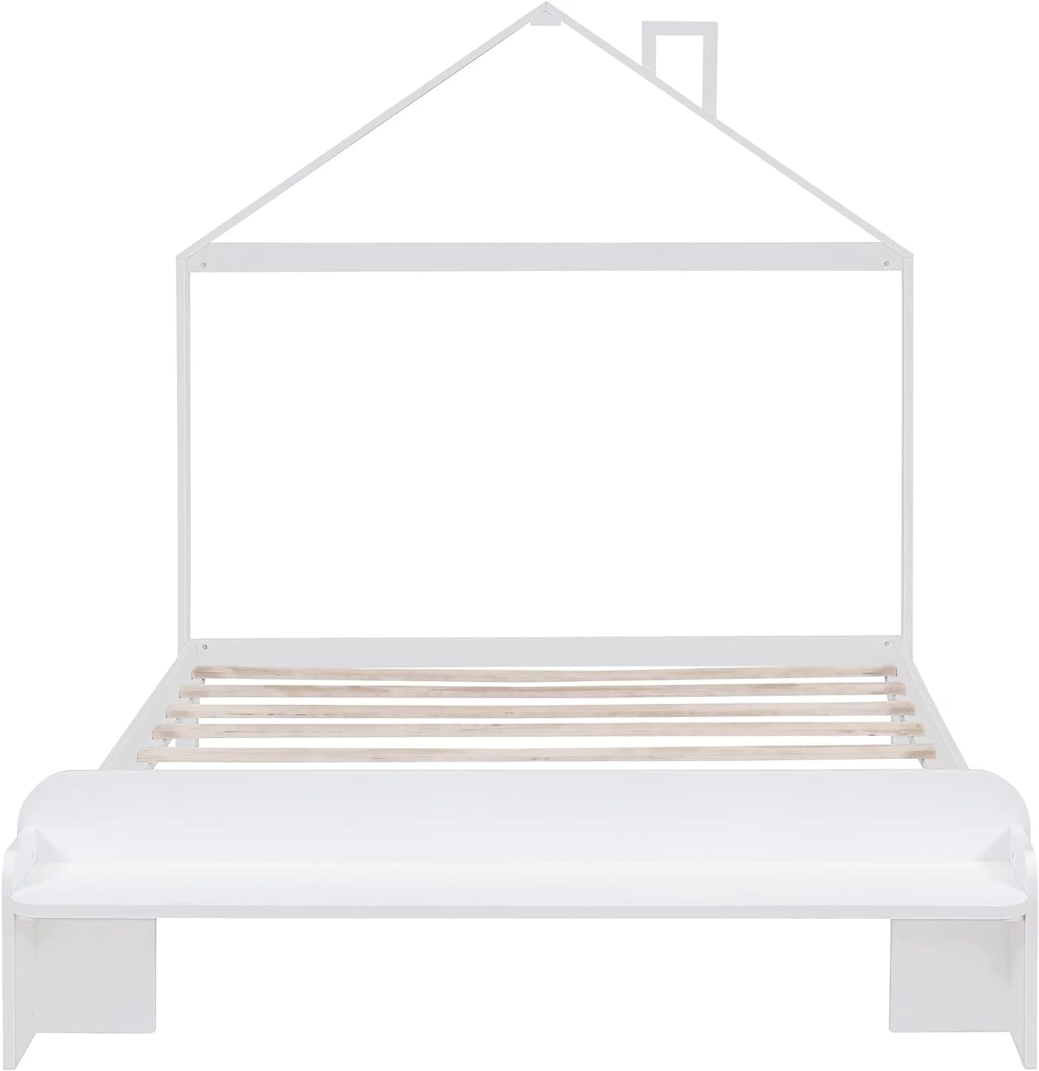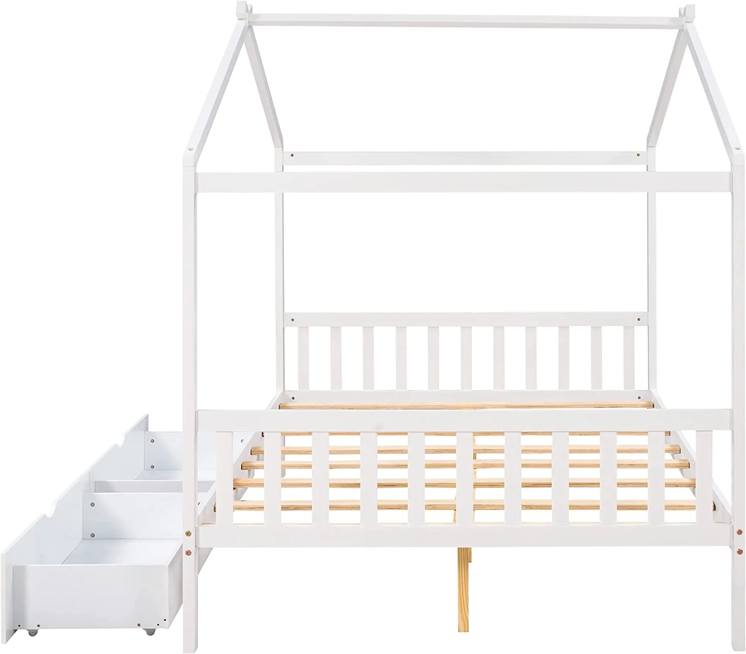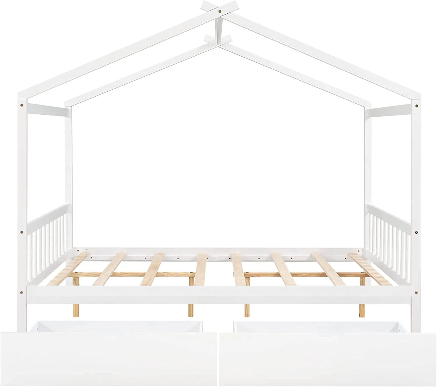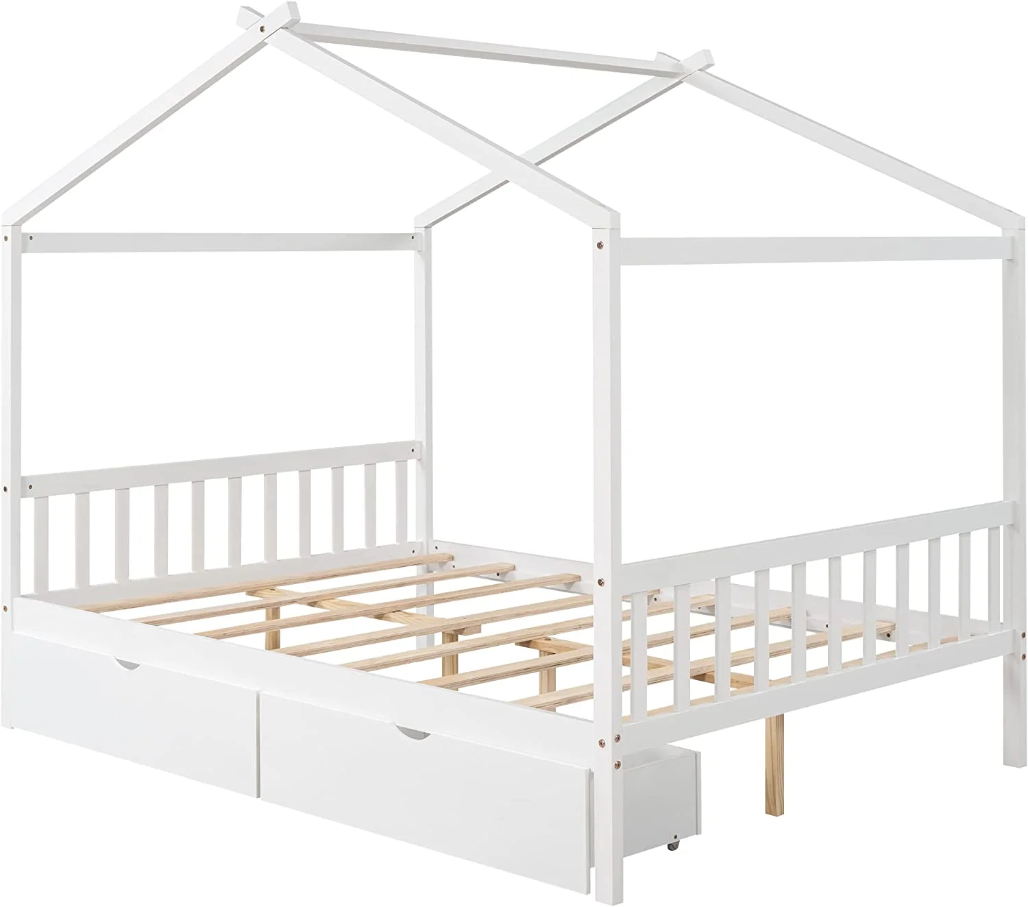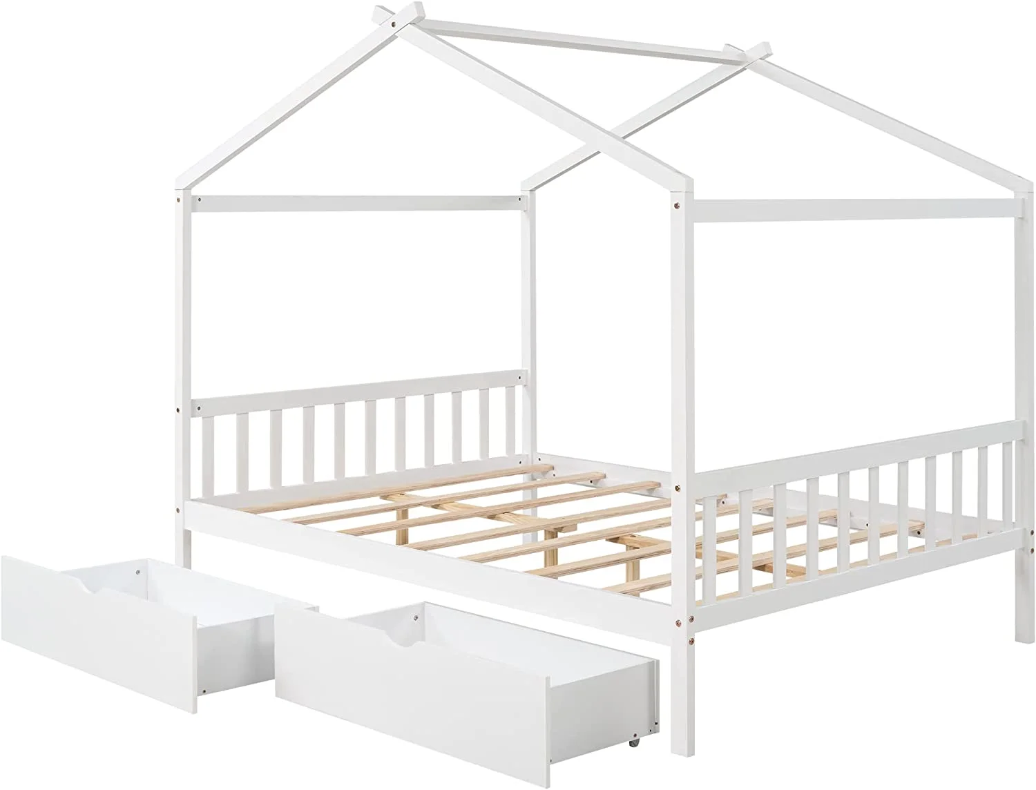 Full Size House Bed, Full Platform Bed With 2 Drawers, Headboard And Footboard, Roof Design, Bedroom Furniture, White