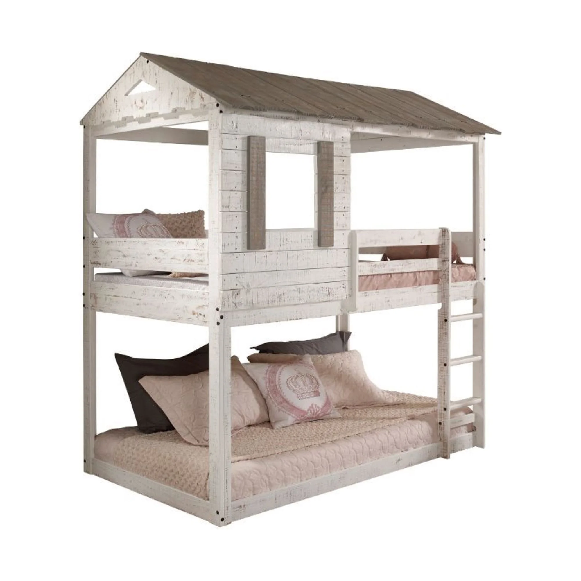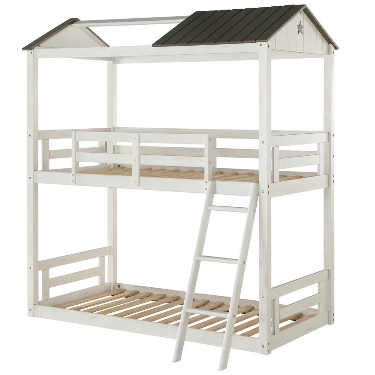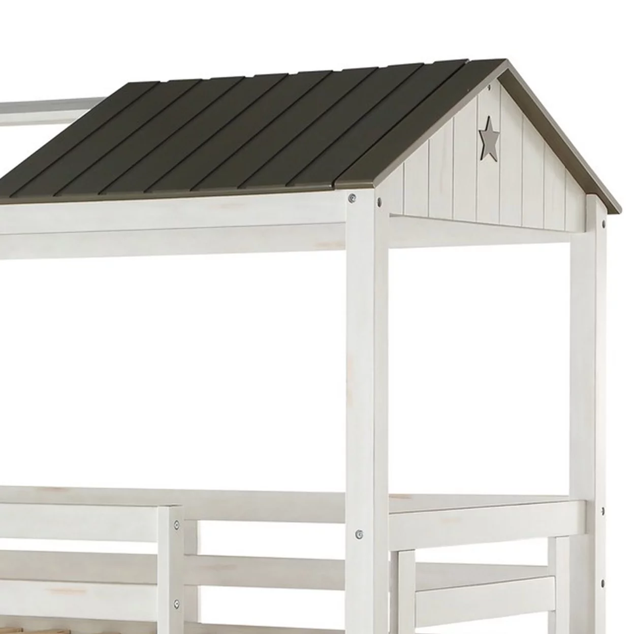 Wooden Twin Size Bunk Bed with Hut Design, White and Gray- Saltoro Sherpi