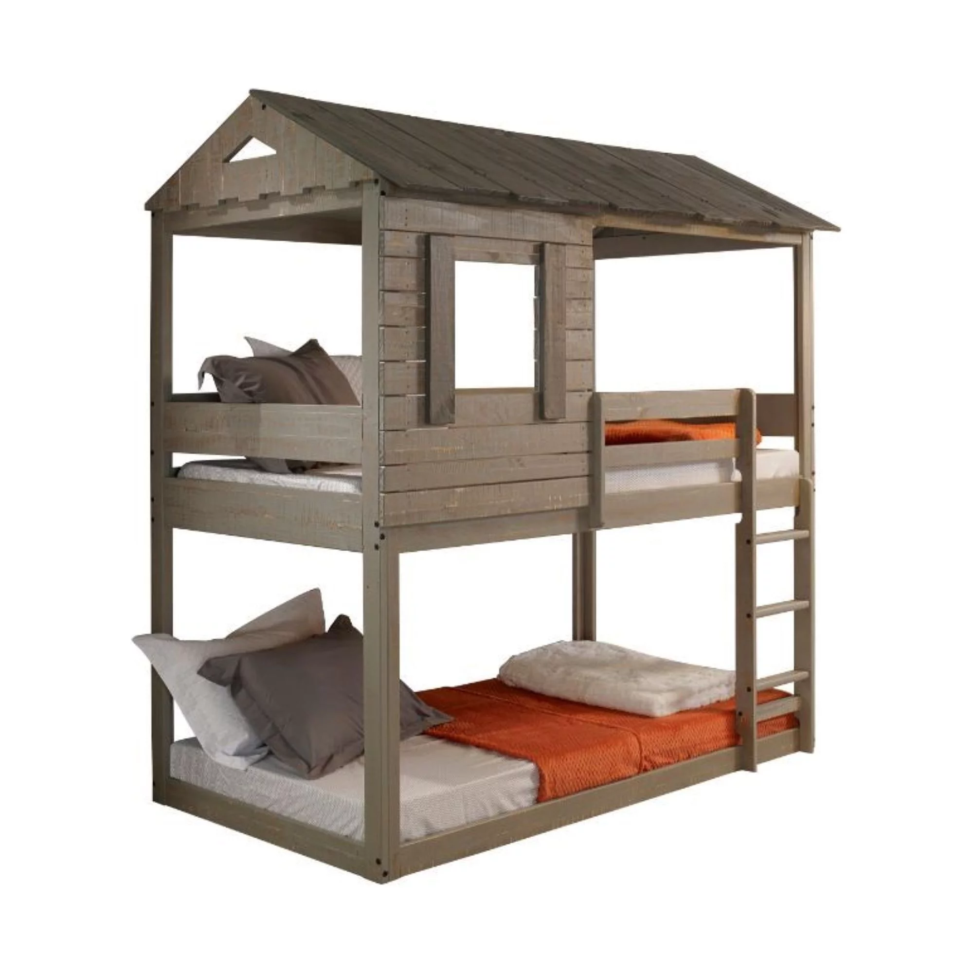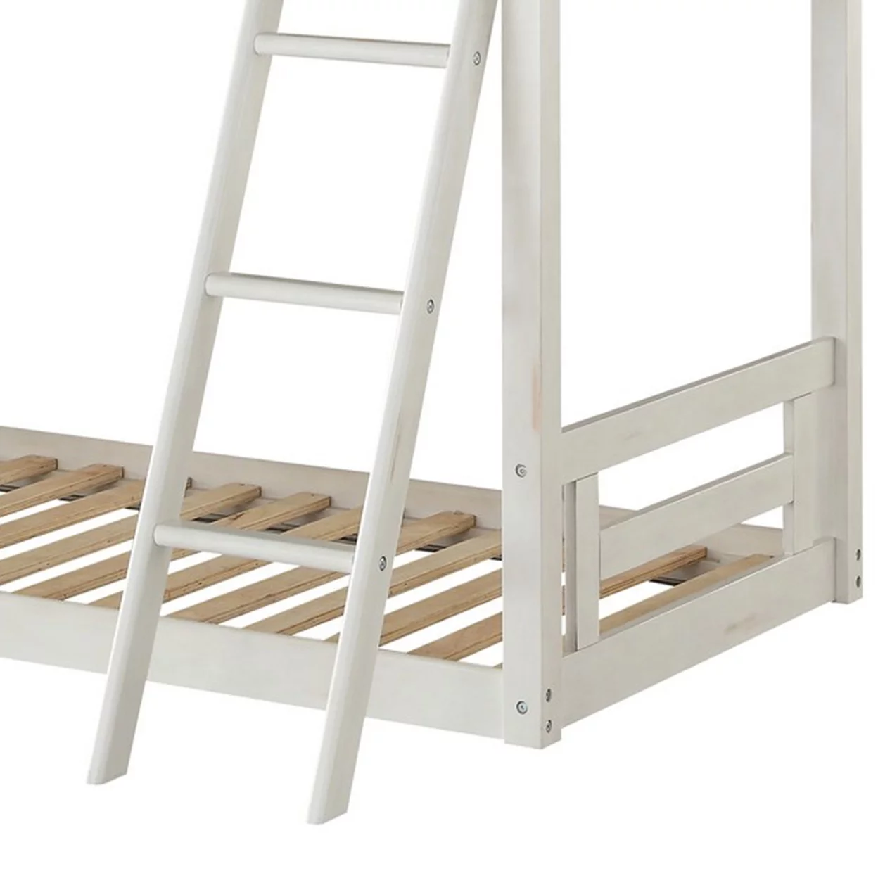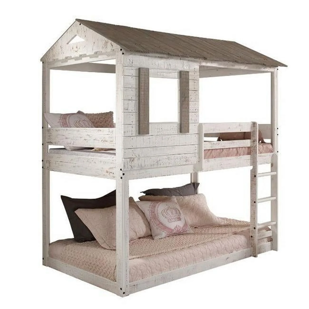 Wooden Twin Size Bunk Bed with Hut Design, White and Gray- Saltoro Sherpi