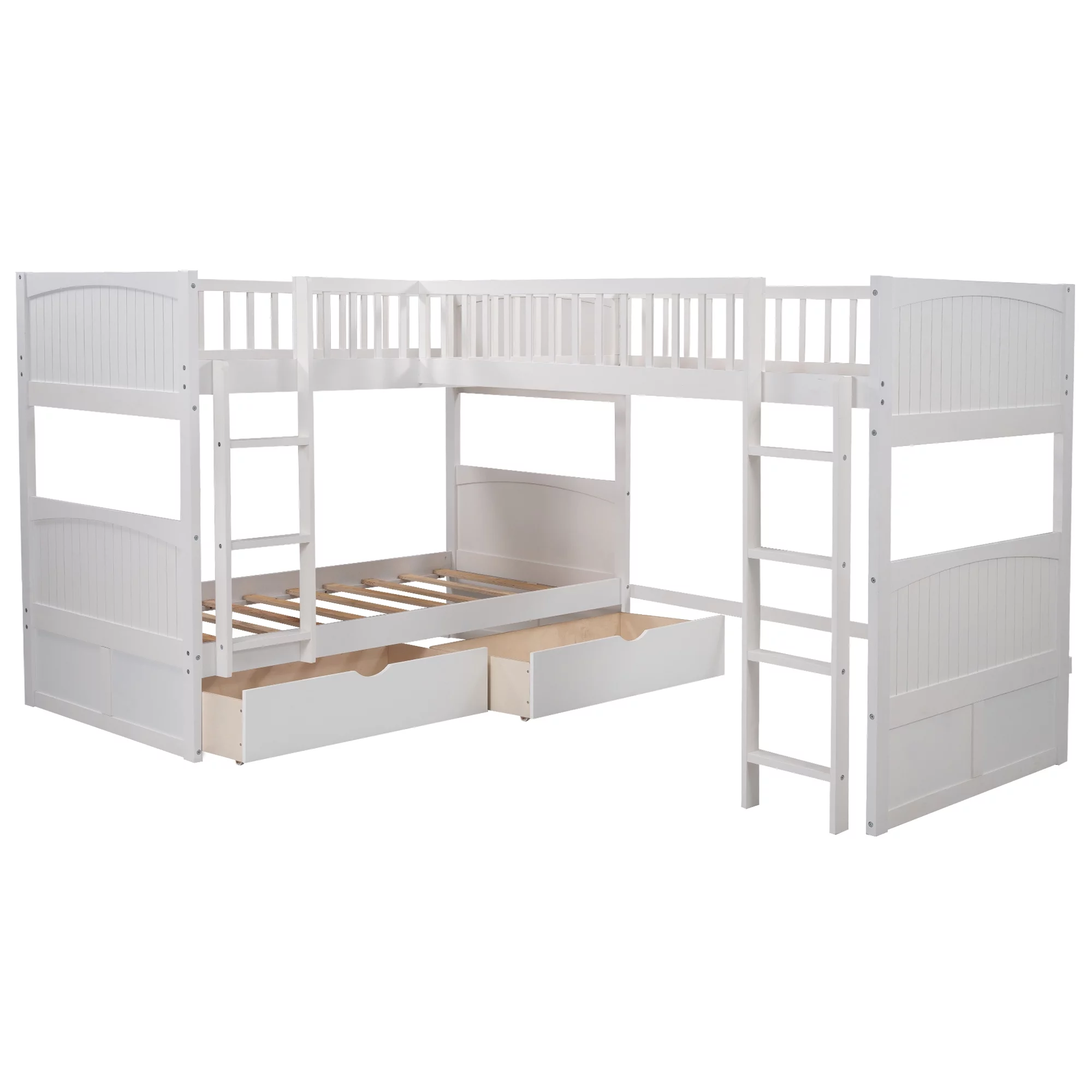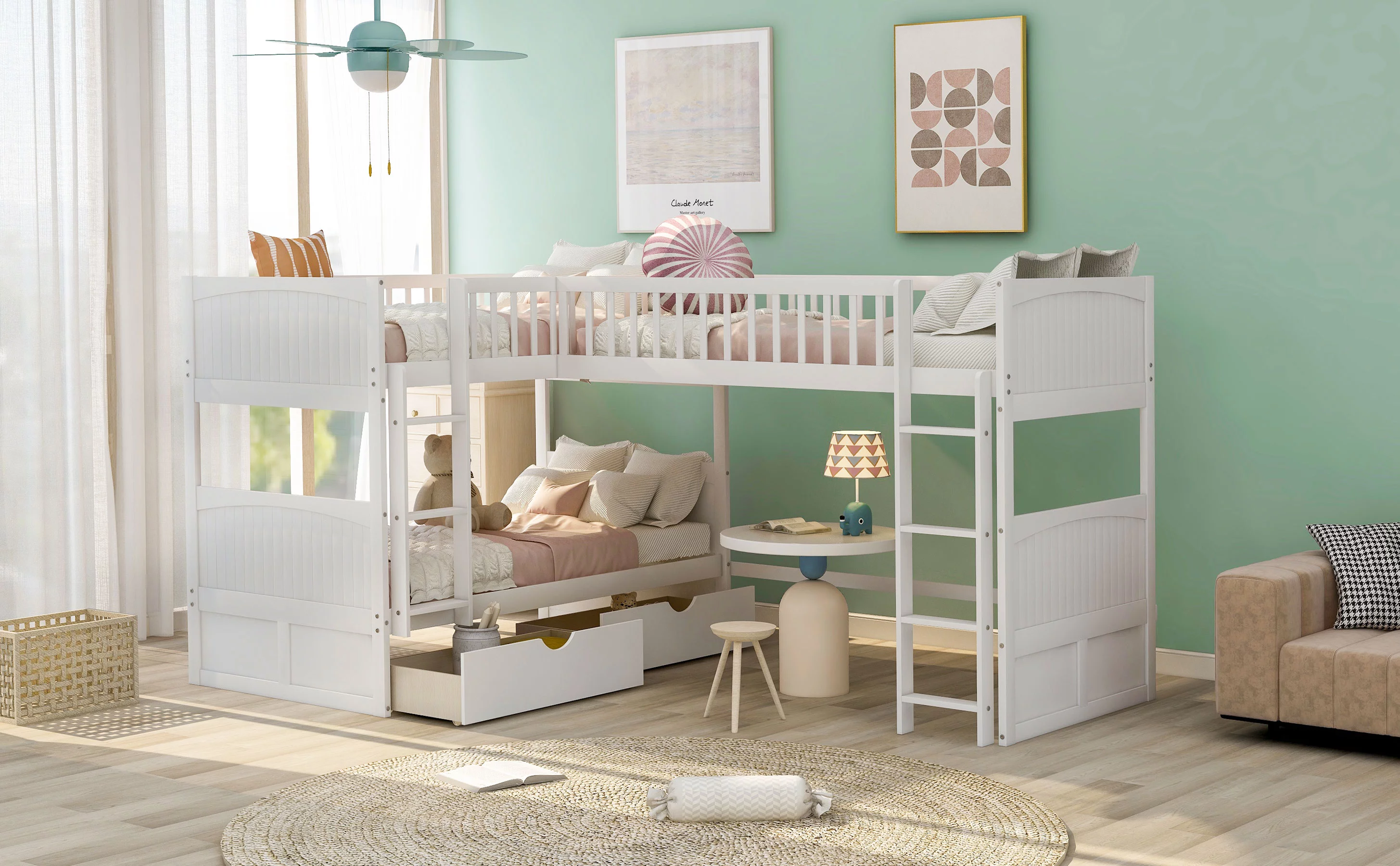 Cottage Kids Furniture L Shaped Bunk Beds with Storage, Slide, & Bottom Guard Rail