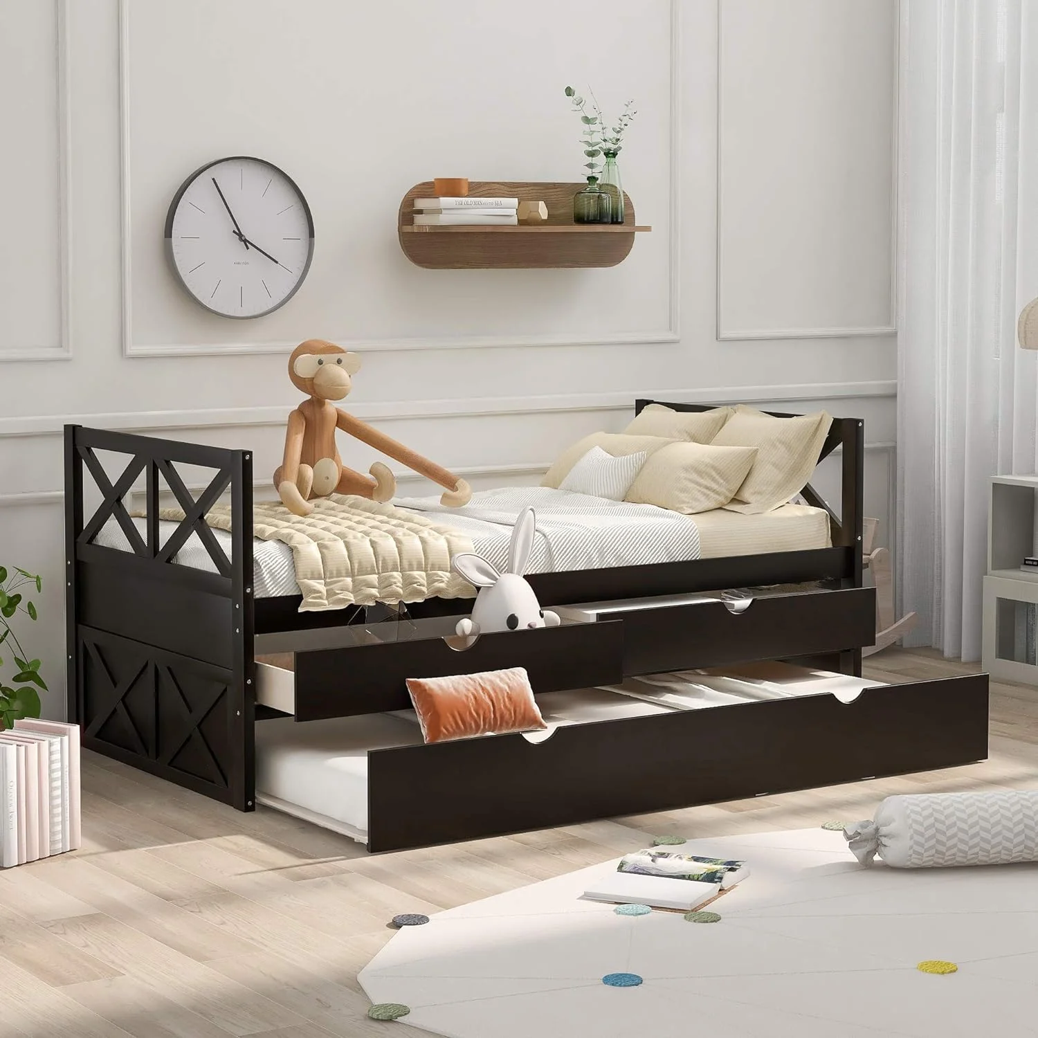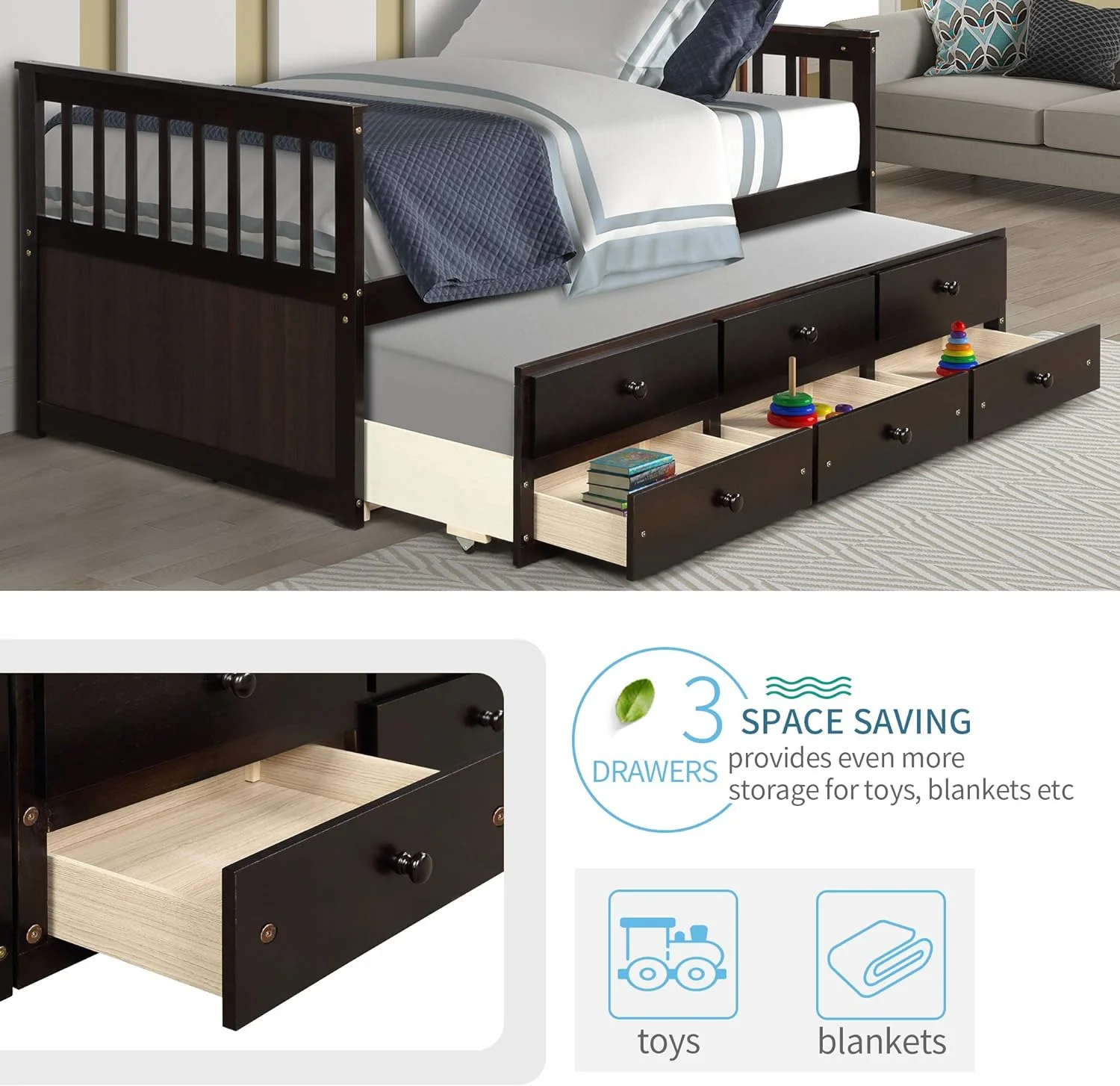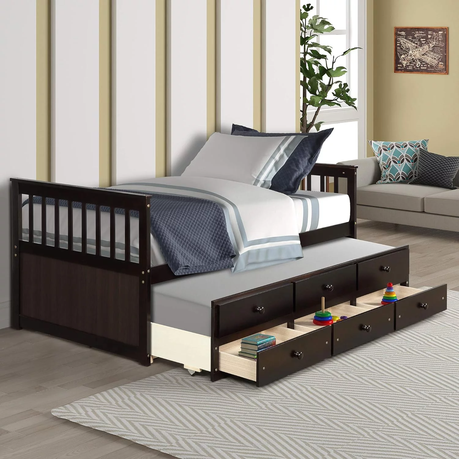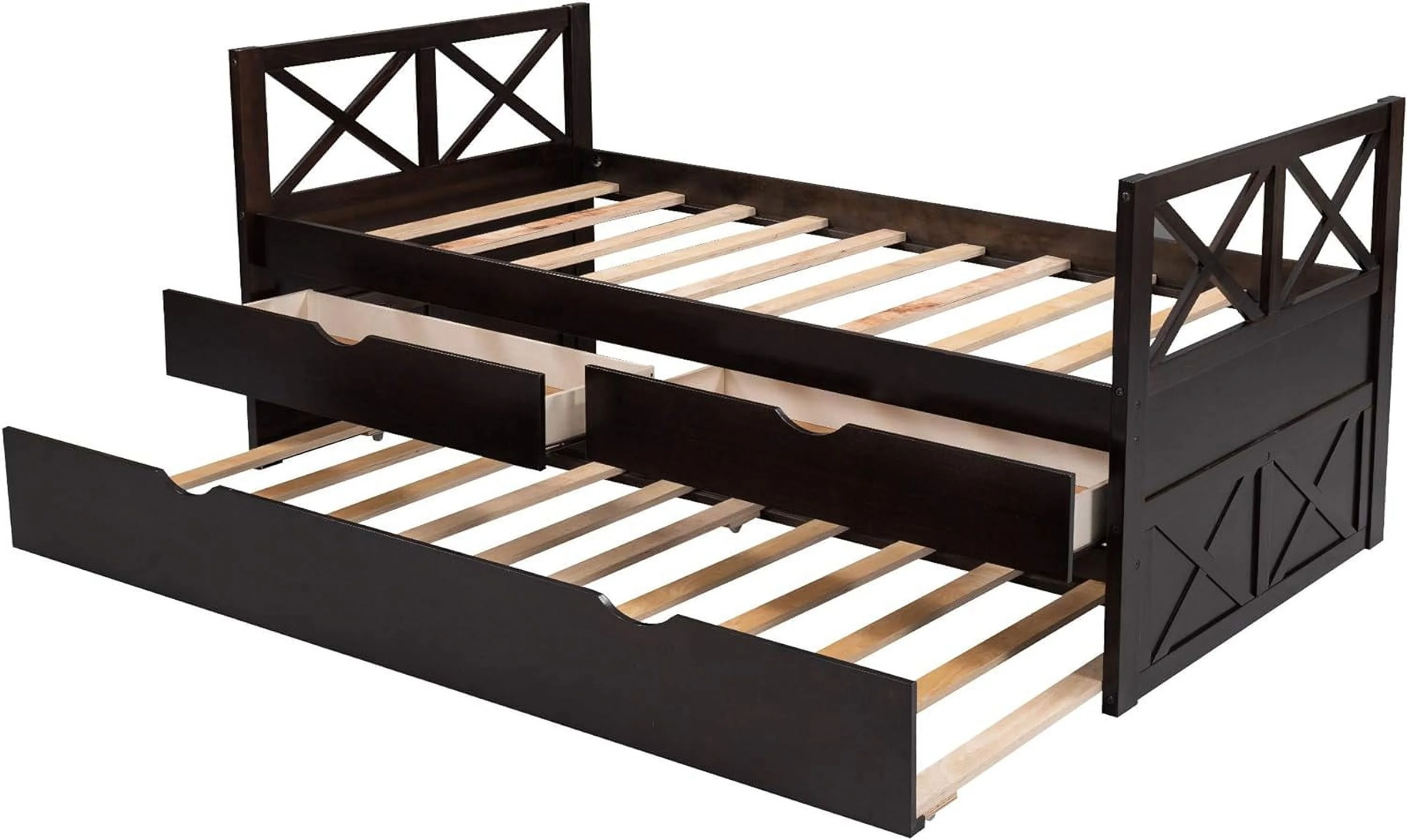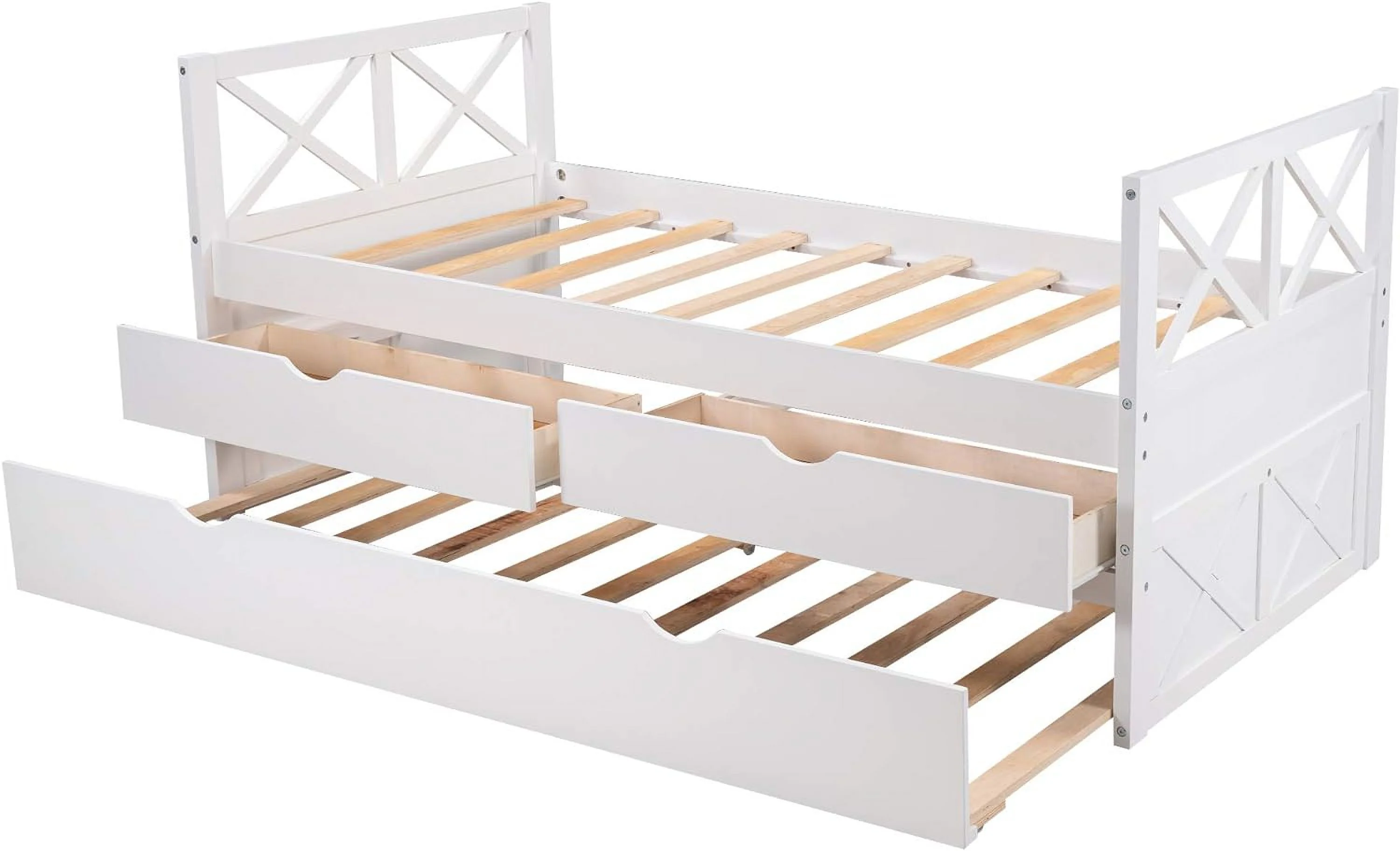 Kuurfuurdo Daybed with Trundle and Storage Drawers, Twin Size Solid Wood Platform Bed Frame,Gray