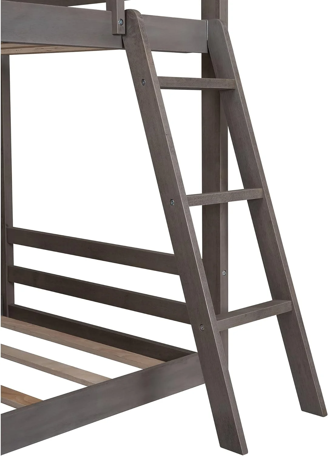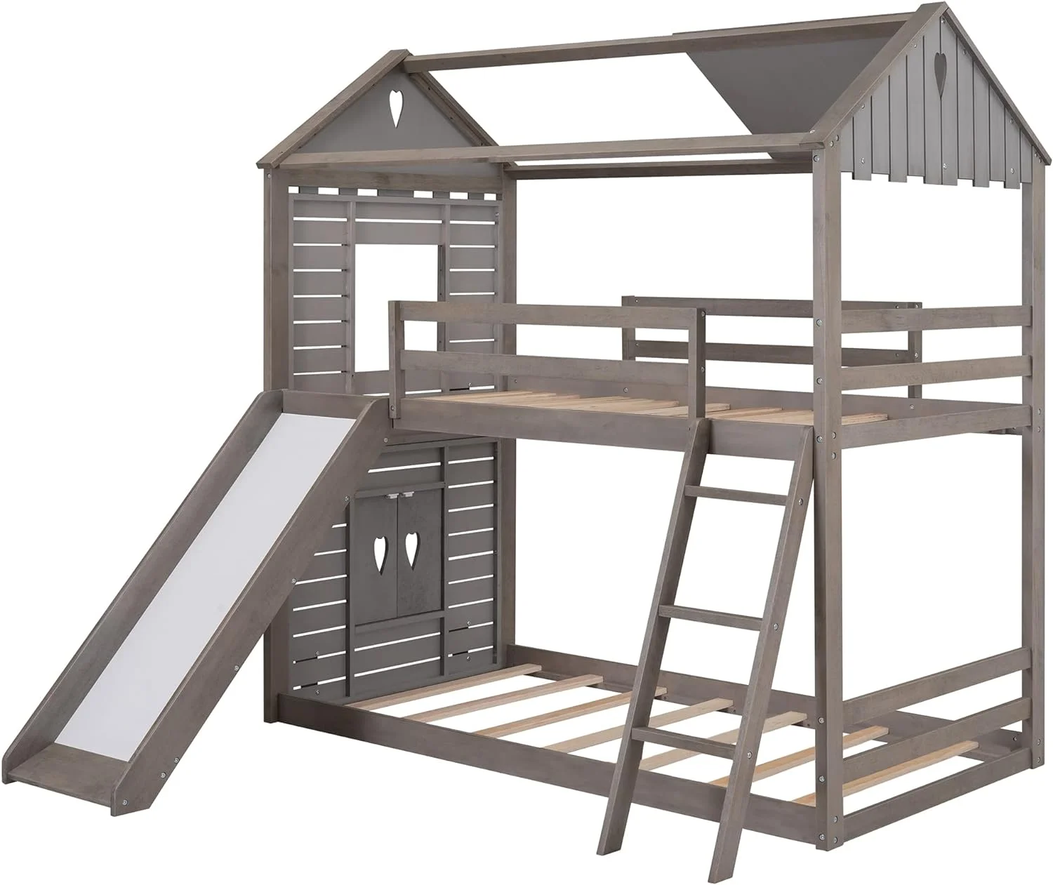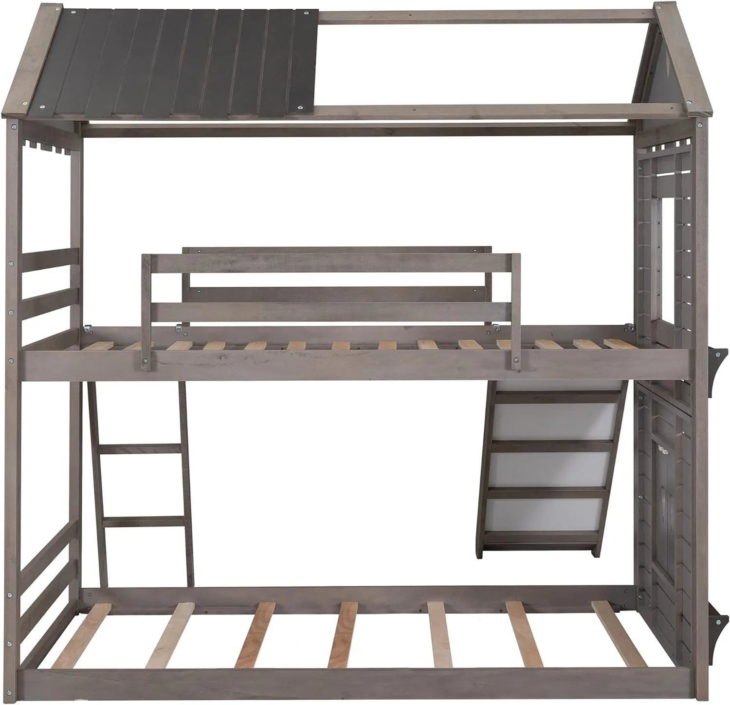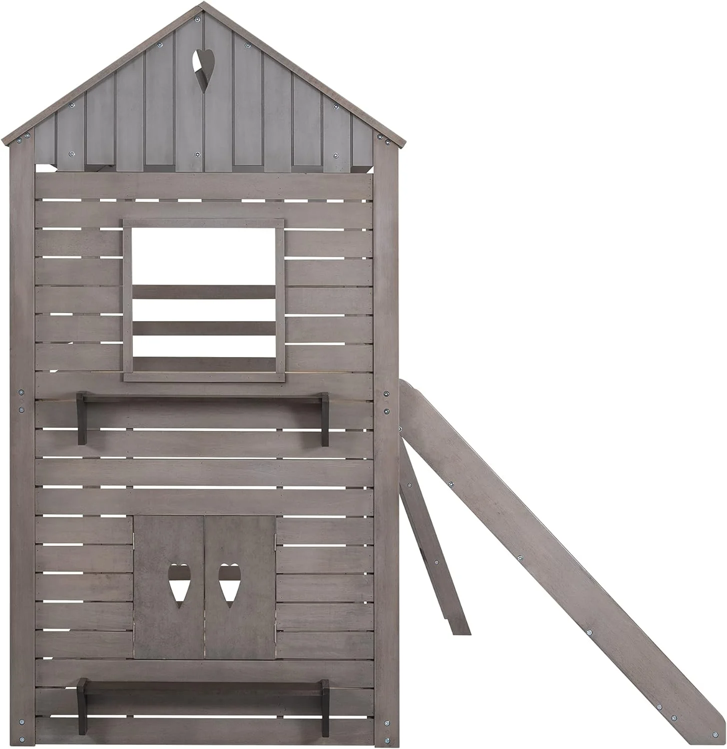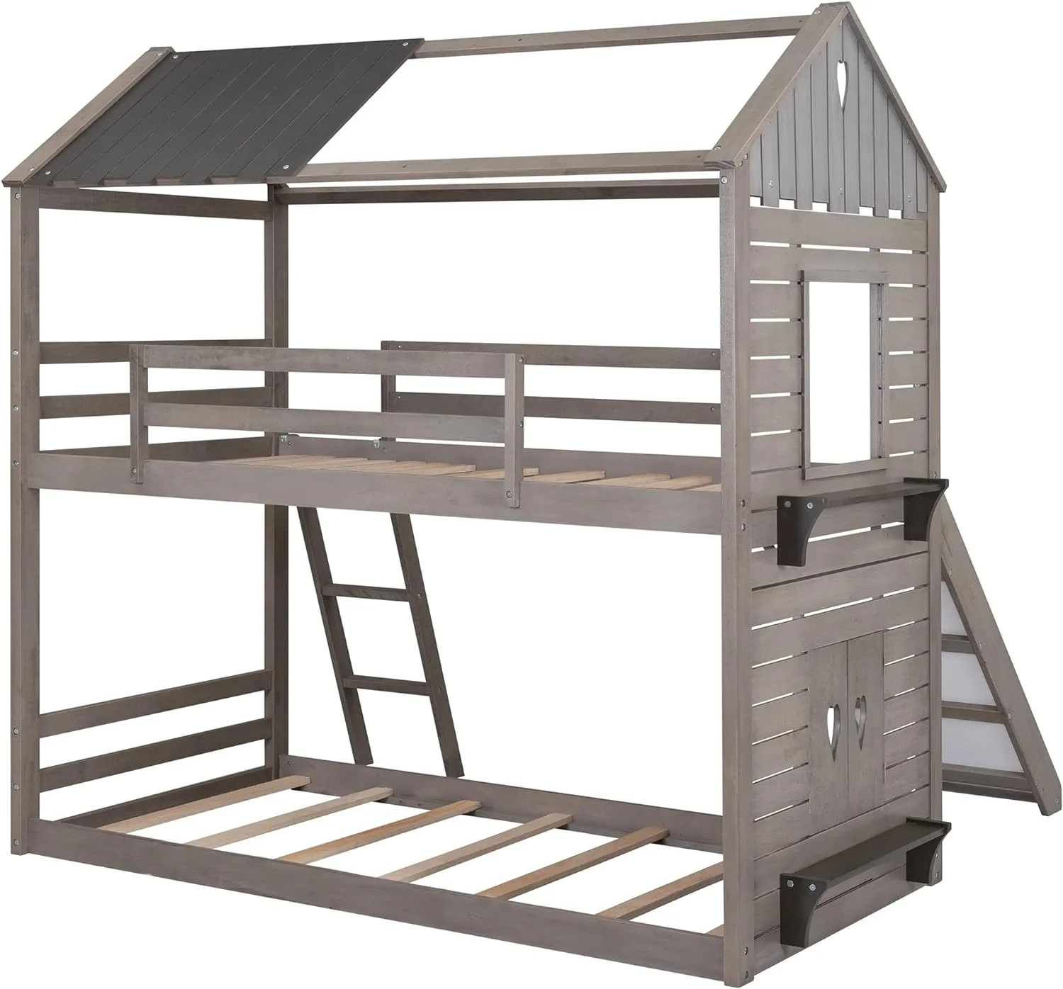 House Bunk Bed For Bedroom, Over Wooden Bed Wih Slide, Ladder, Roof, Window For Kids eens, Anique Gray