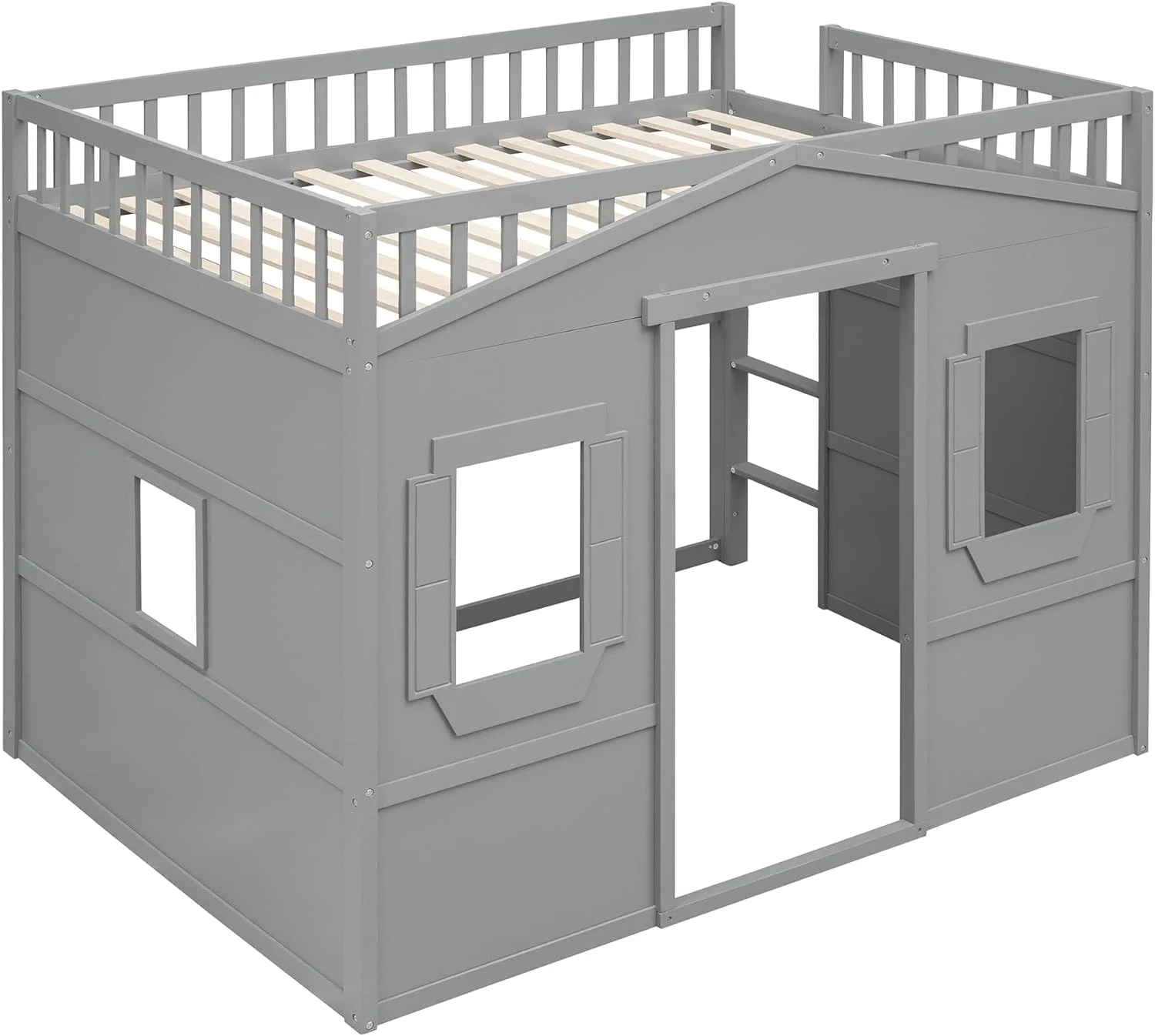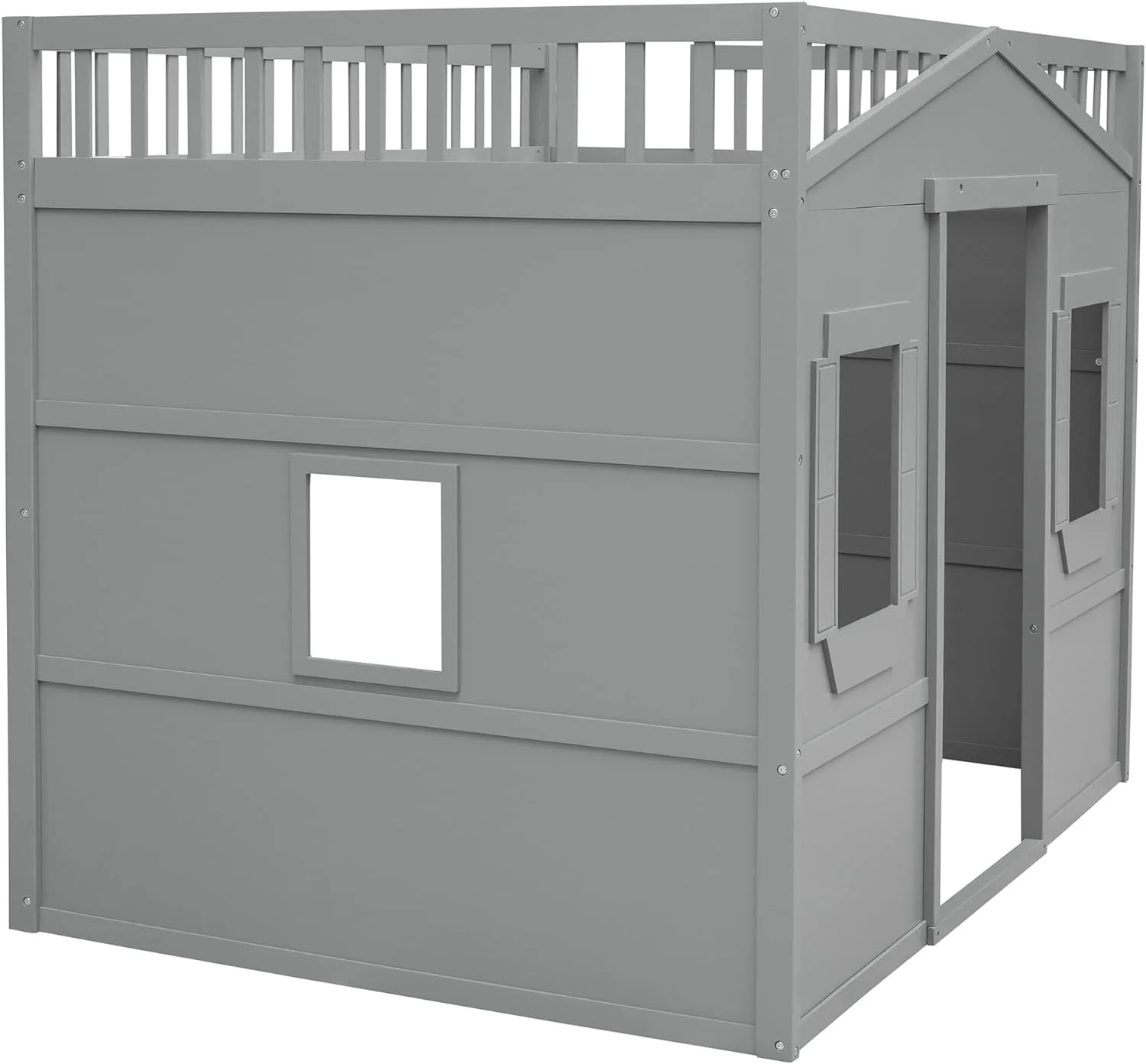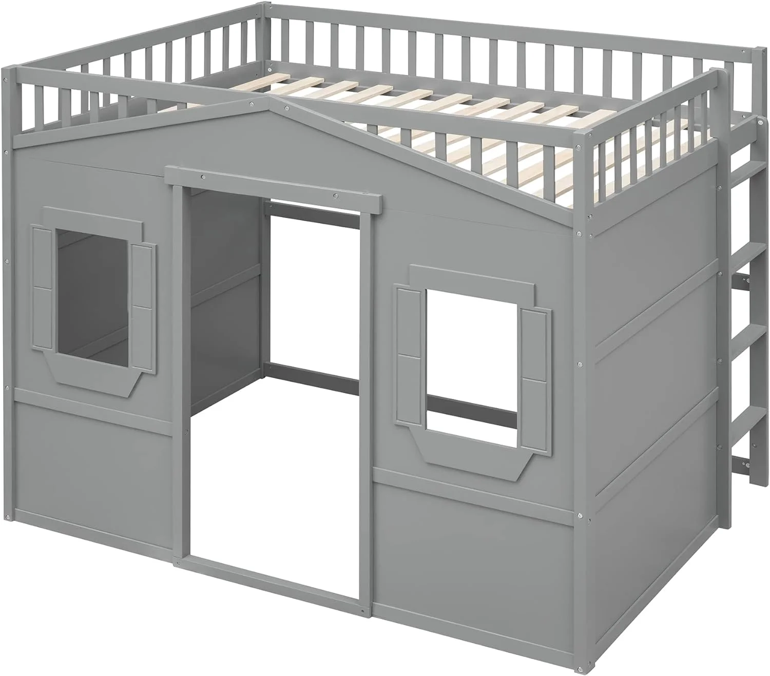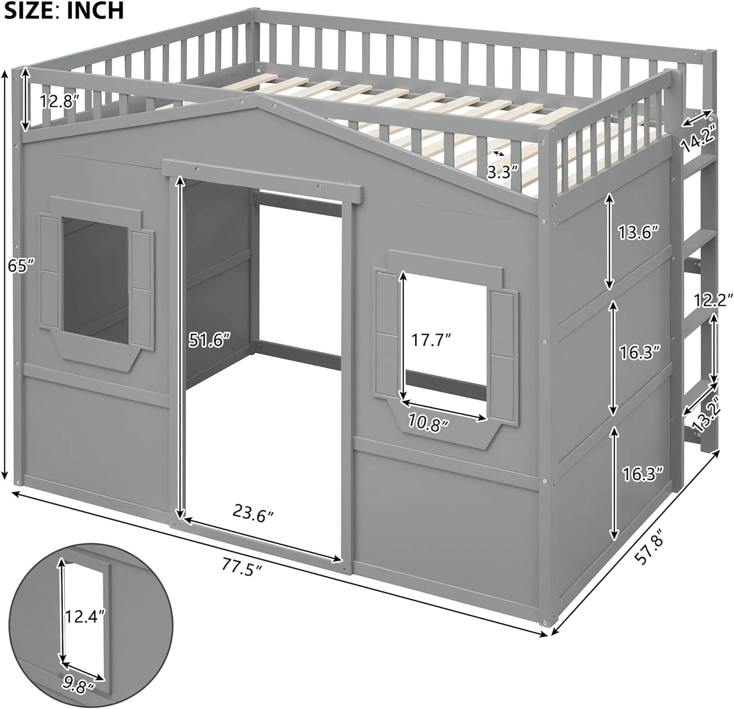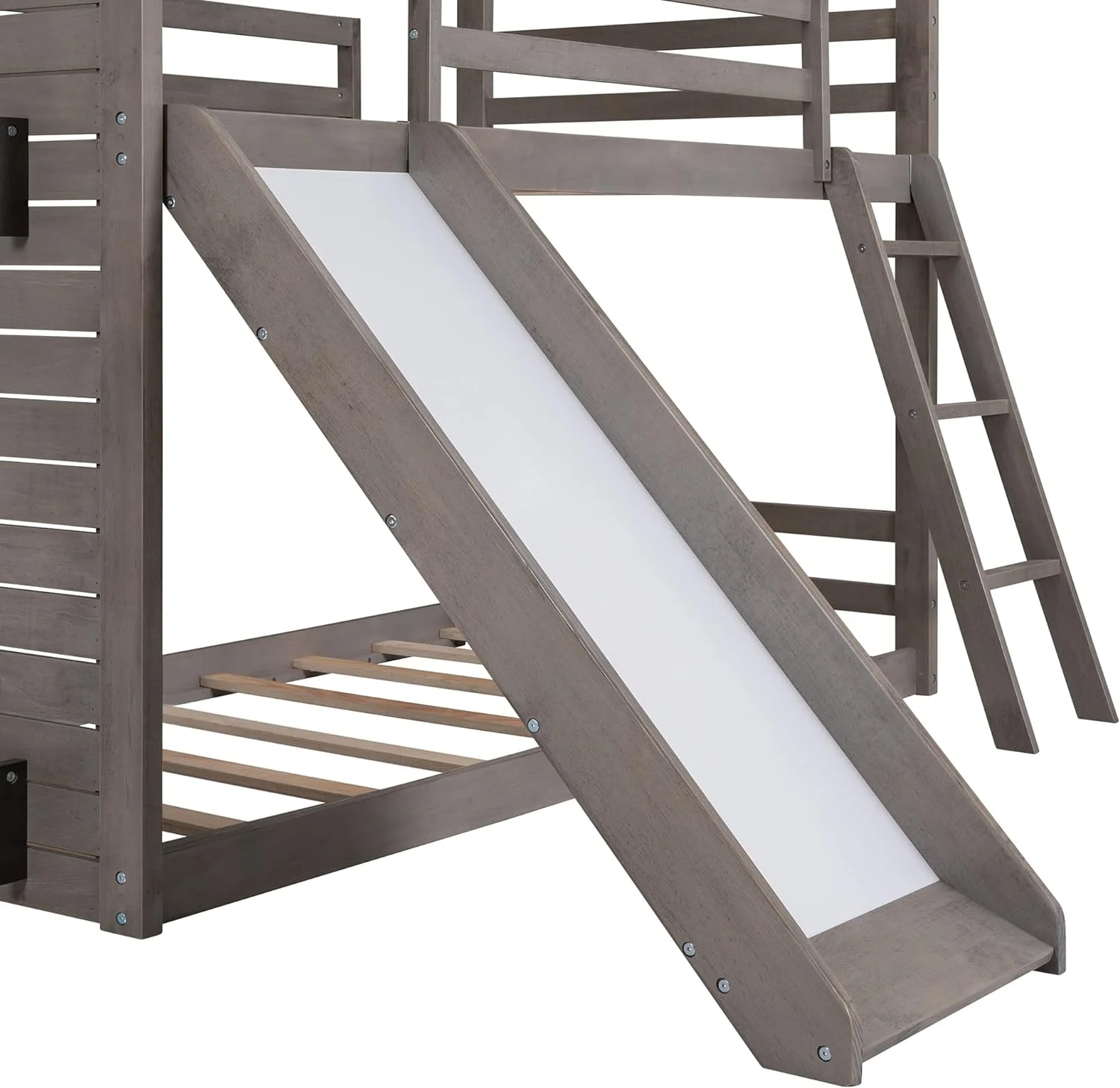 House Bunk Bed For Bedroom, Over Wooden Bed Wih Slide, Ladder, Roof, Window For Kids eens, Anique Gray