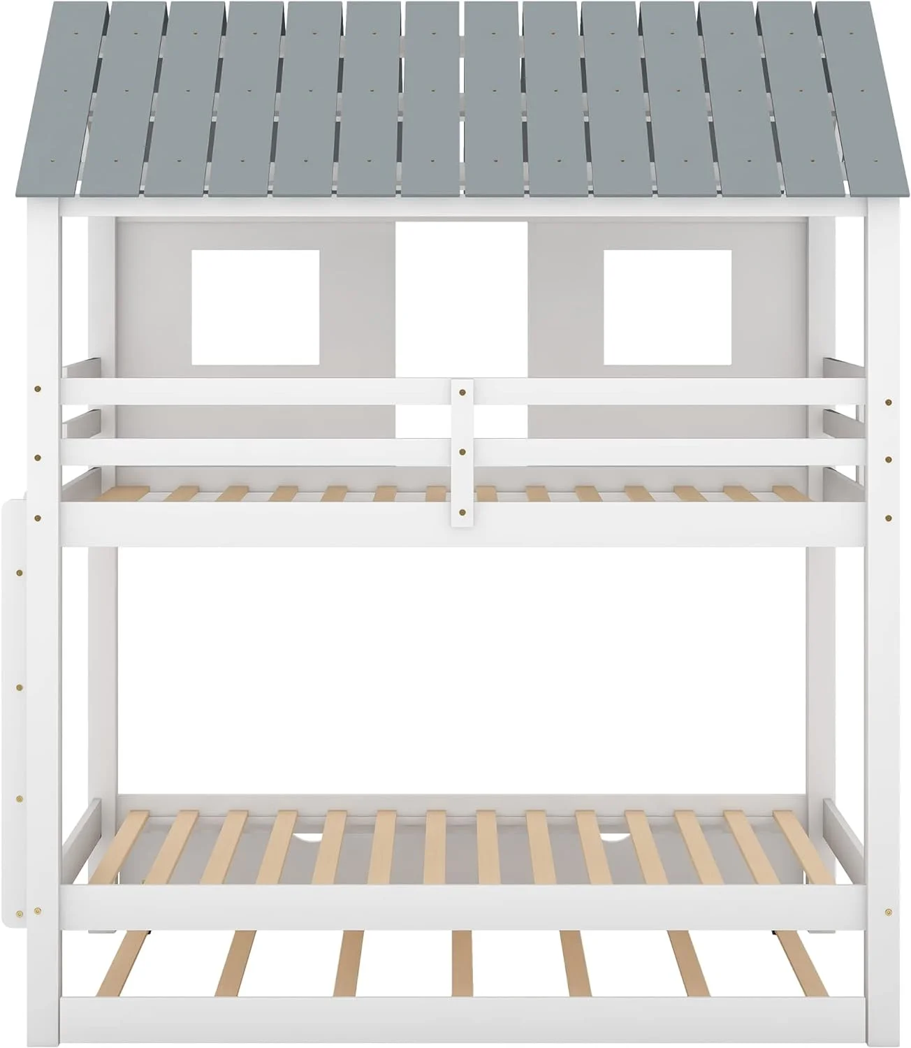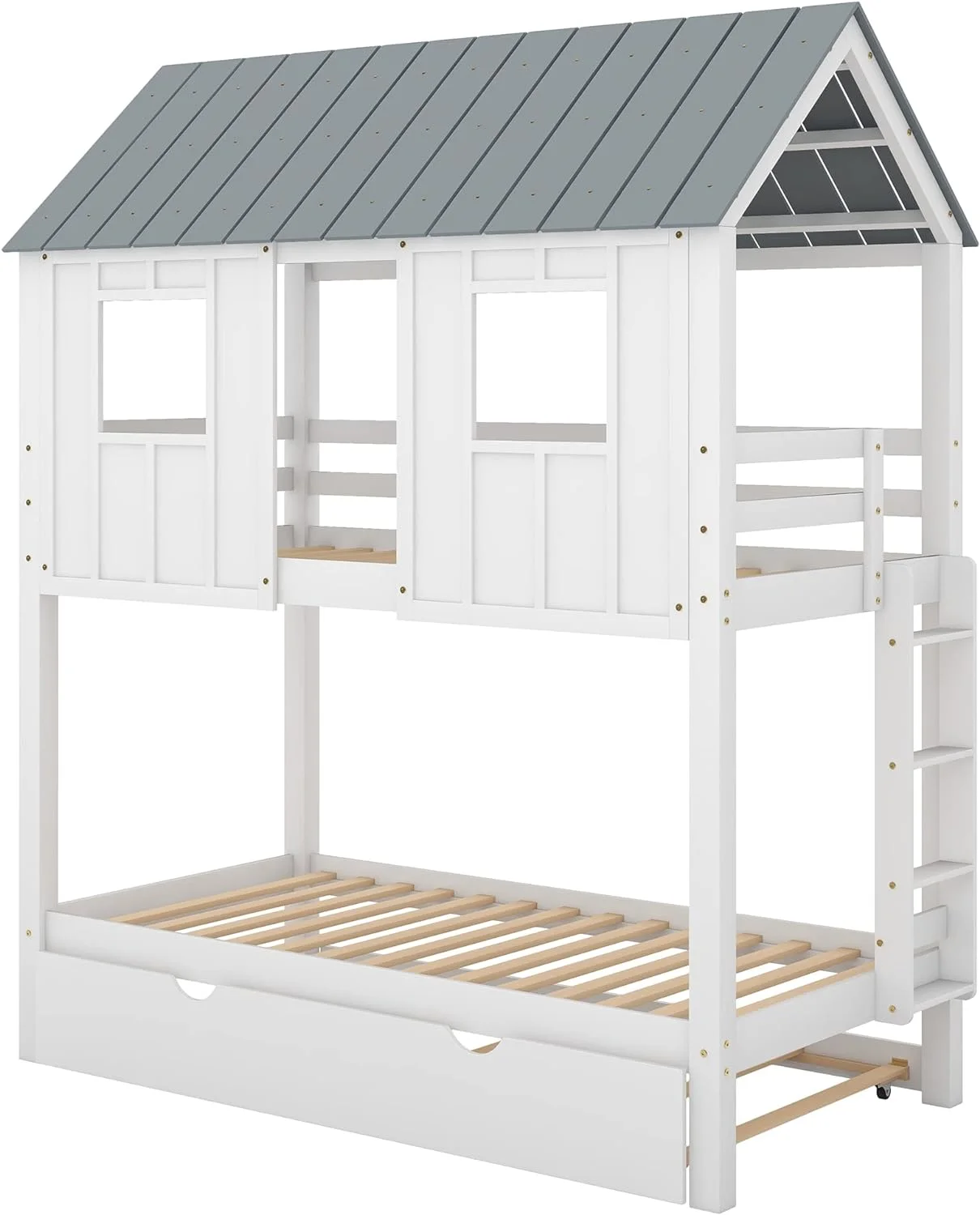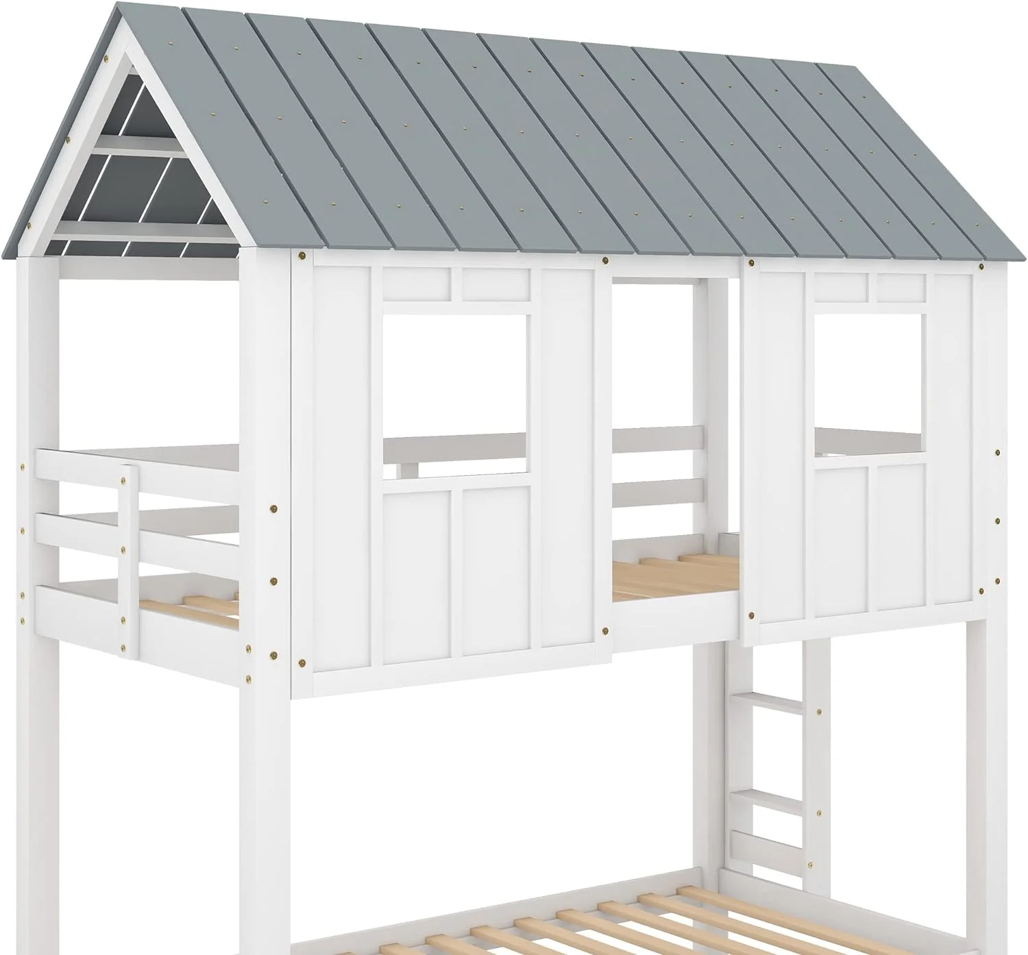 House Bunk Bed Wih rundle For Bedroom, Wood Over Bunk Beds Wih Roof And Windows For Kids,No Box Spring Needed, Whie