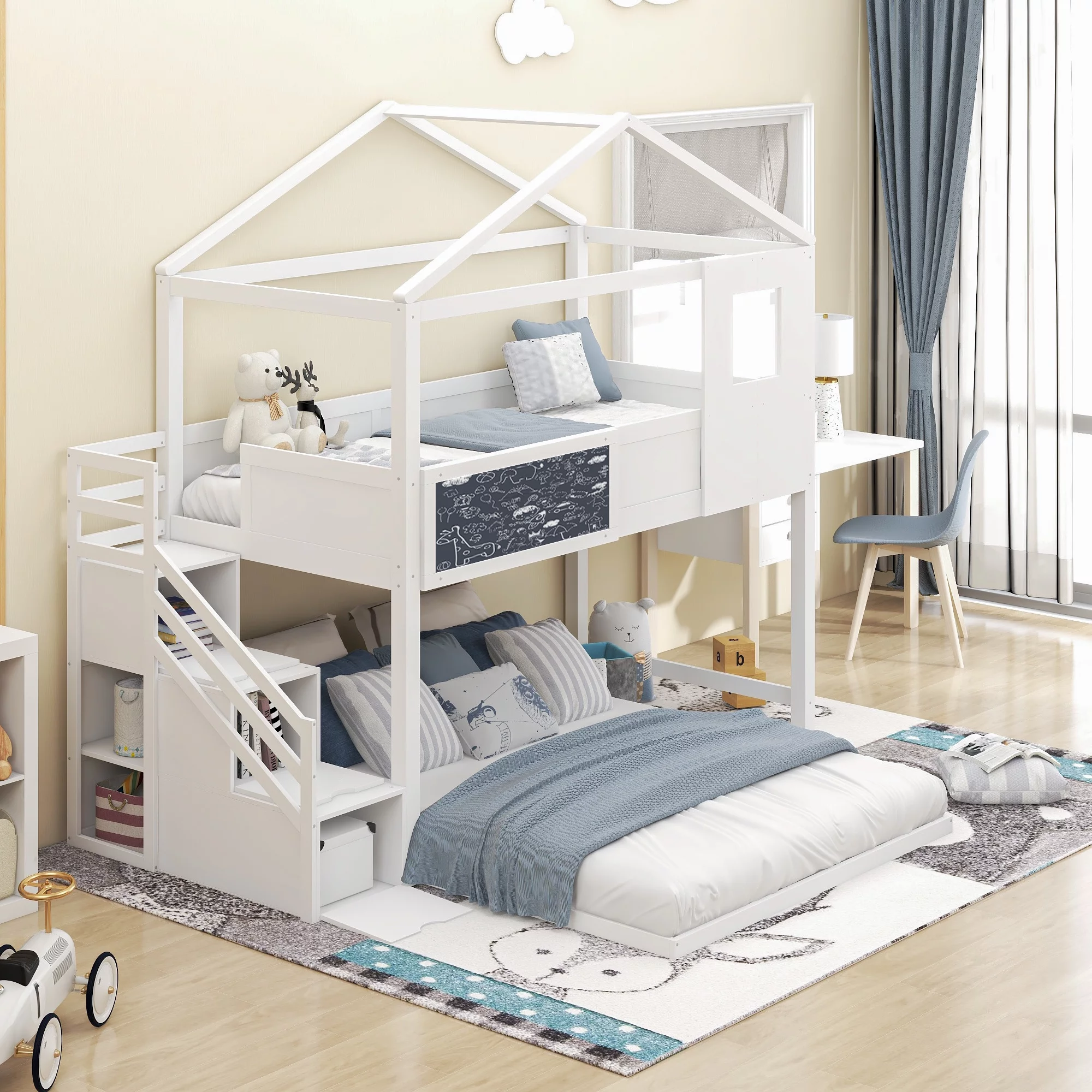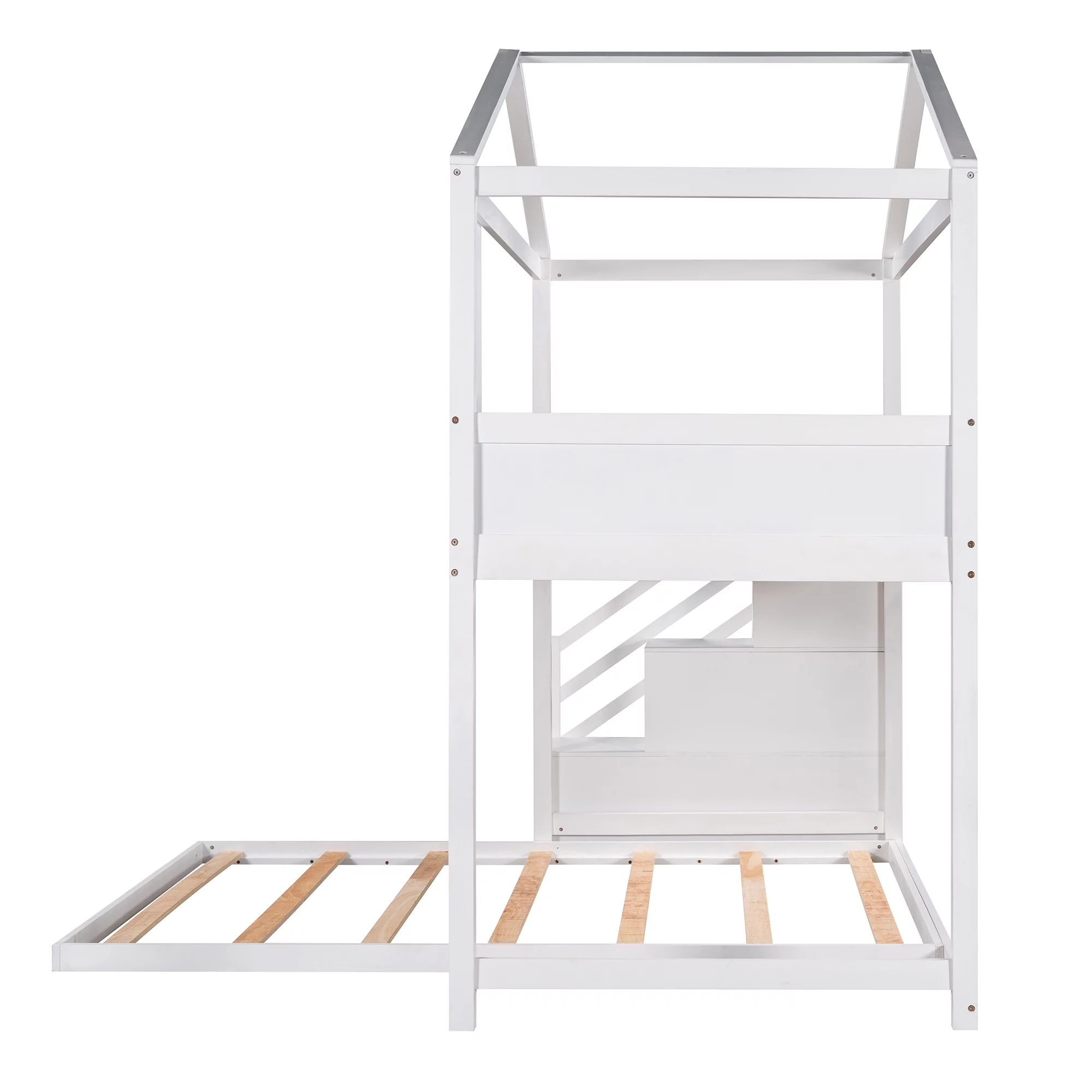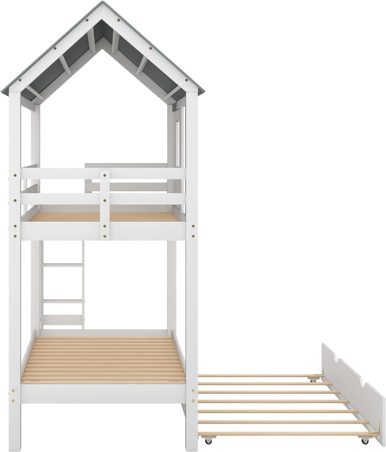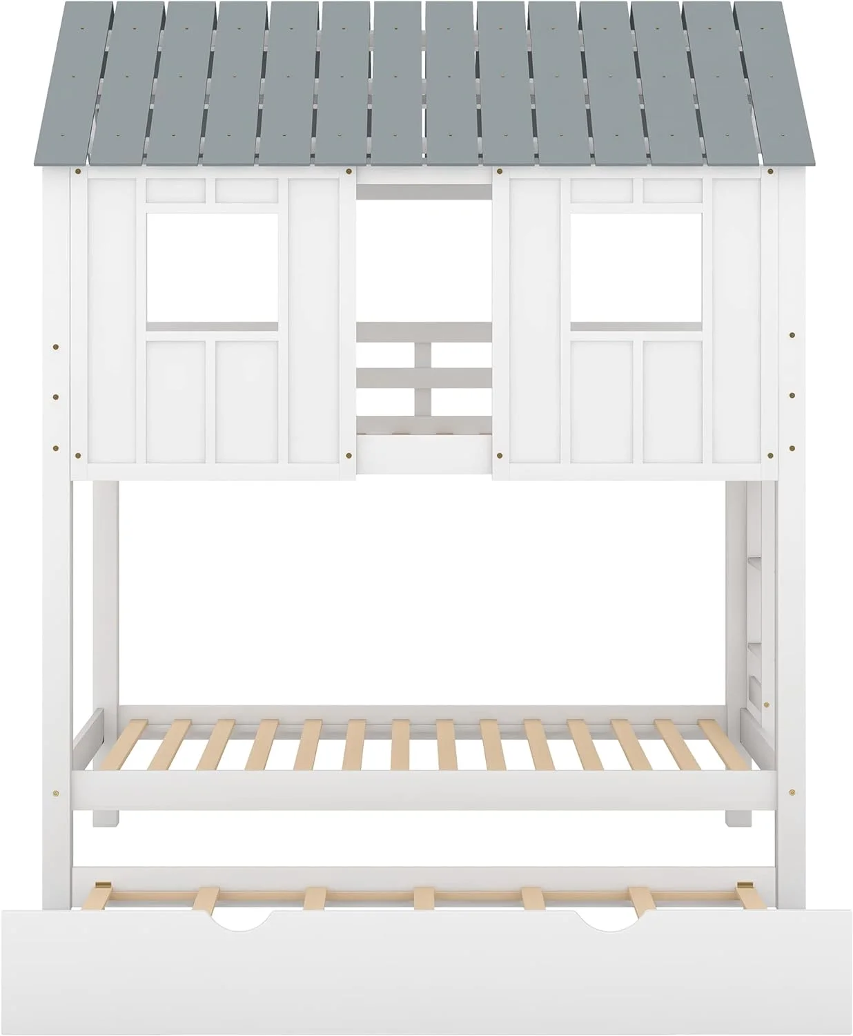 House Bunk Bed Wih rundle For Bedroom, Wood Over Bunk Beds Wih Roof And Windows For Kids,No Box Spring Needed, Whie