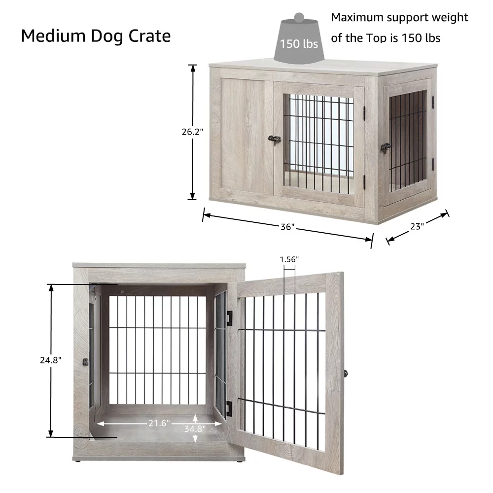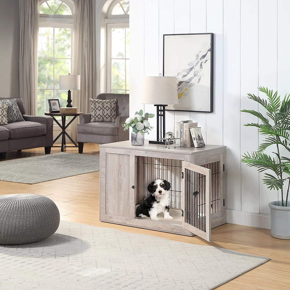 Unipaws Furniture Style Dog Crate, Wooden Dog House with Double Doors, Weathered Gray