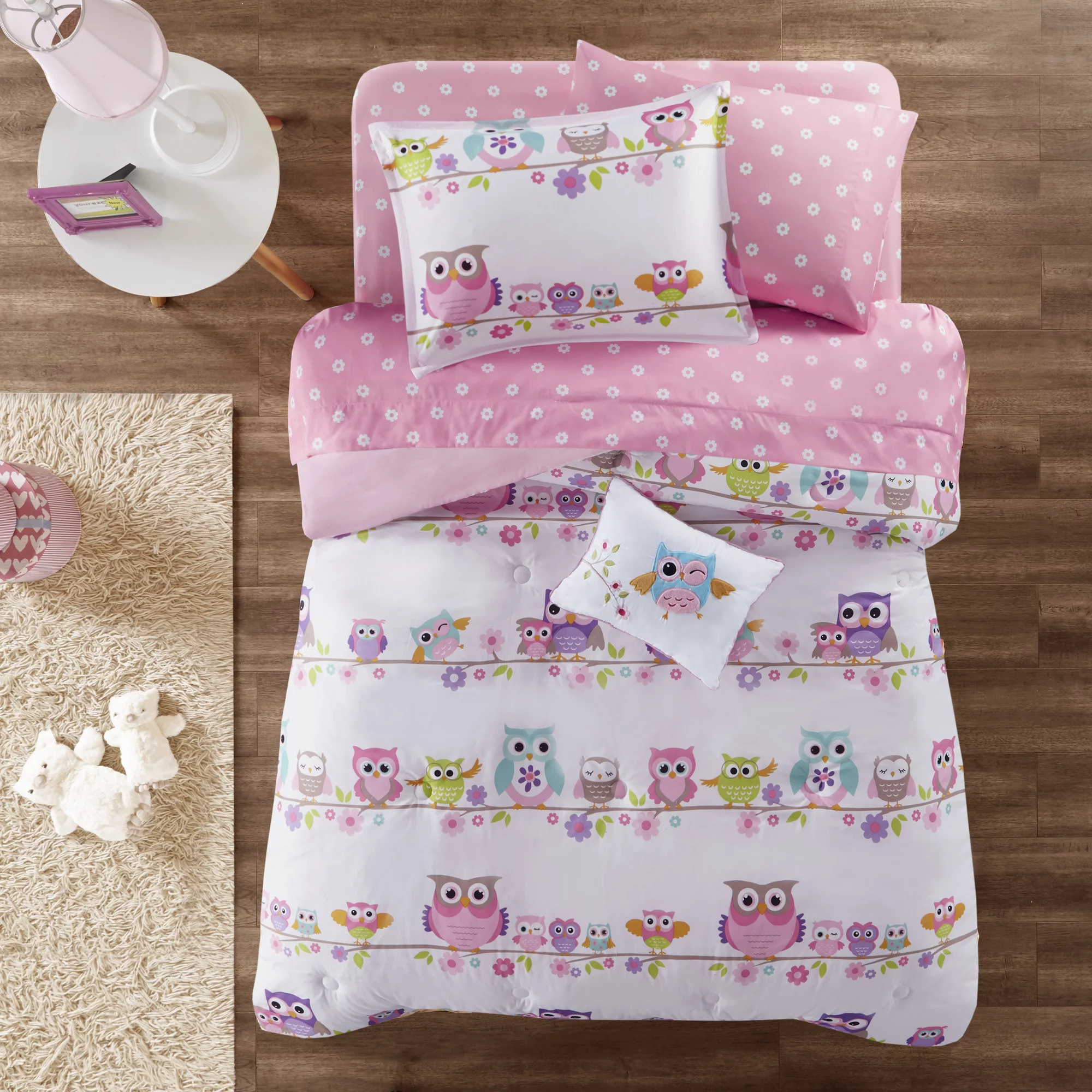 Mi Zone Kids Twin Child Bed in a Bag Owl Print 6-Piece Comforter Set with Bed Sheets, White