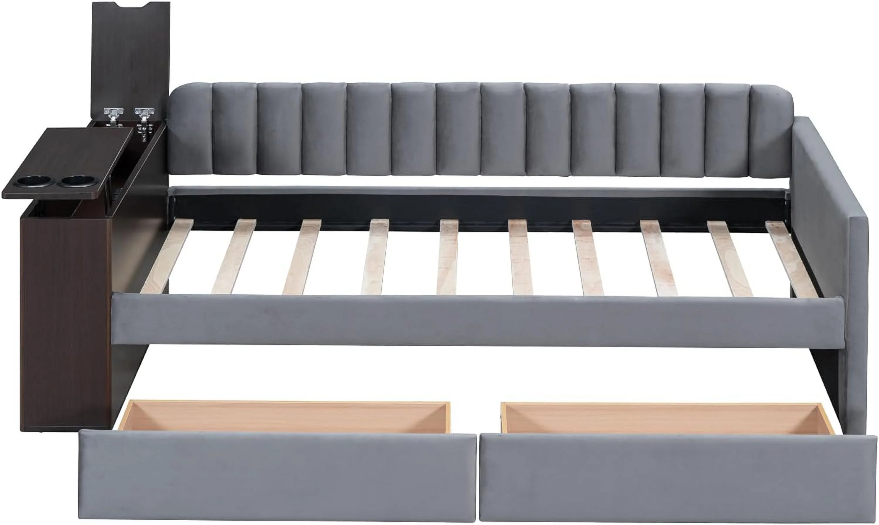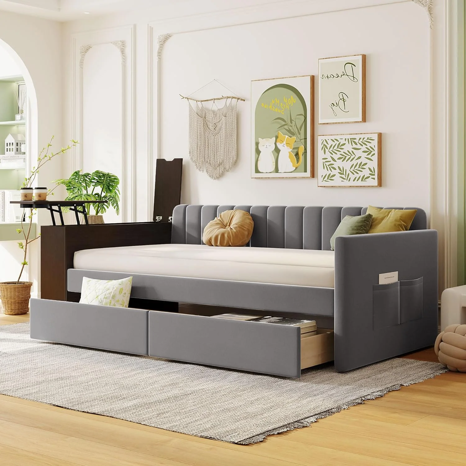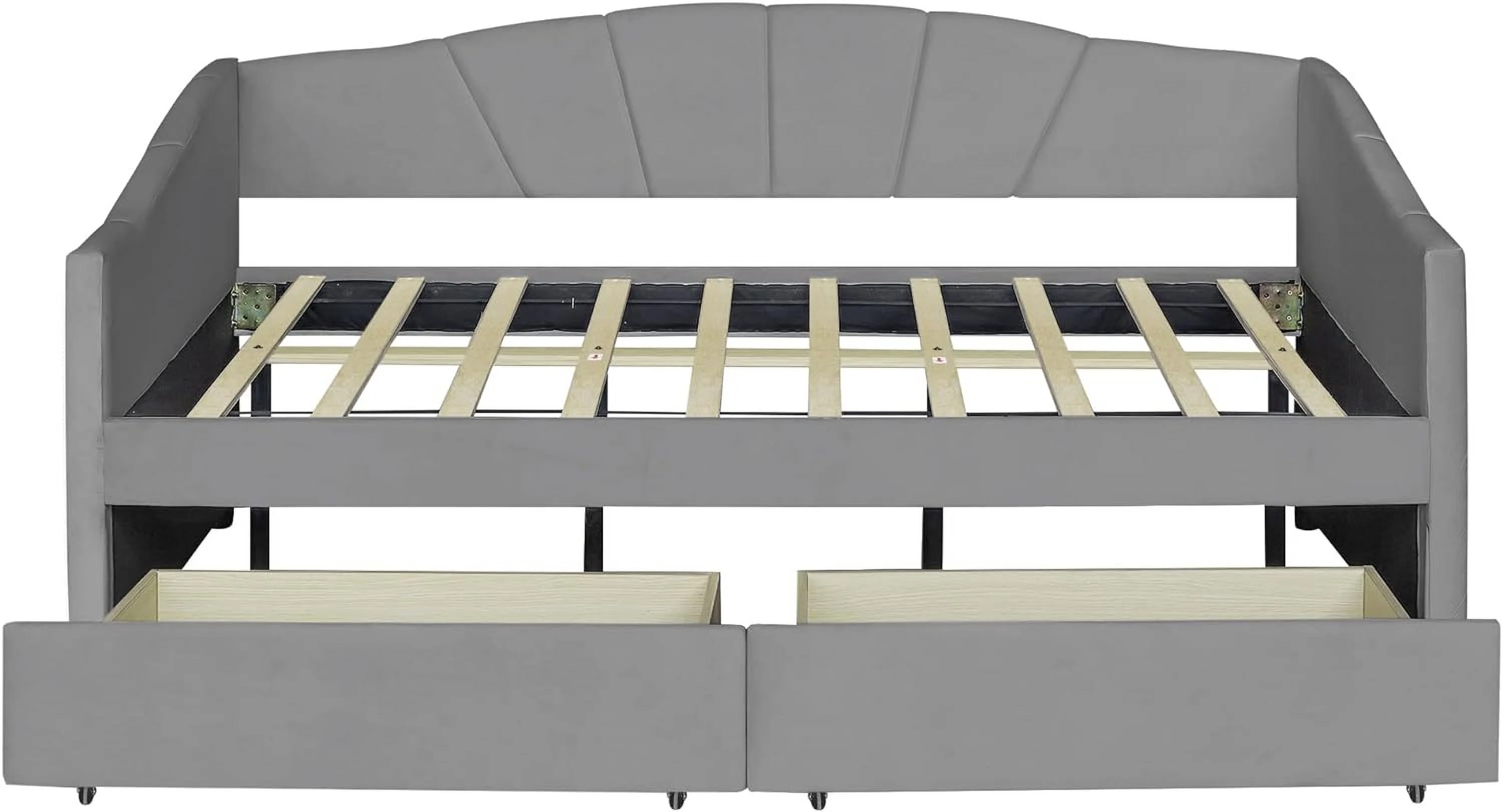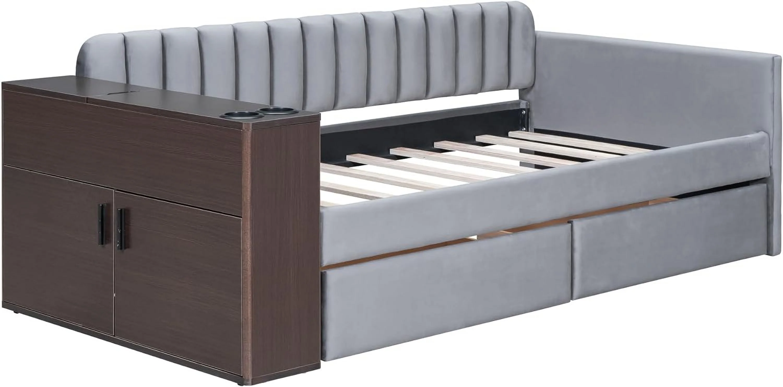 CoSoTower Twin Size Upholstered Daybed with Drawers, Wood Slat Support, Gray