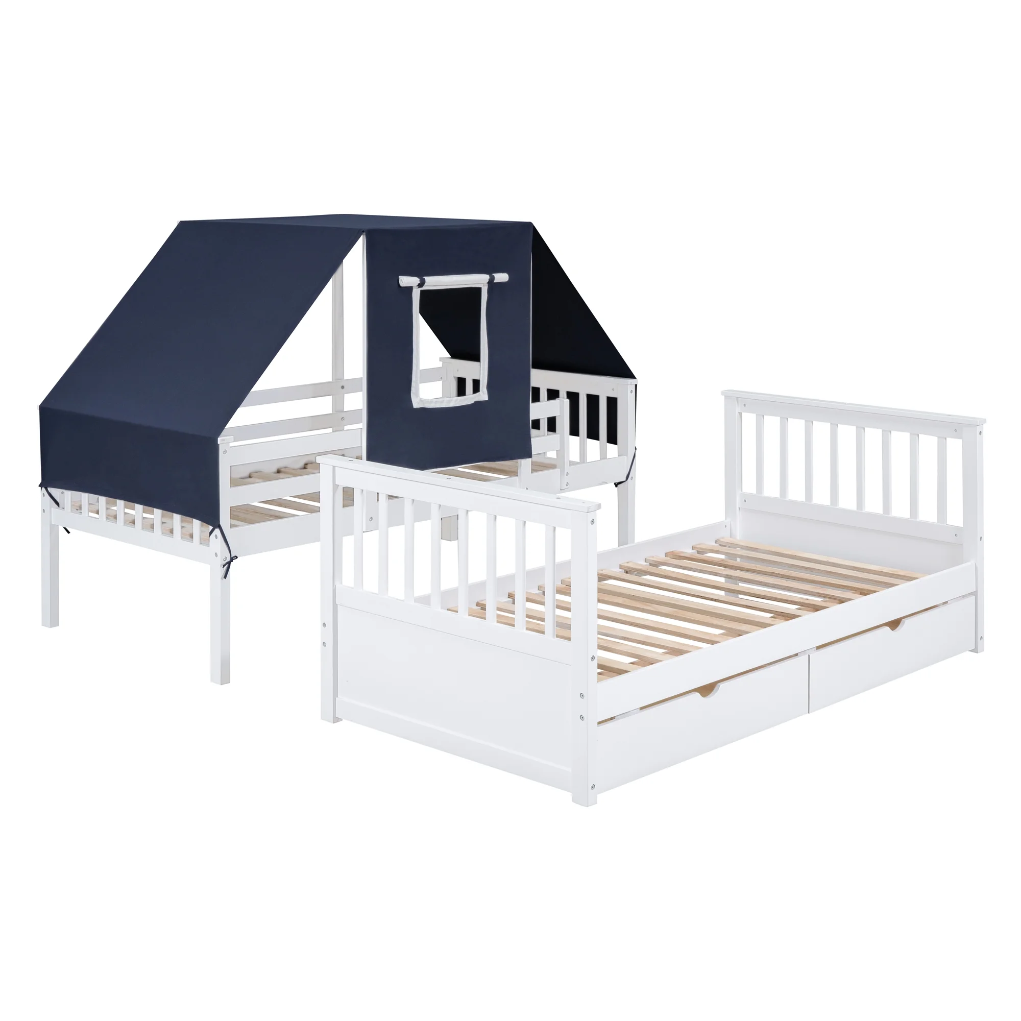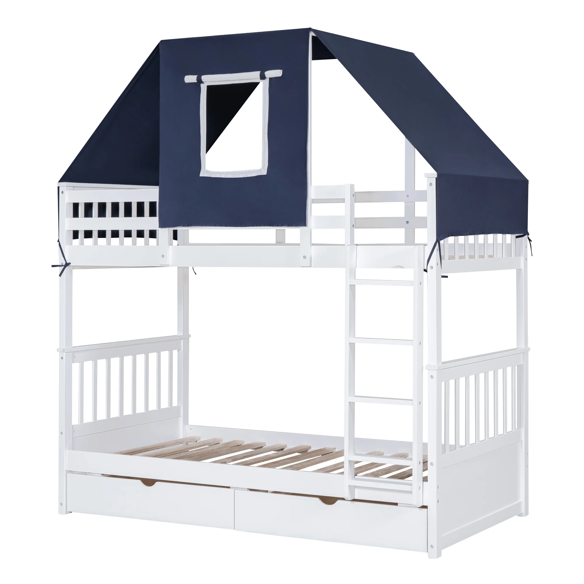 Churanty Twin Over Twin Bunk Bed Wood Bed with Tent and Drawers, White+Blue Tent