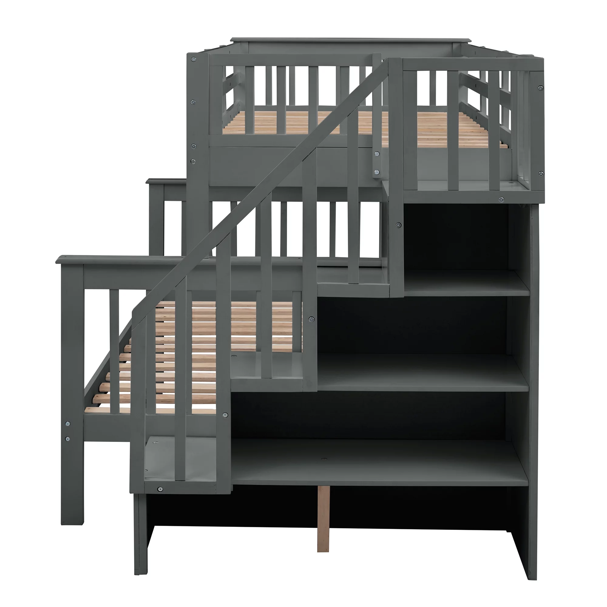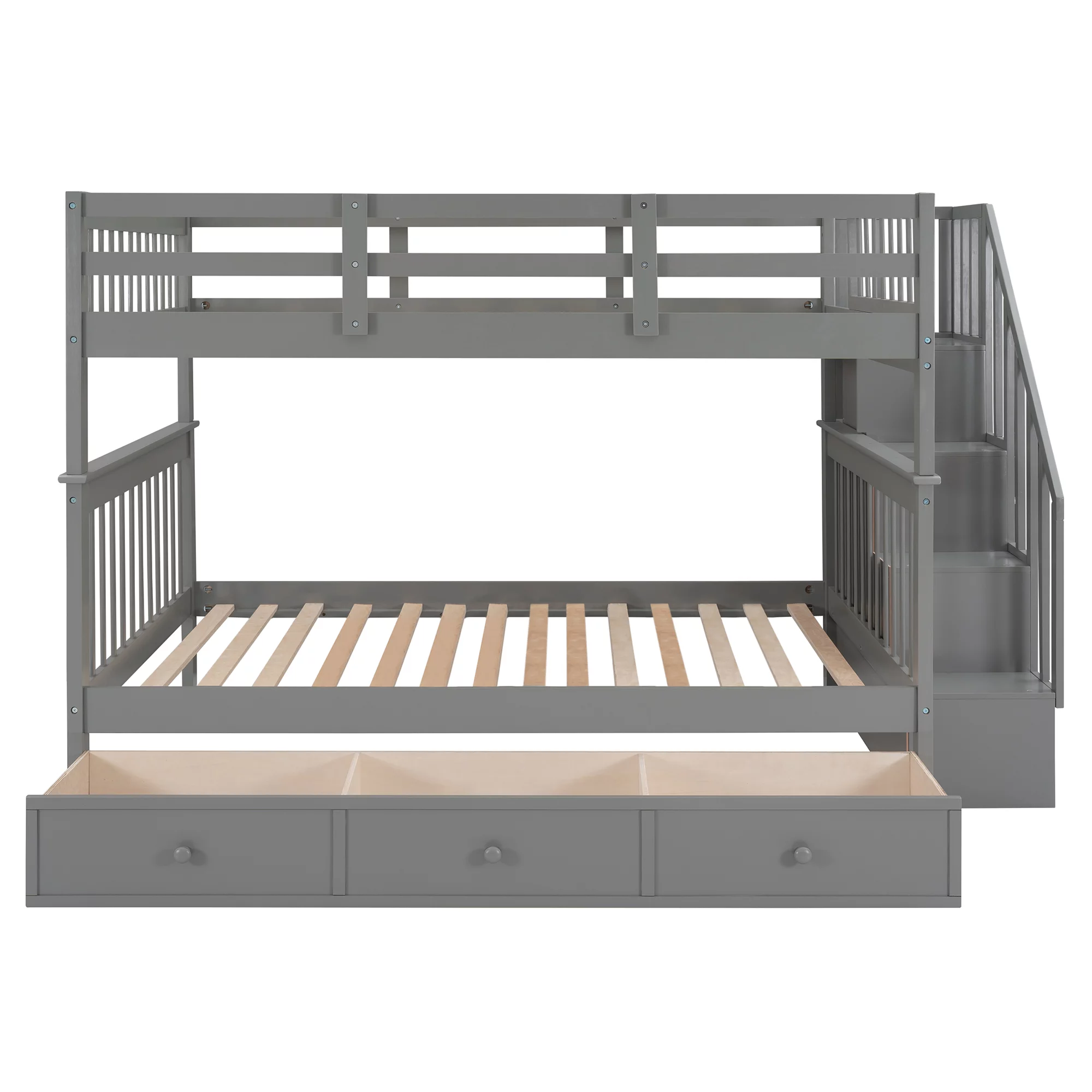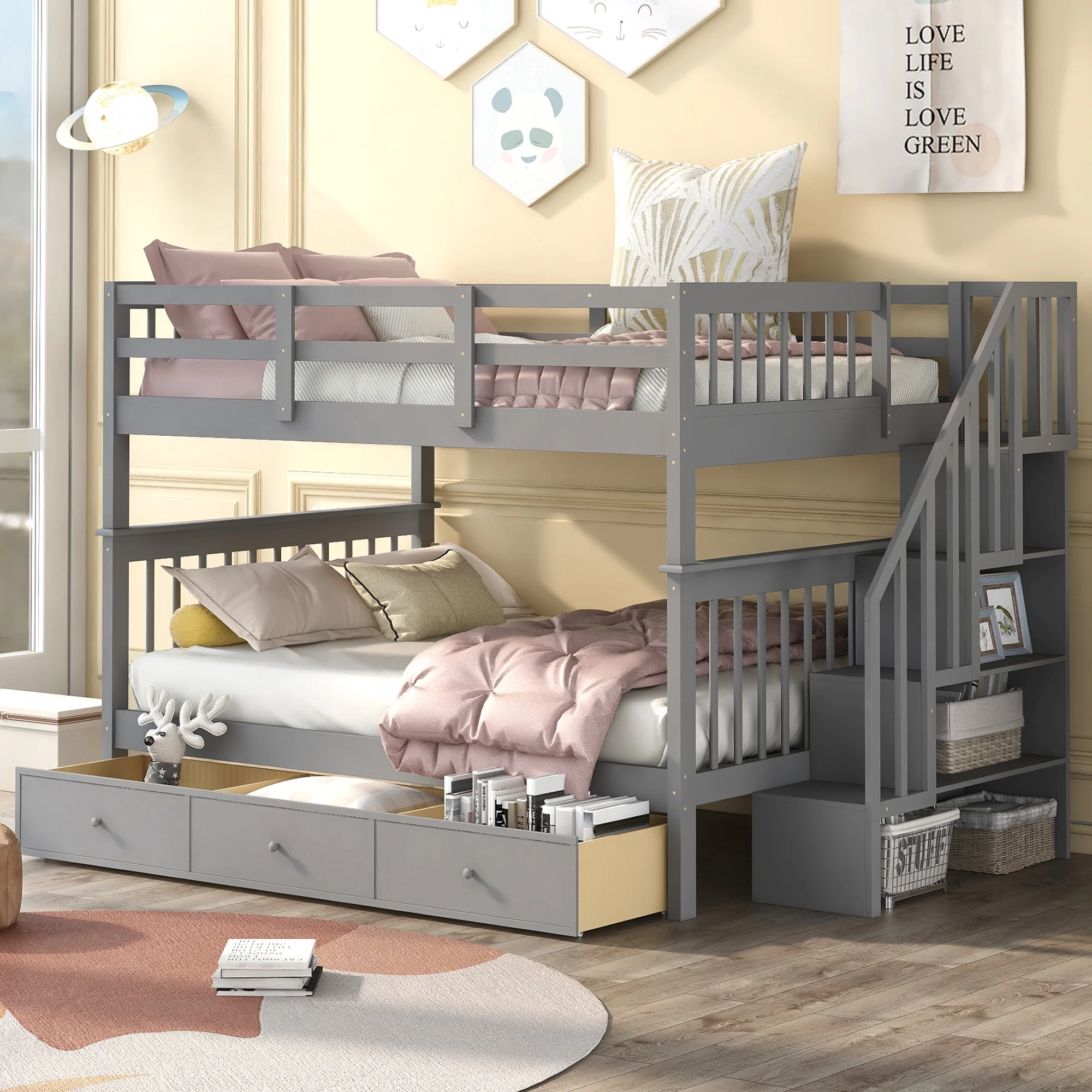 Gray Stairway Full-Over-Full Bunk Bed with Drawer, Storage and Guard Rail for Bedroom