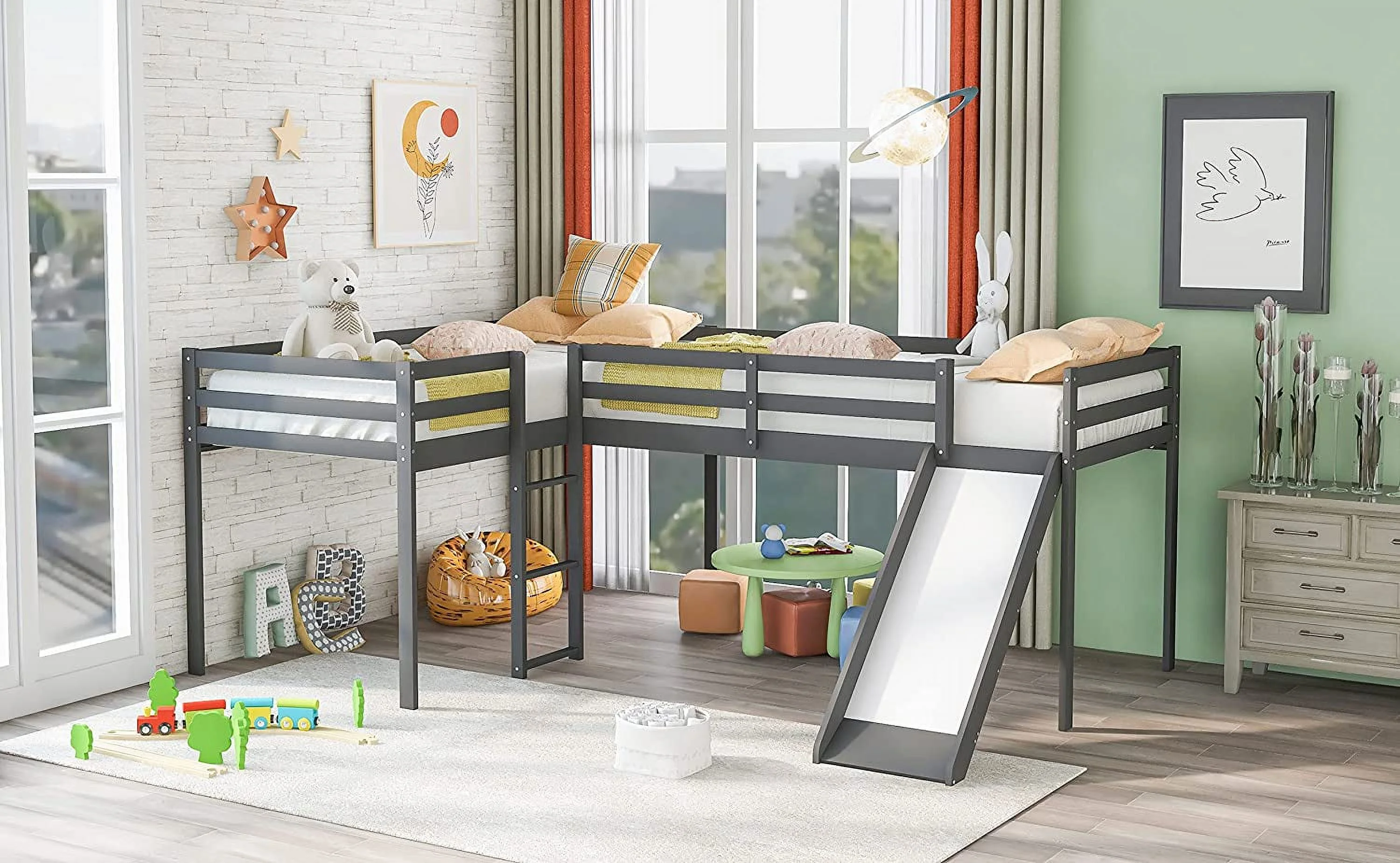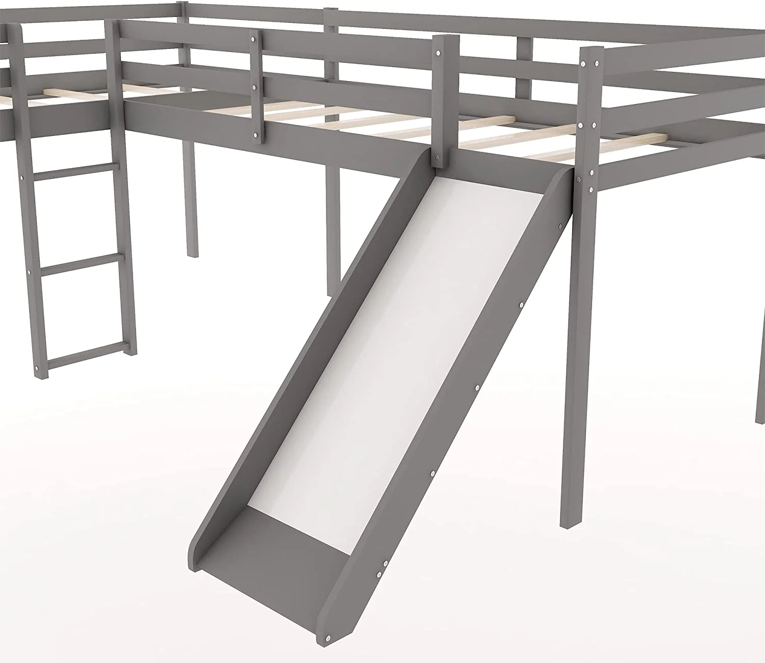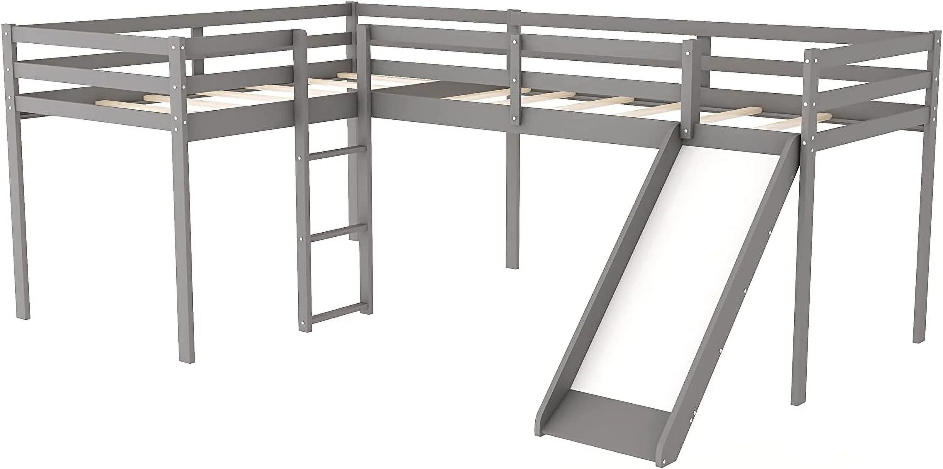 Loft Beds With Slide, Loft Bed Frame Corner Bunk Bed For 2 Kids, Wood Gray Loft Bed For Girls Boys Teens