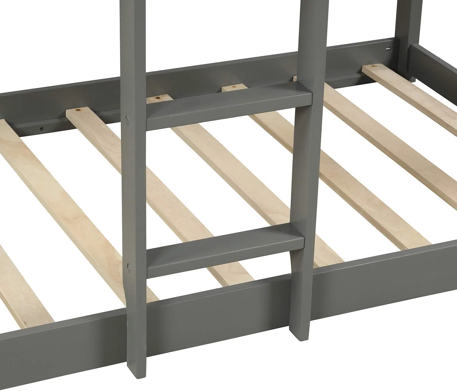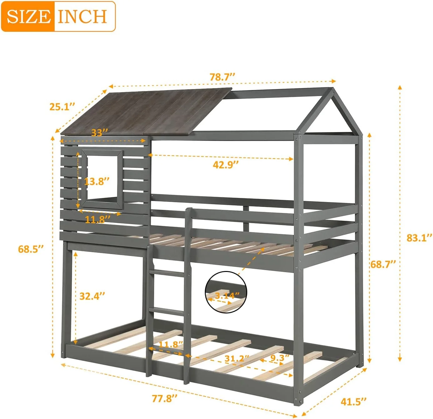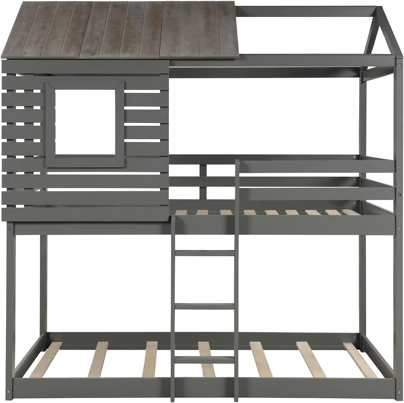 Dcenta Twin Over Twin Bunk Bed Wood Loft Bed with Roof, Window, Guardrail, Ladder (Gray)