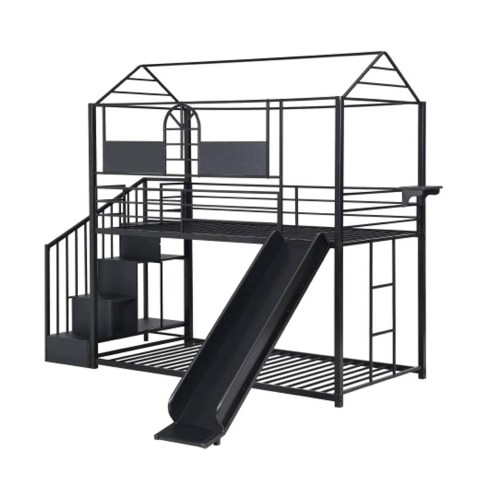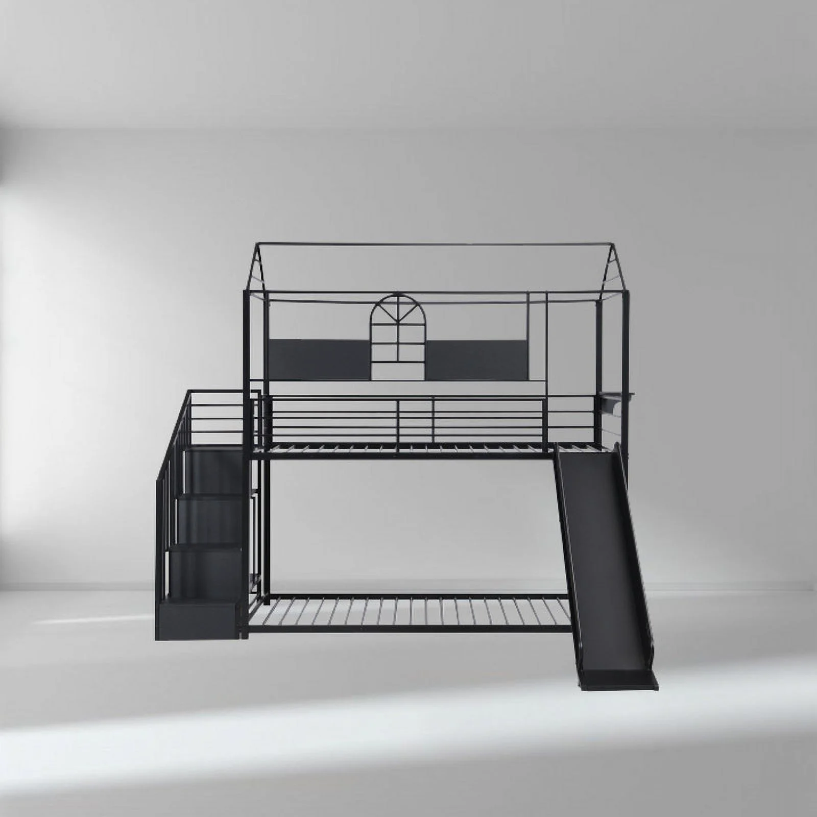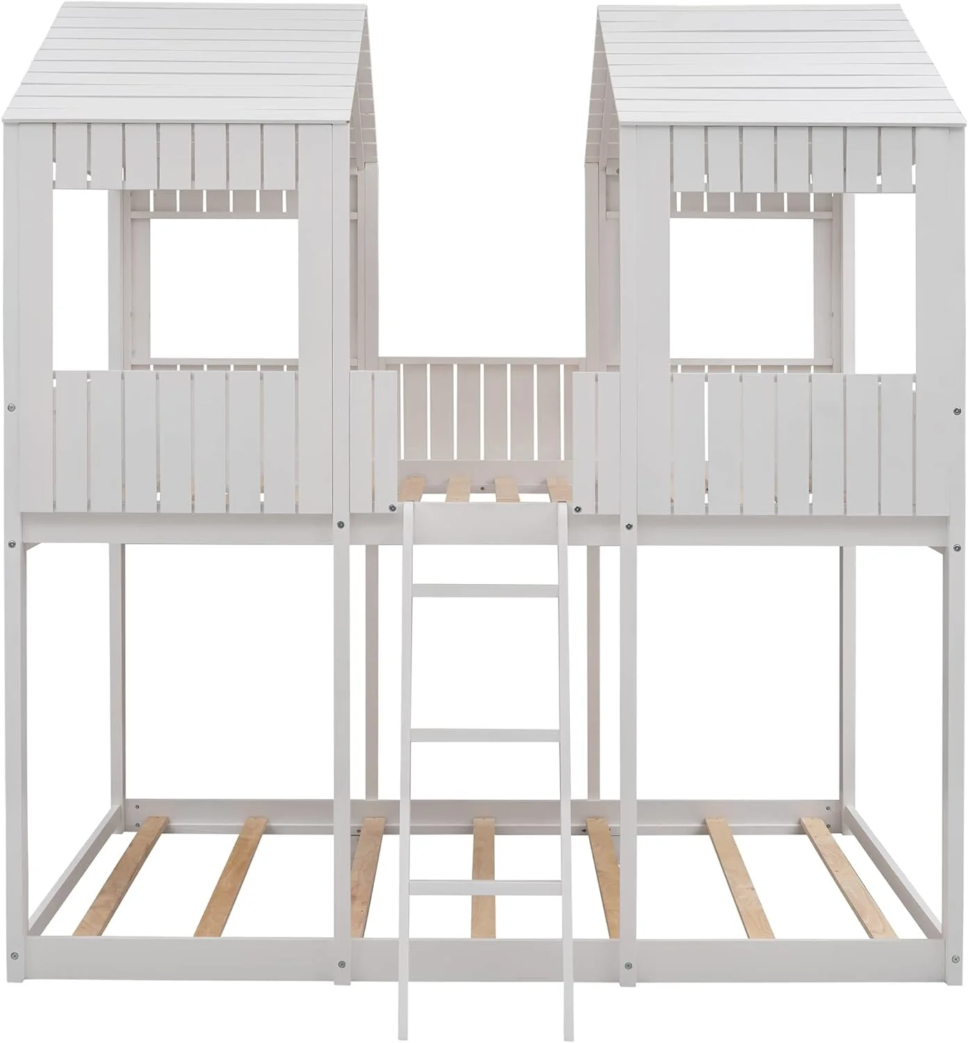 Dcenta Twin Over Twin Bunk Bed Wood Loft Bed with Roof, Window, Guardrail, Ladder (Gray)
