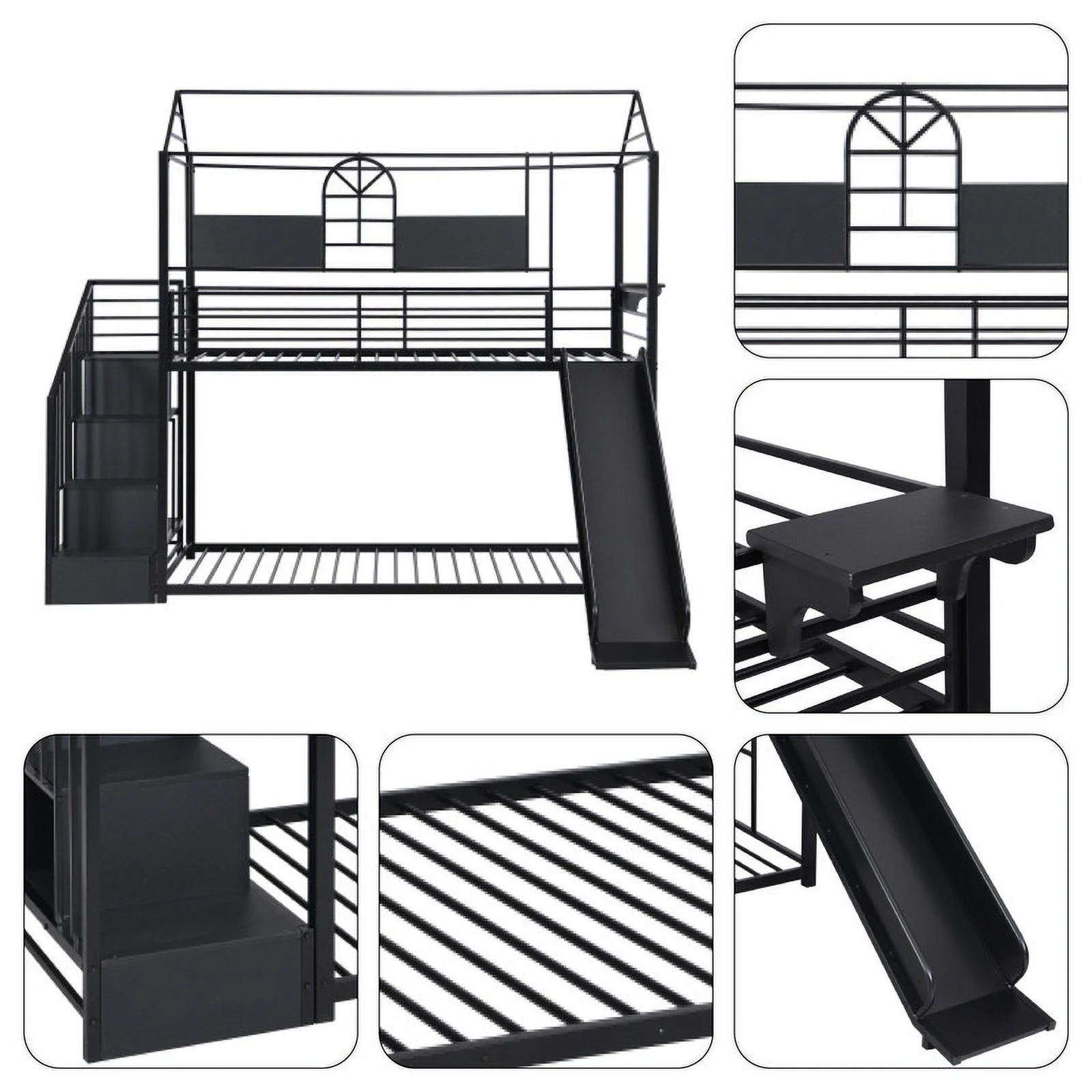 Dcenta Twin over Full Bunk Bed with Twin Size Loft Bed with Desk and Slide,Full-Length Guardrail, White