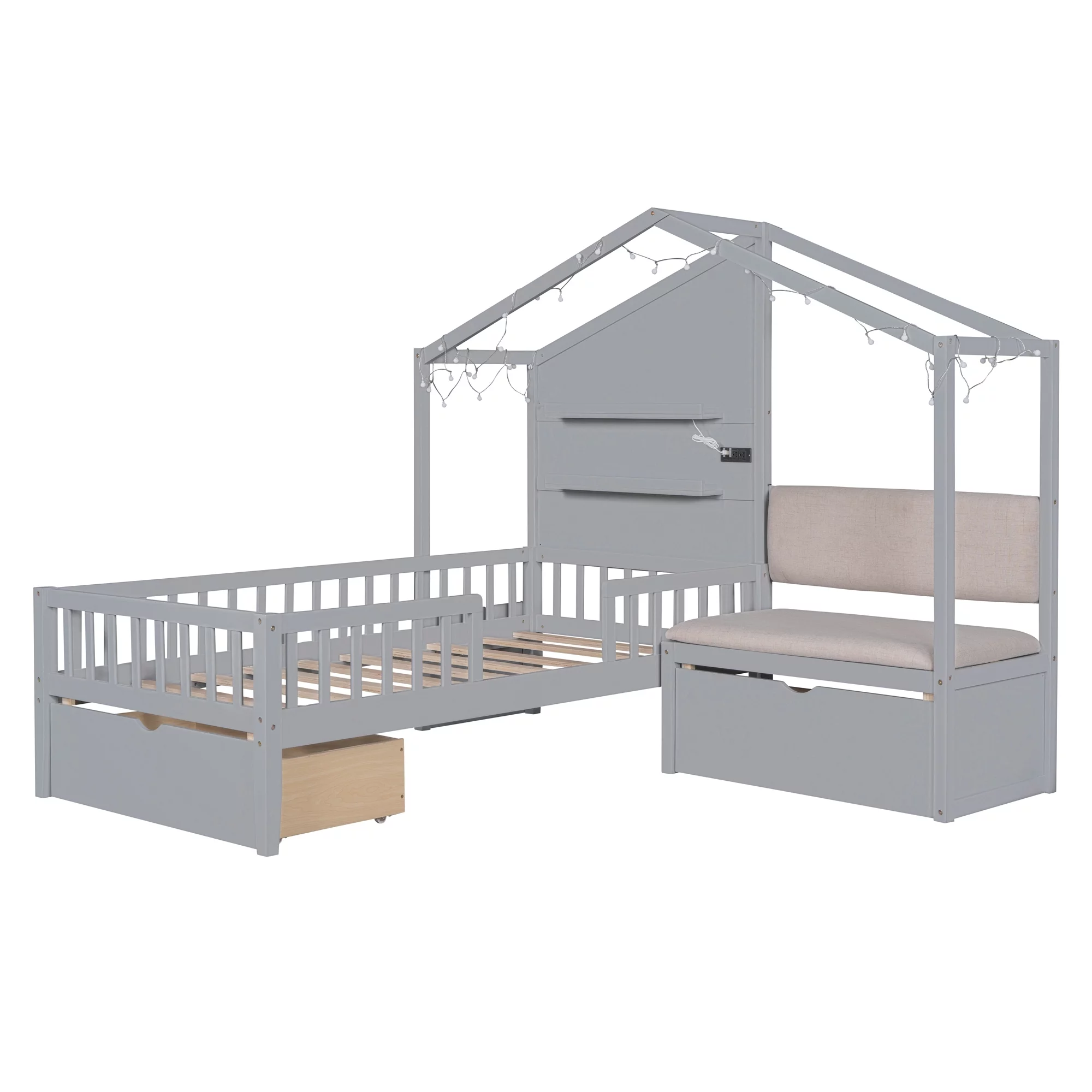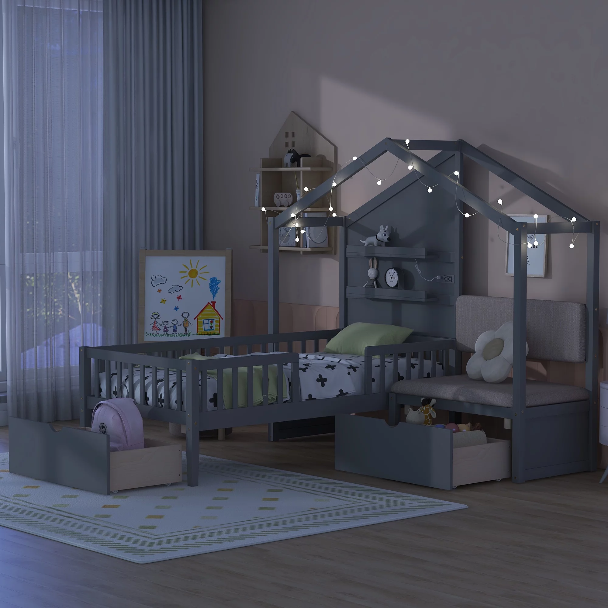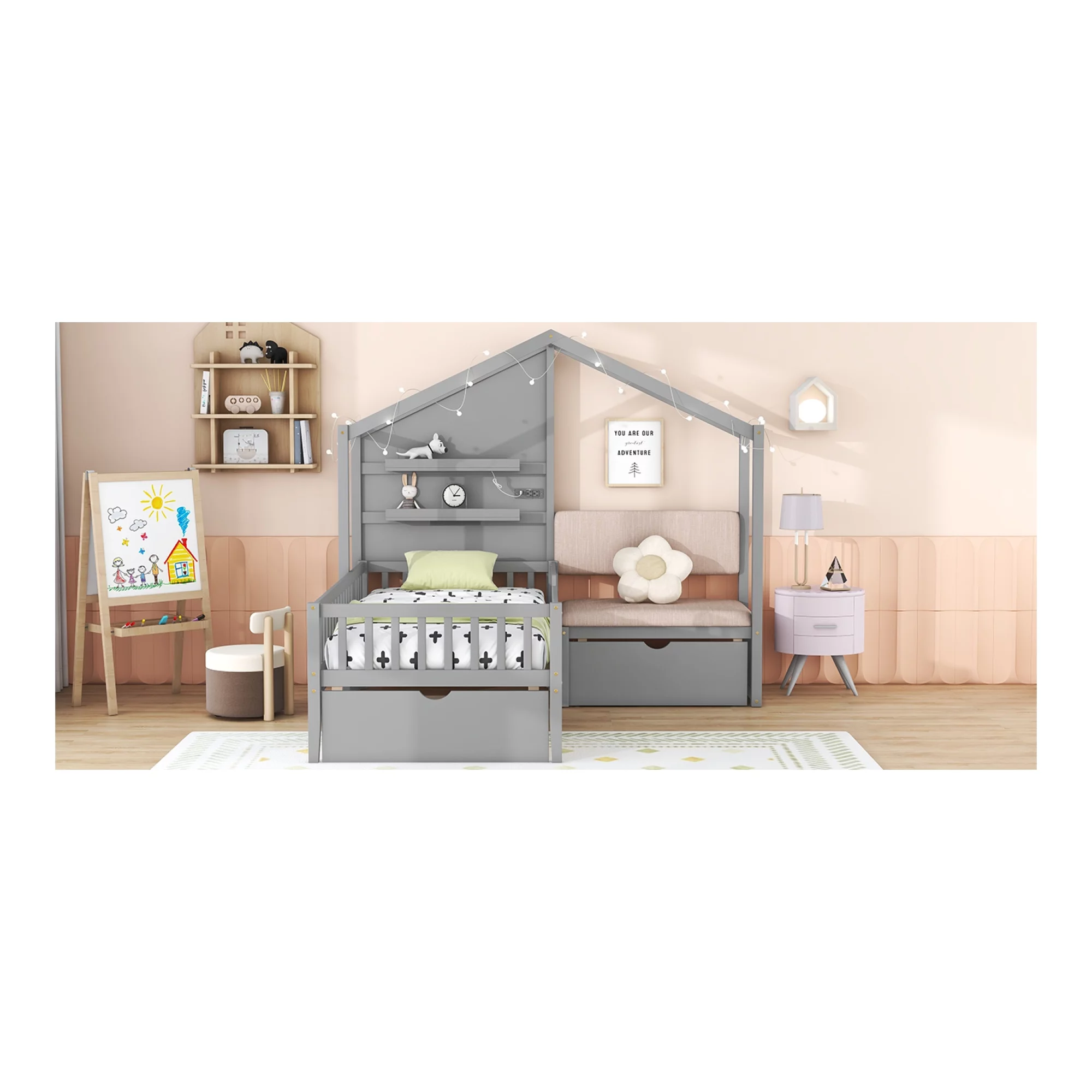 Twin Size House Bed with Upholstered Sofa, House Bed with Charging Station, Wireless Charging, Shelves and Two Drawers, Gray