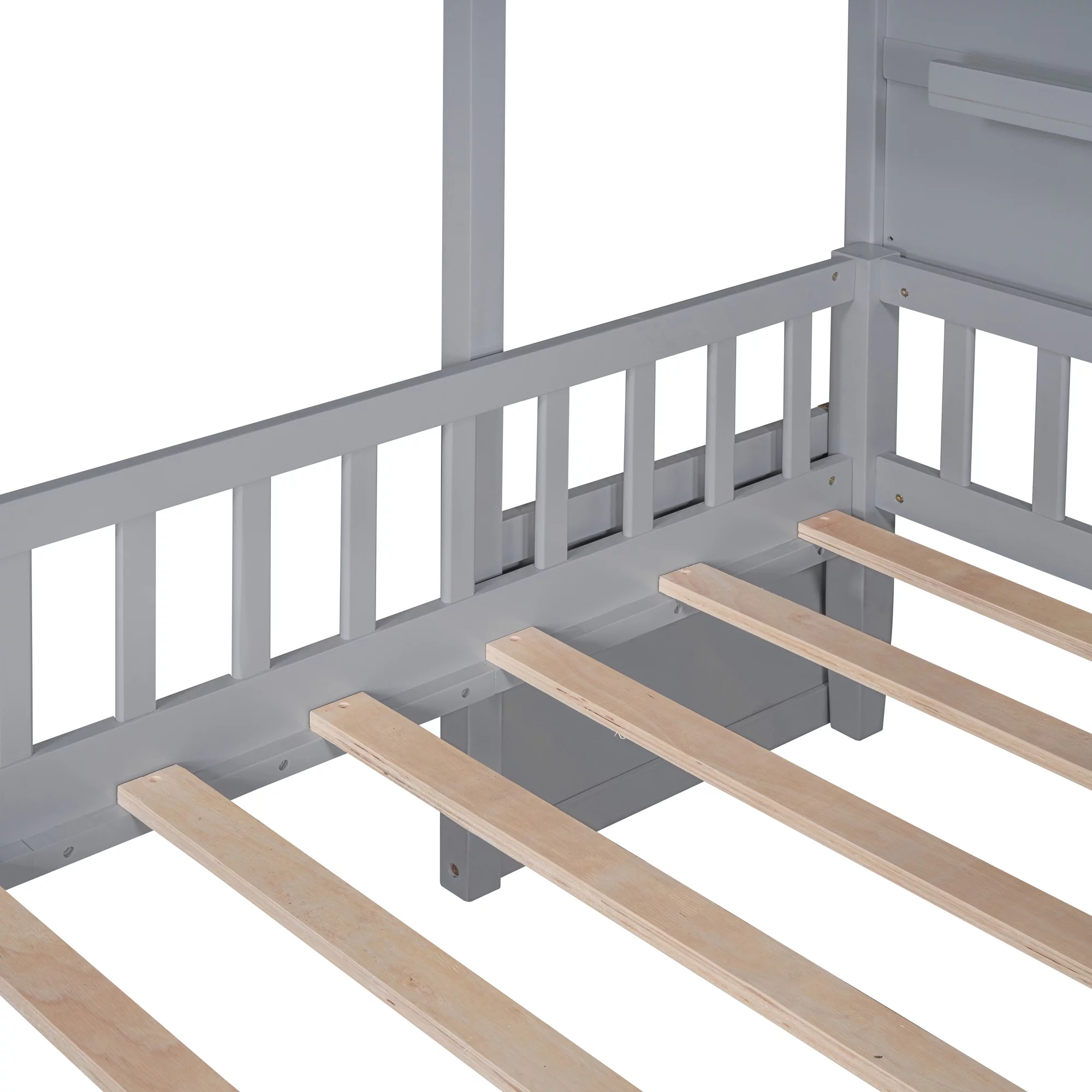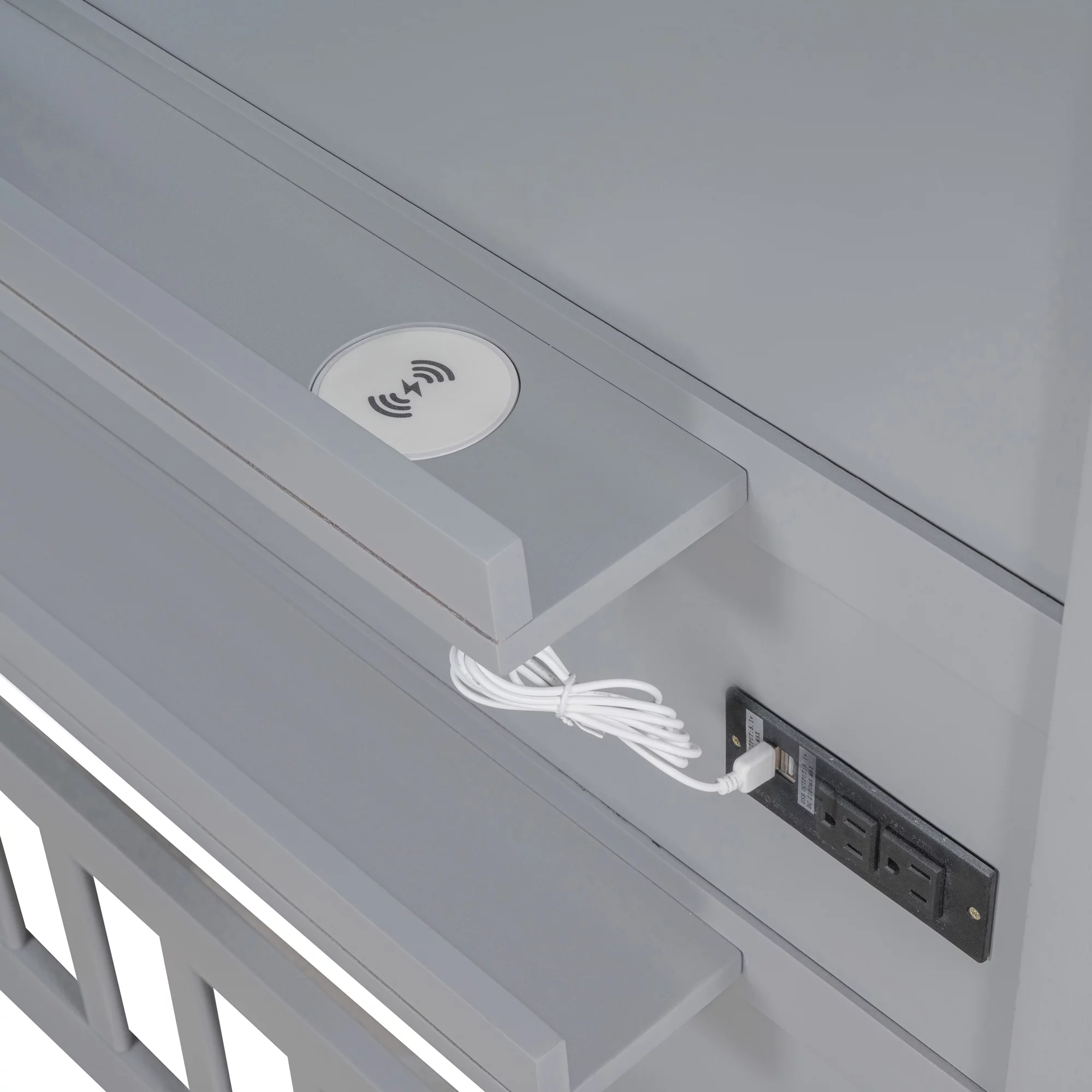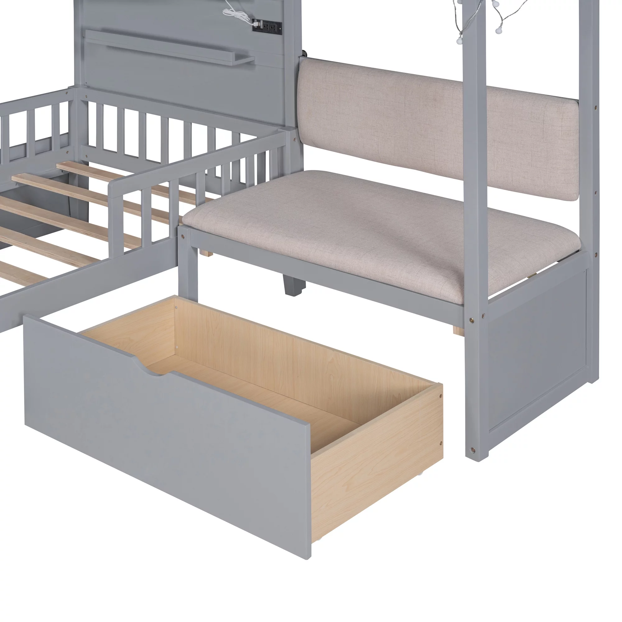 Twin Size House Bed with Upholstered Sofa, House Bed with Charging Station, Wireless Charging, Shelves and Two Drawers, Gray