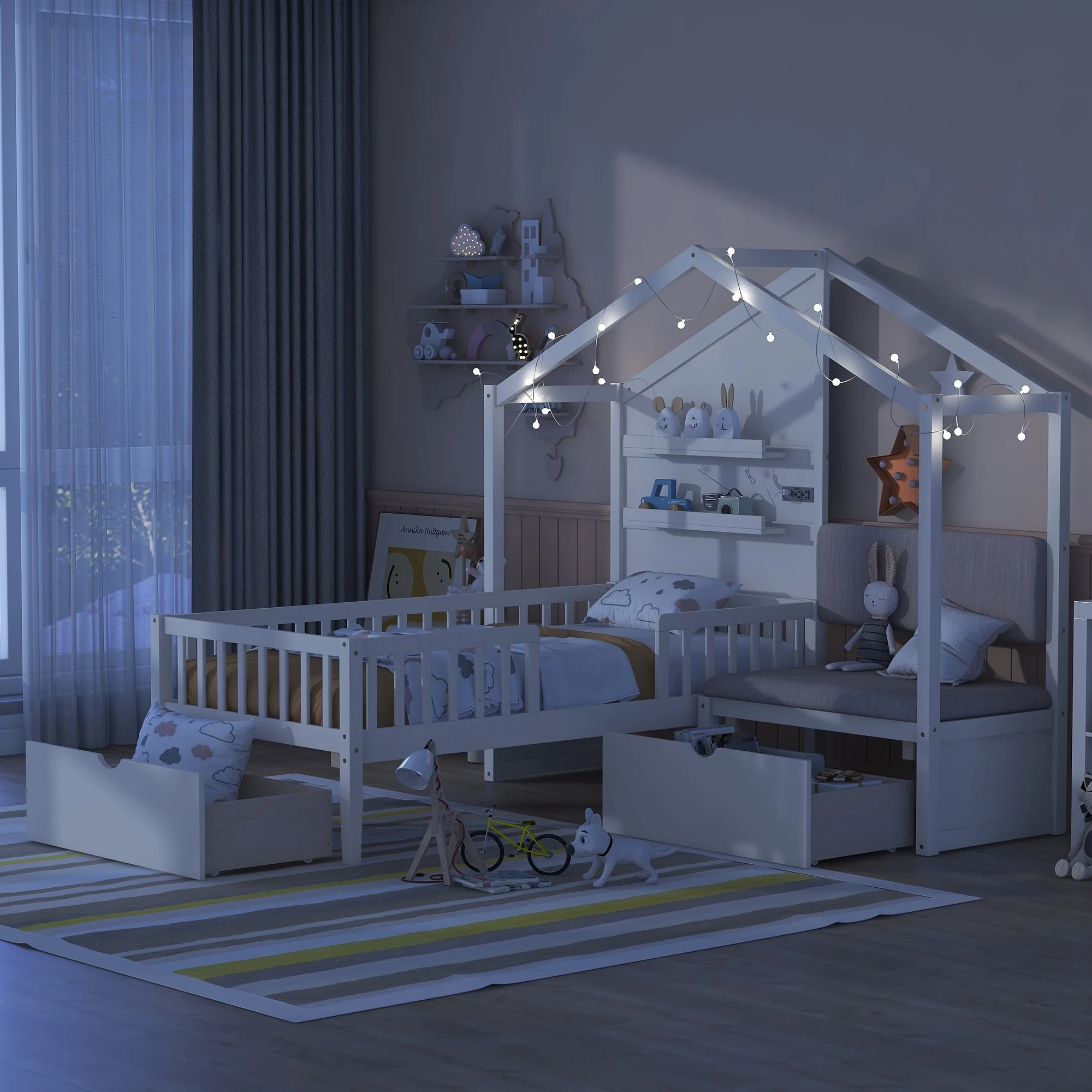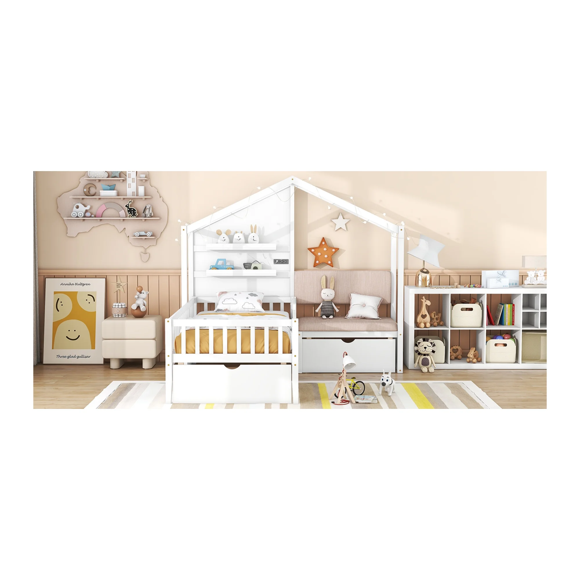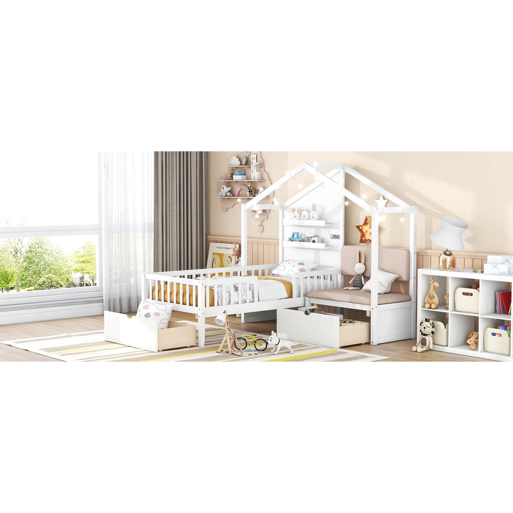 Twin Size House Bed with Upholstered Sofa, House Bed with Charging Station, Wireless Charging, Shelves and Two Drawers, White