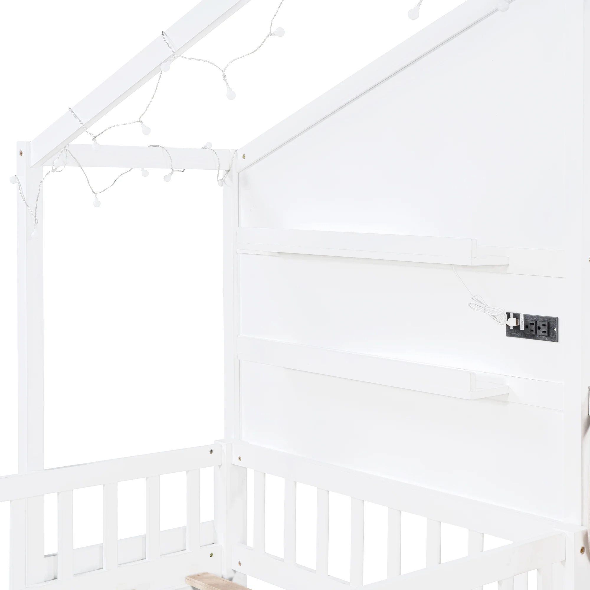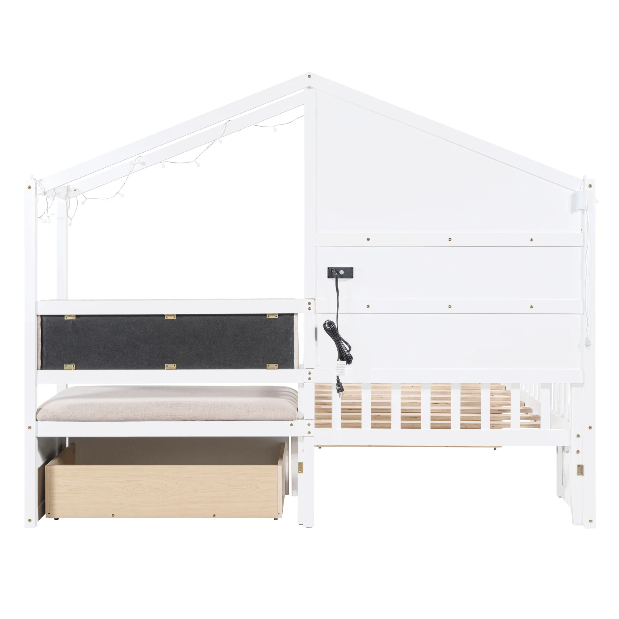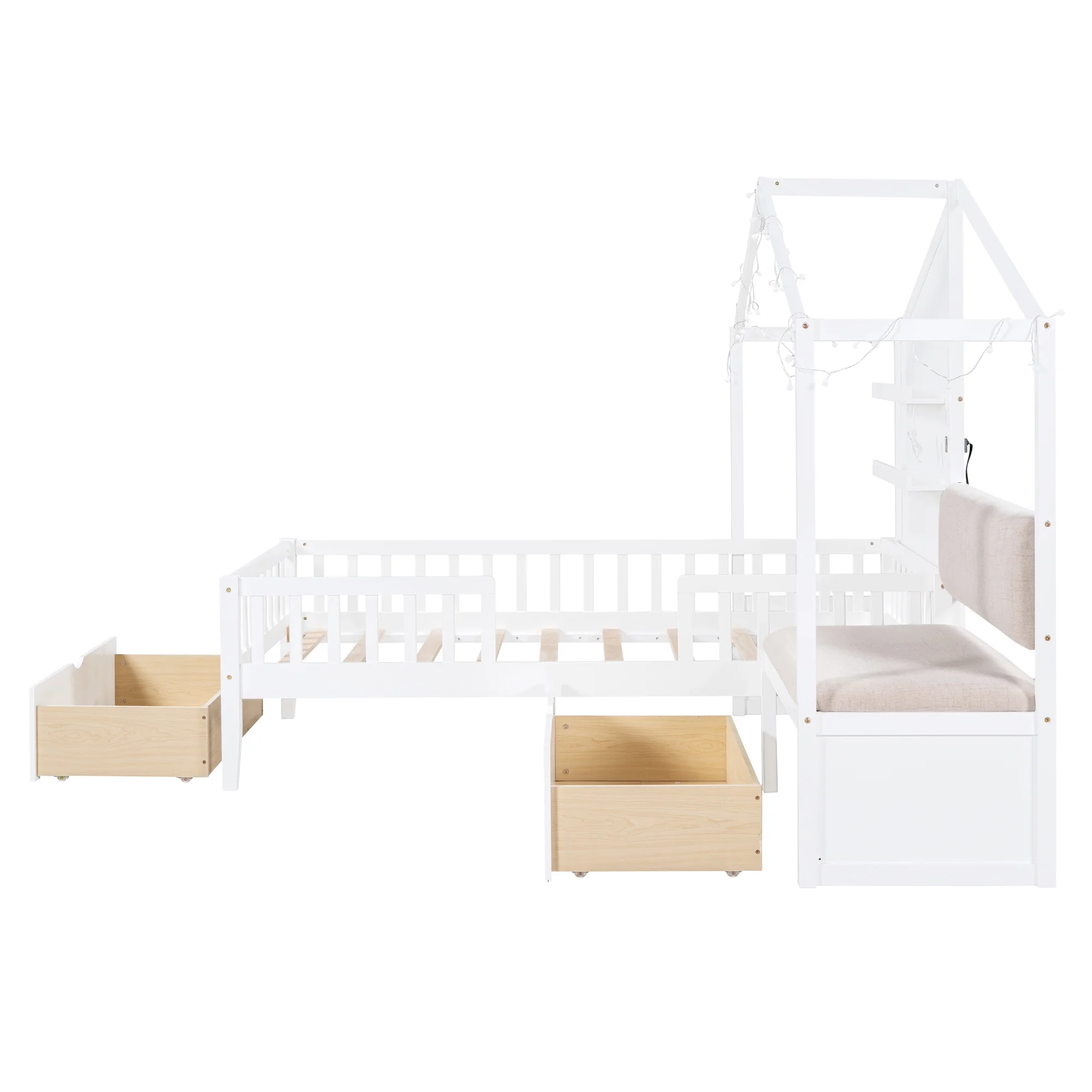 Twin Size House Bed with Upholstered Sofa, House Bed with Charging Station, Wireless Charging, Shelves and Two Drawers, White