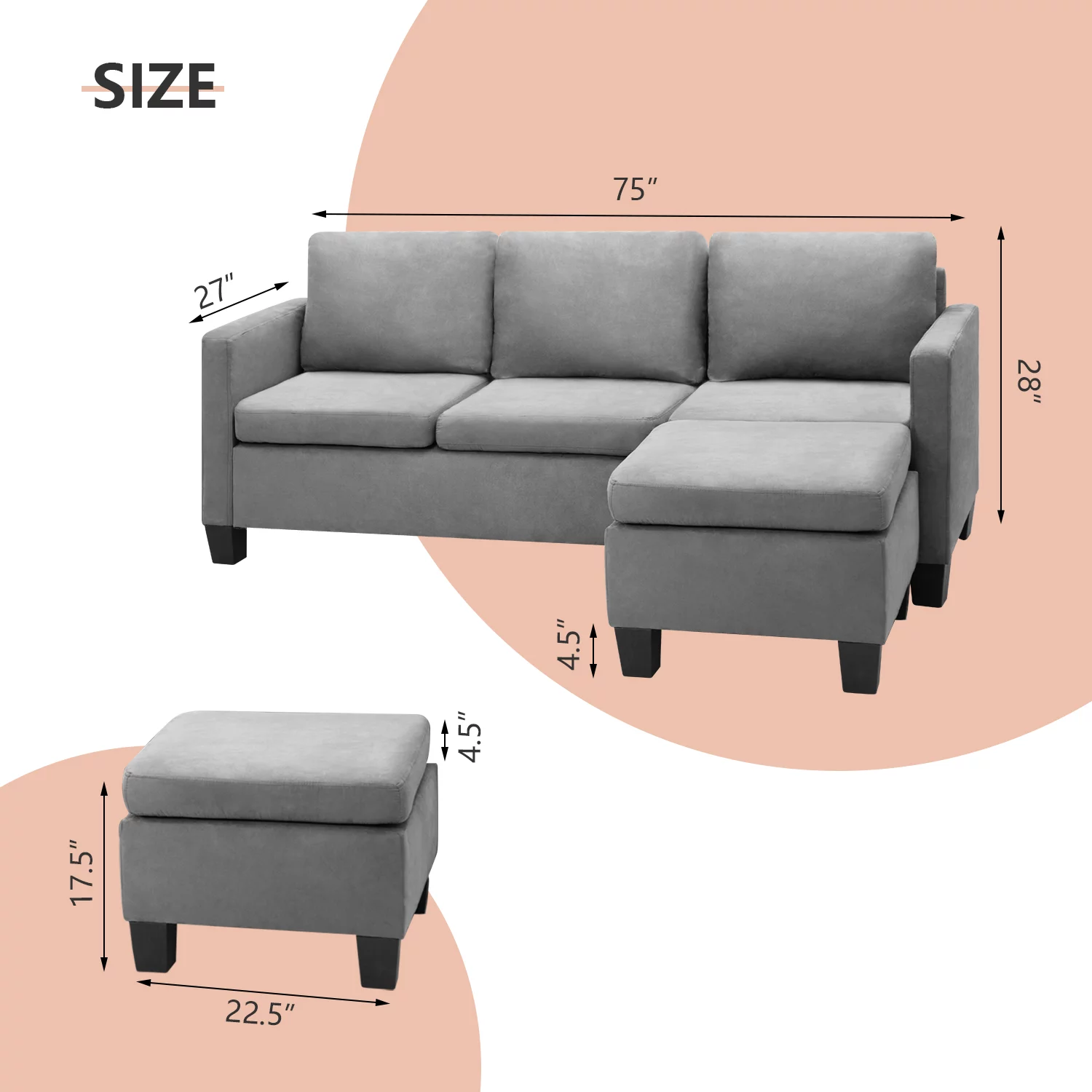 Aukfa Modern Sectional Sofa, 78" 3 Seater Couch with Storage Ottoman for Living Room, Gray