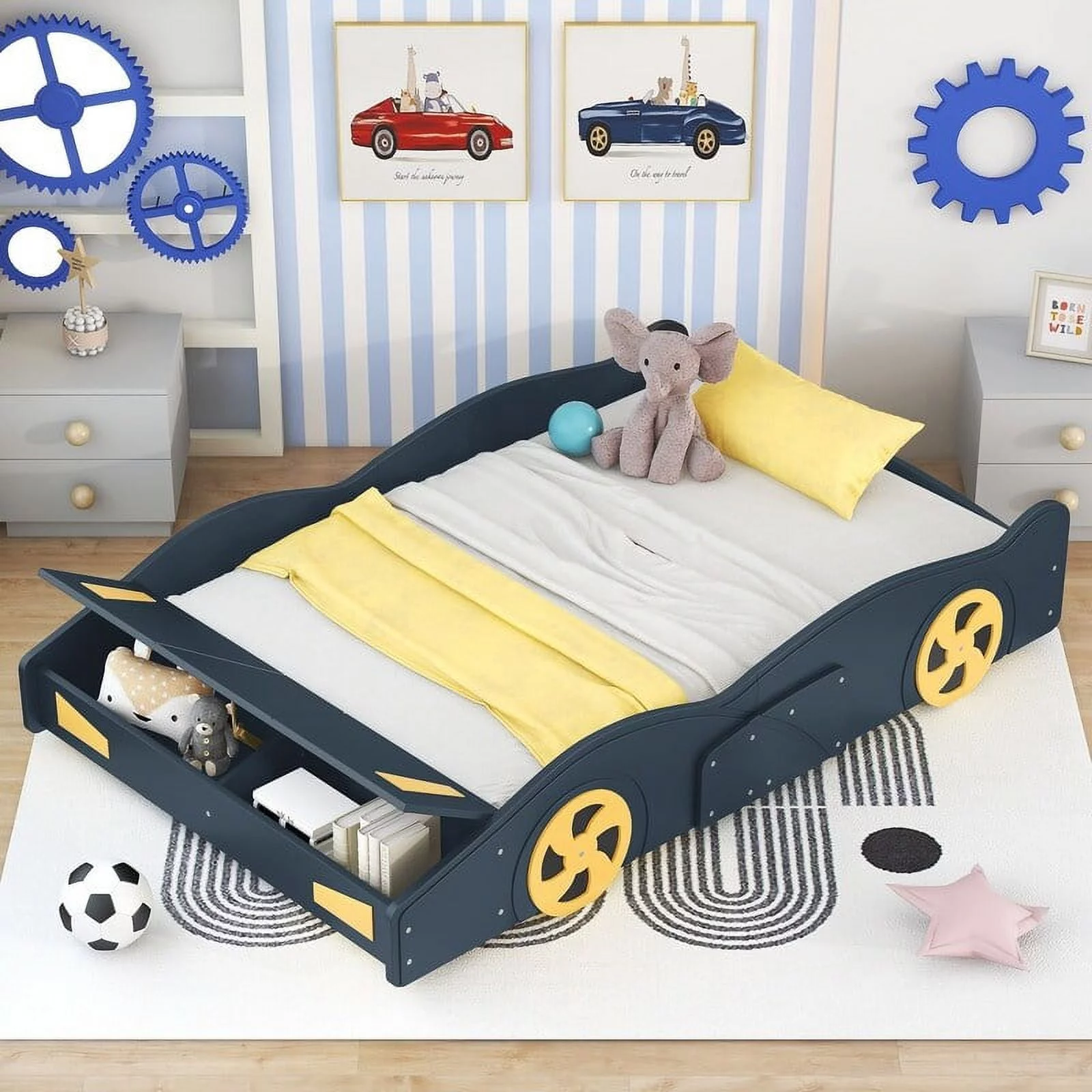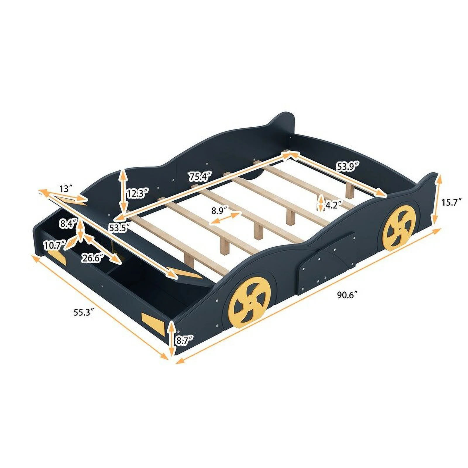 Car Shaped Full-Size Platform Bed Frame Bed with Wheels and Storage Yellow/Blue