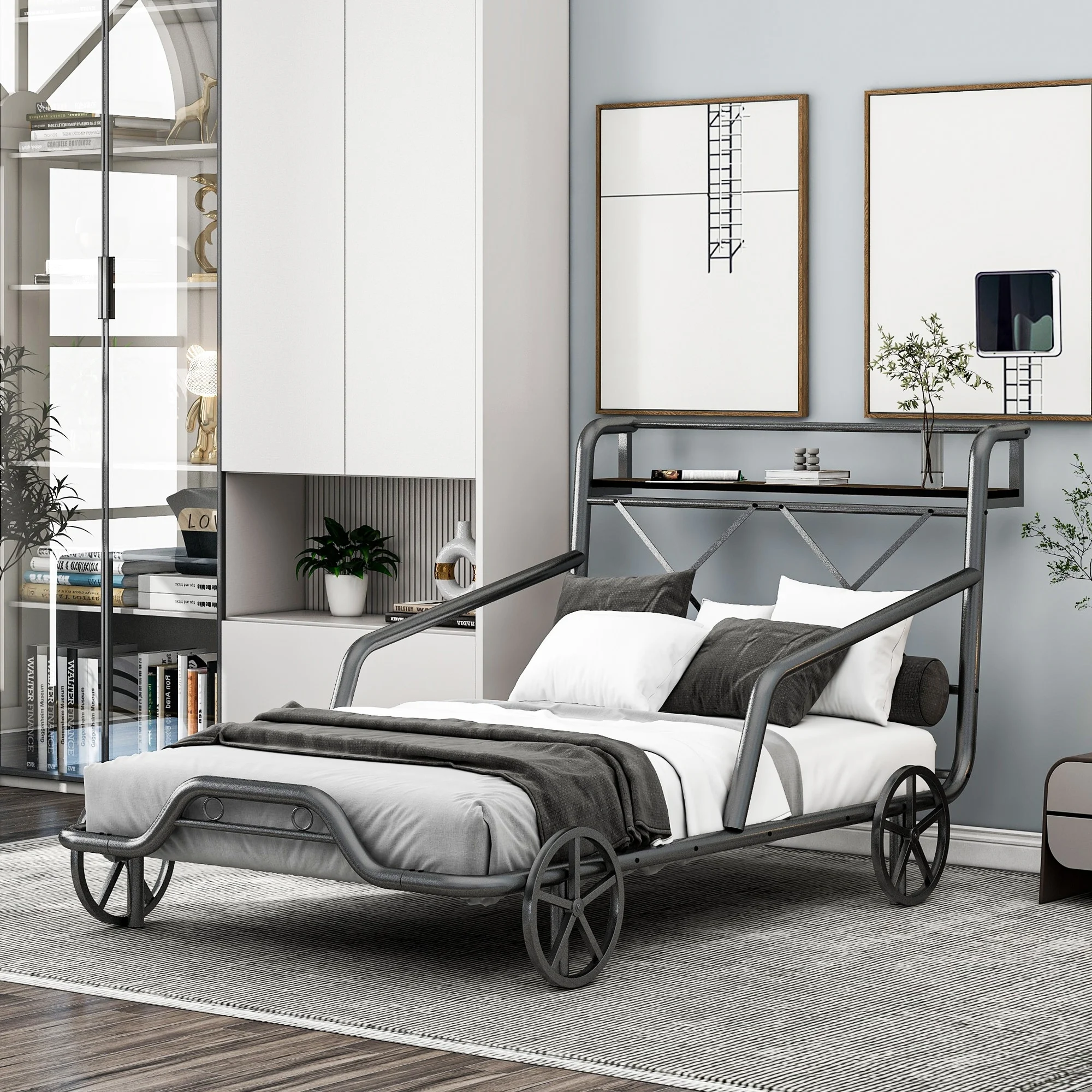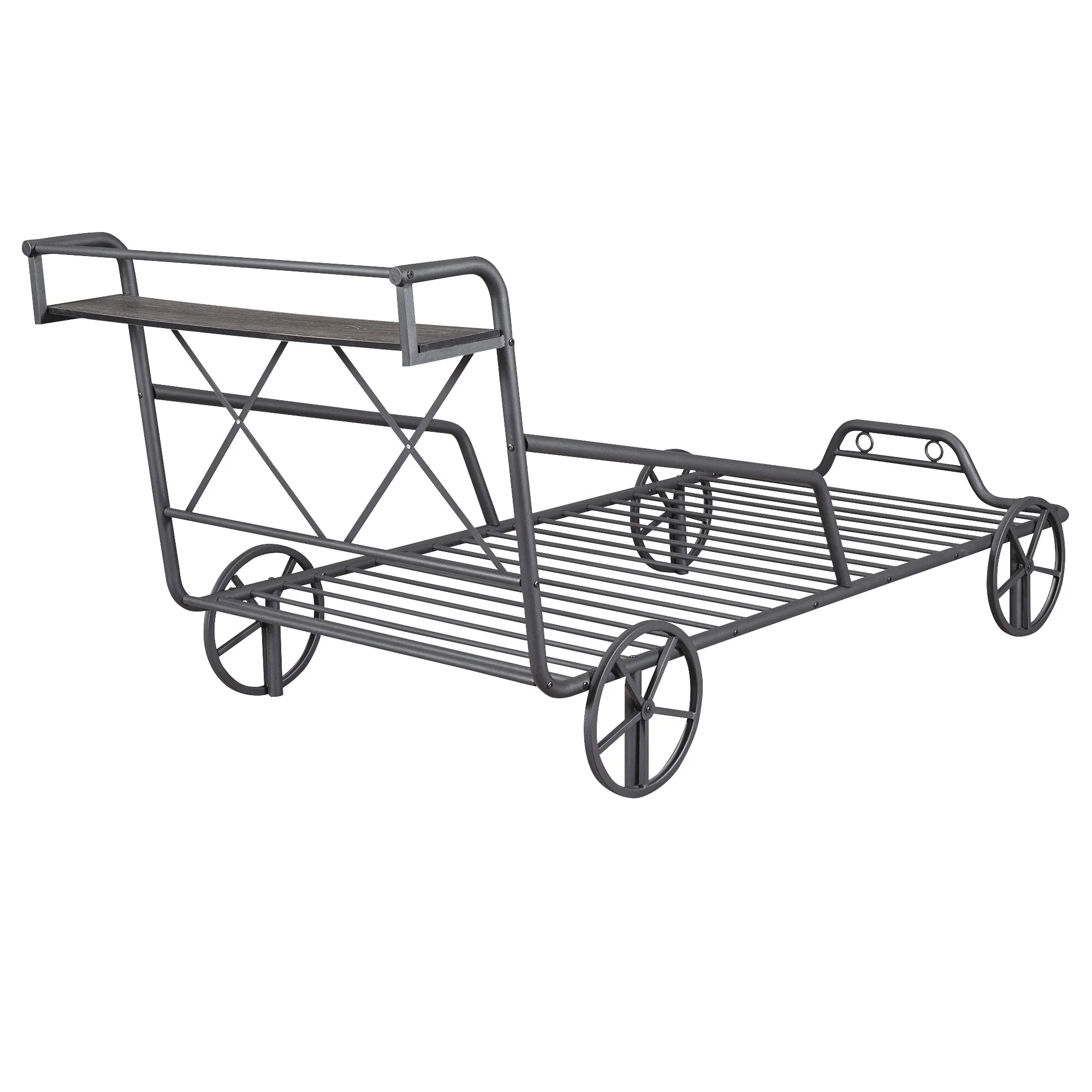 Twin Size Metal Car Bed with 4 Wheels and X-Shaped Frame Shelf Silver - Twin