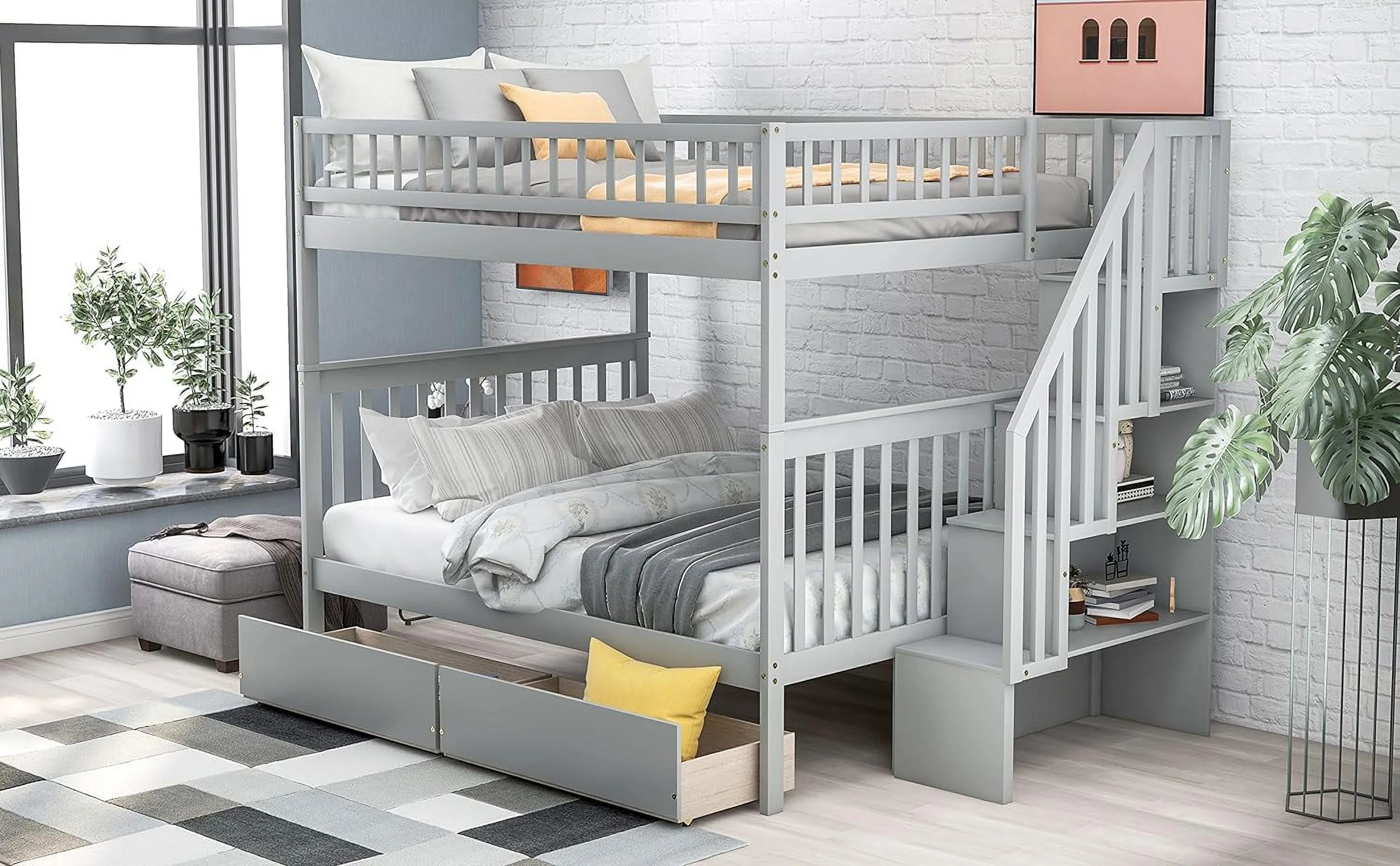 CoSoTower Wooden Twin Over Full Bunk Bed with Six Drawers and Flexible Shelves,Bottom Bed with Wheels,White